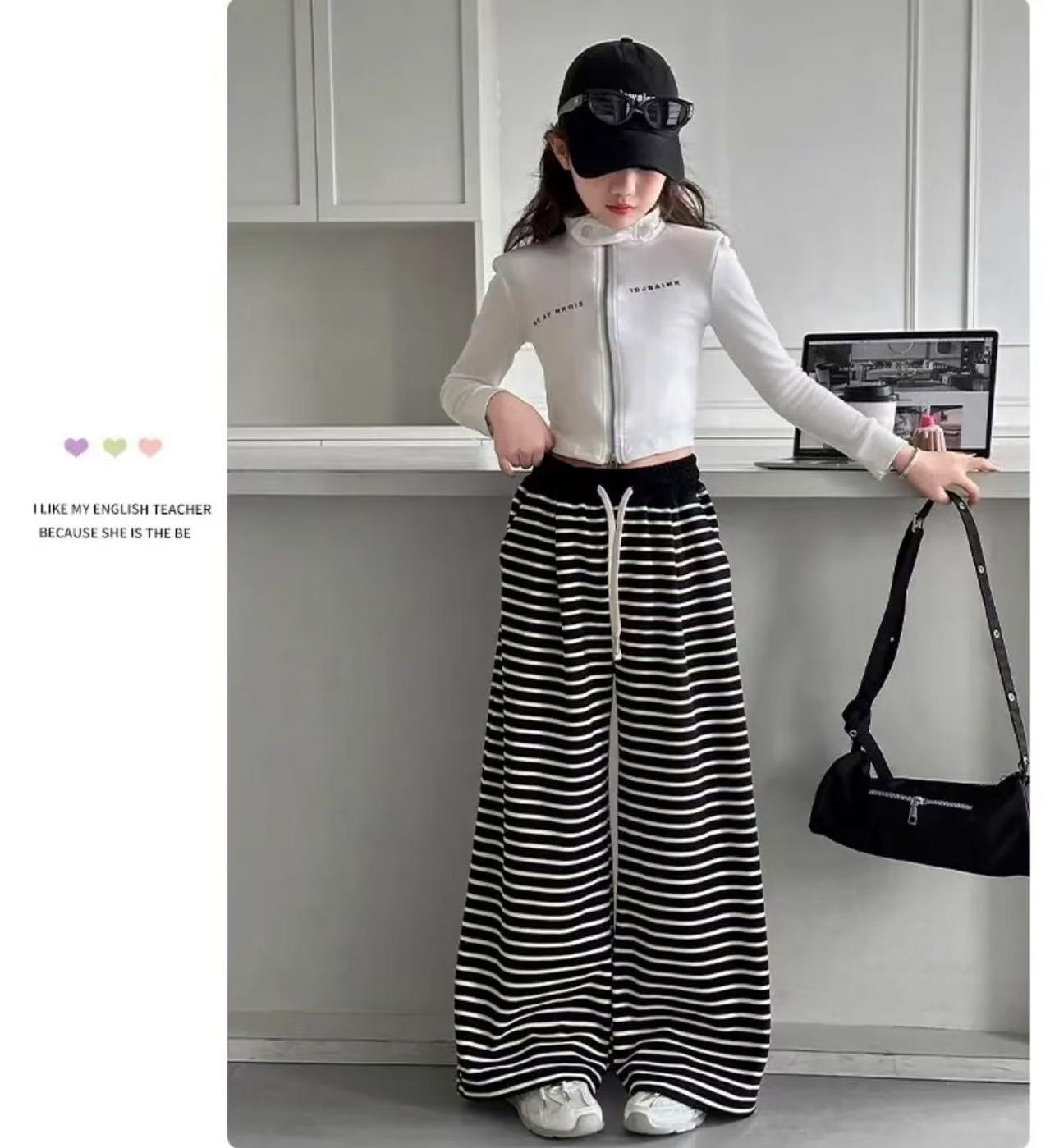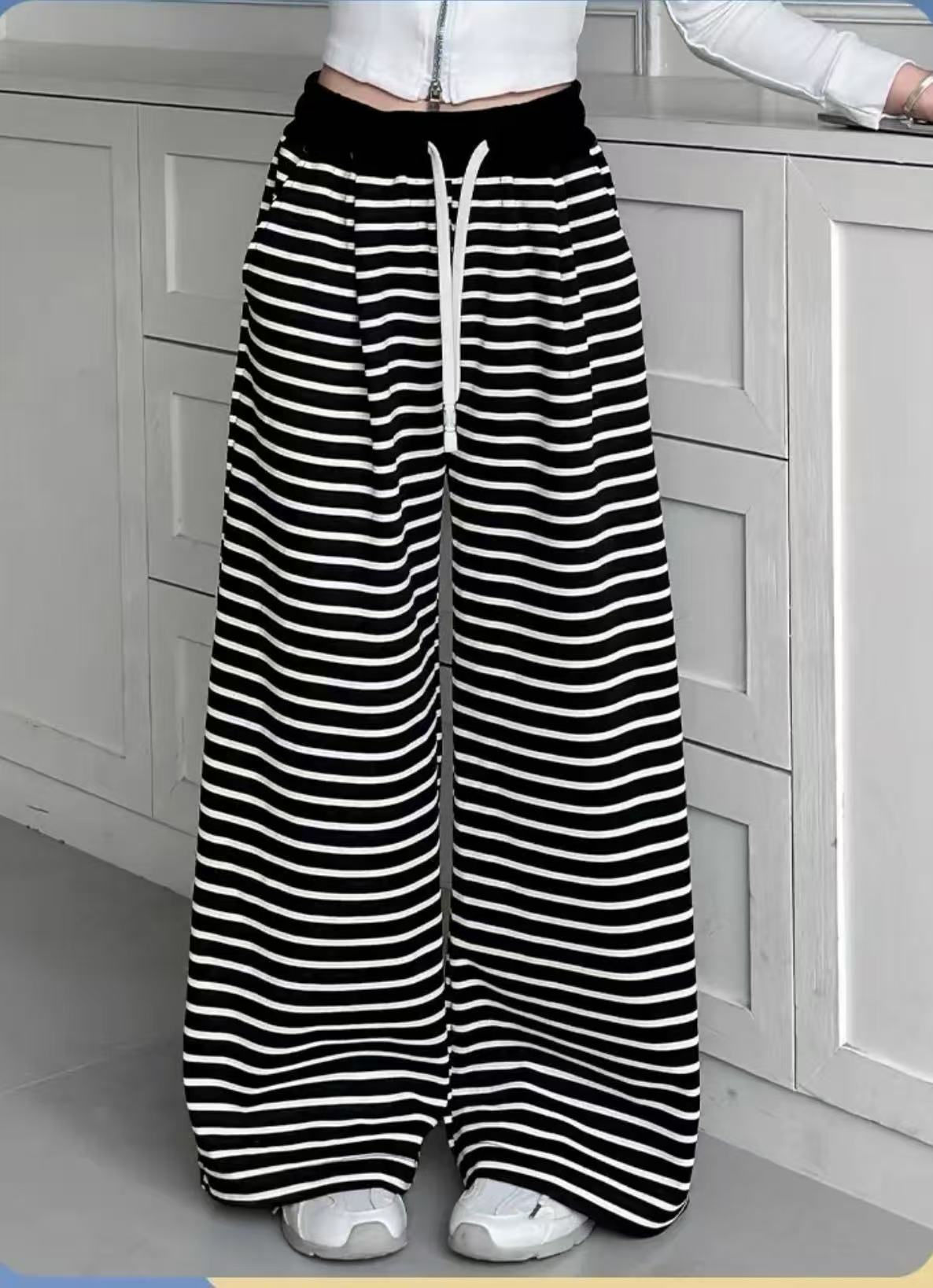 • 흰색 스트라이프 스트레이트 팬츠(드로스트링과 포켓 있음)