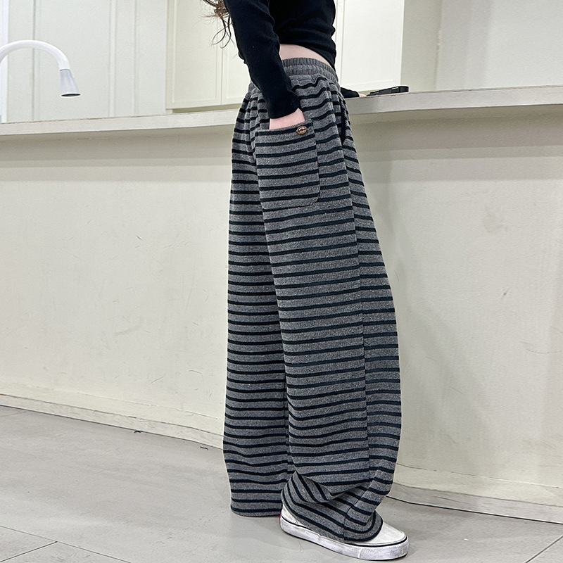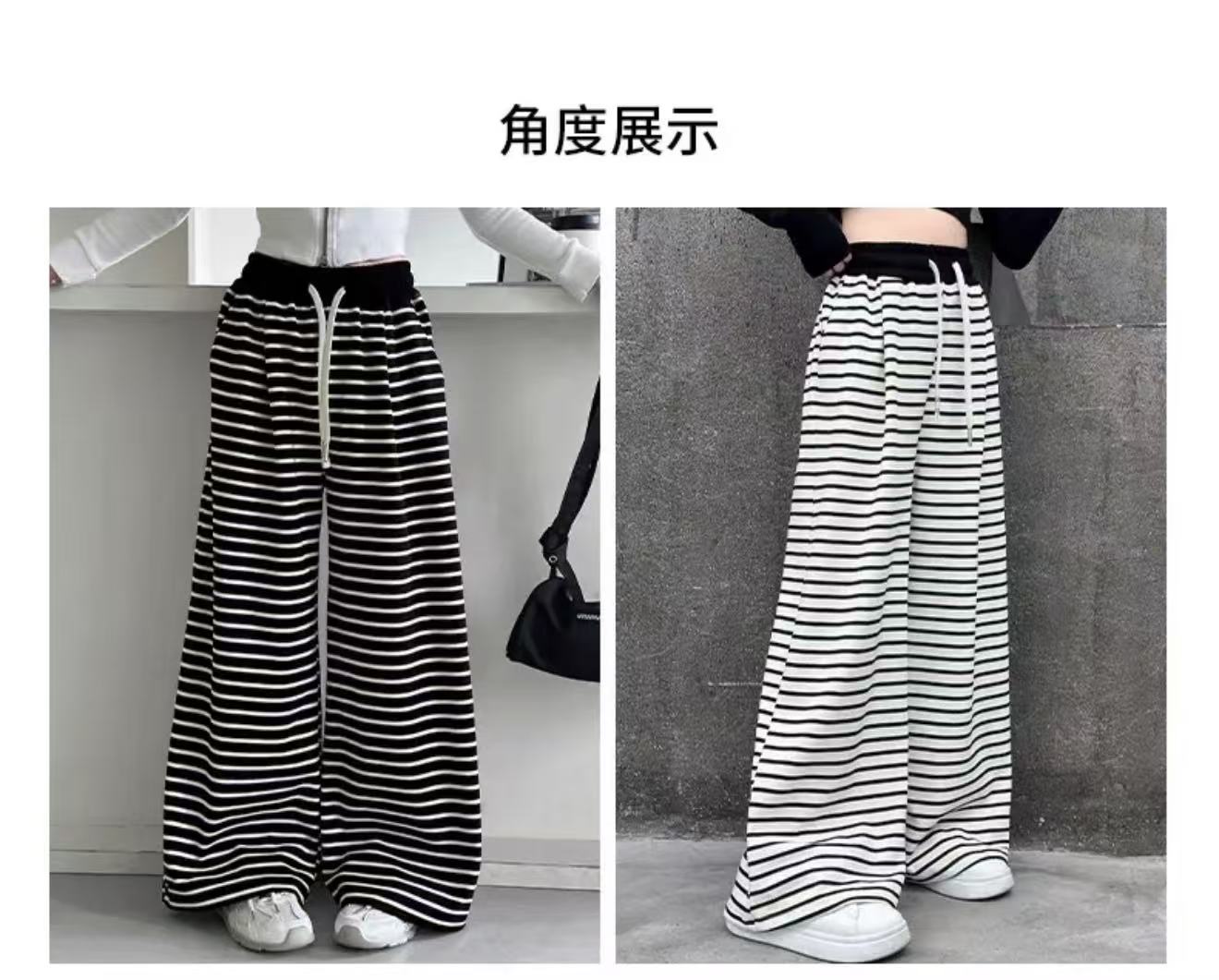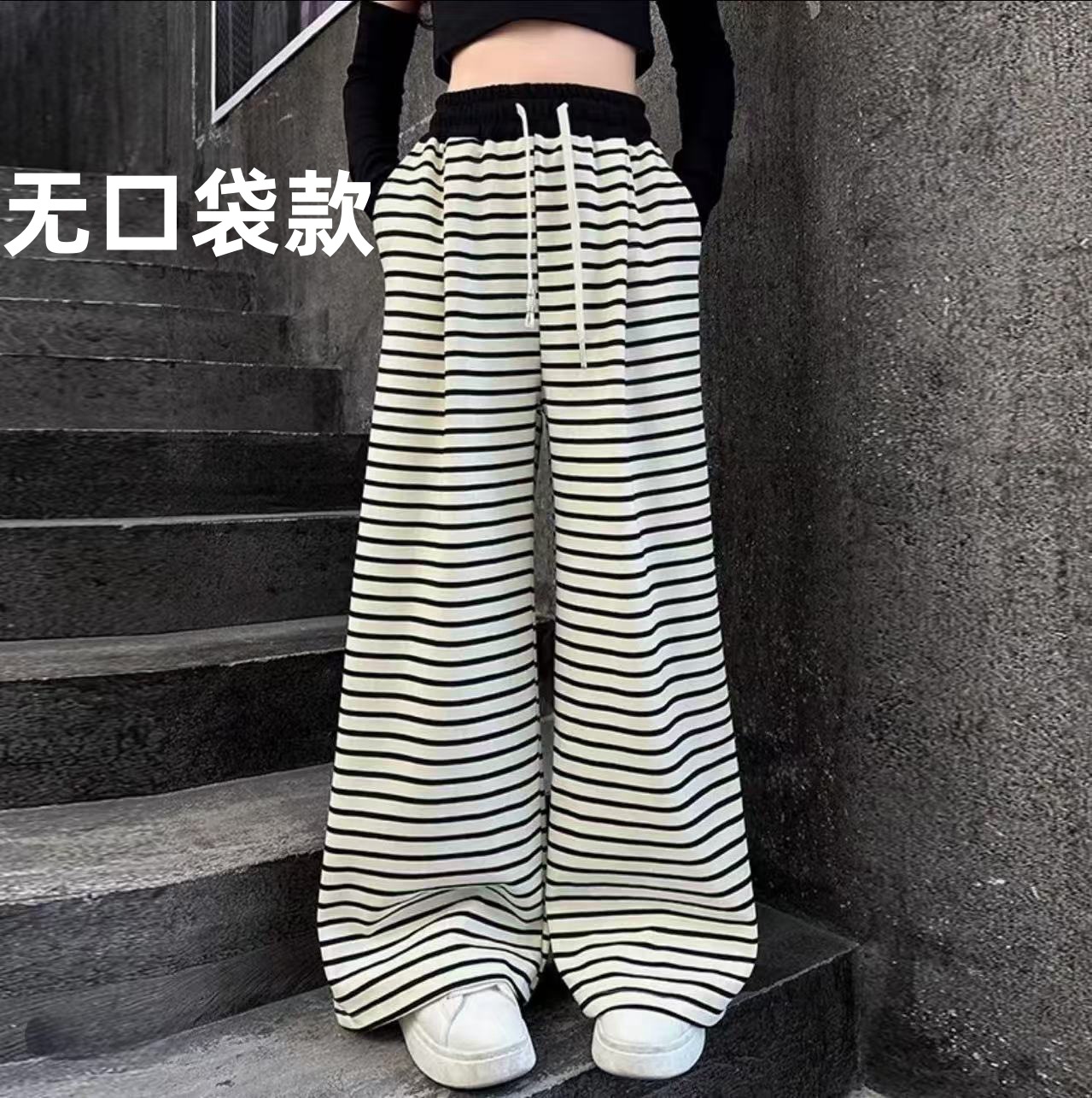 • 스트라이프 스트레이트 팬츠 - 블랙 (드로스트링 없음, 포켓 있음)