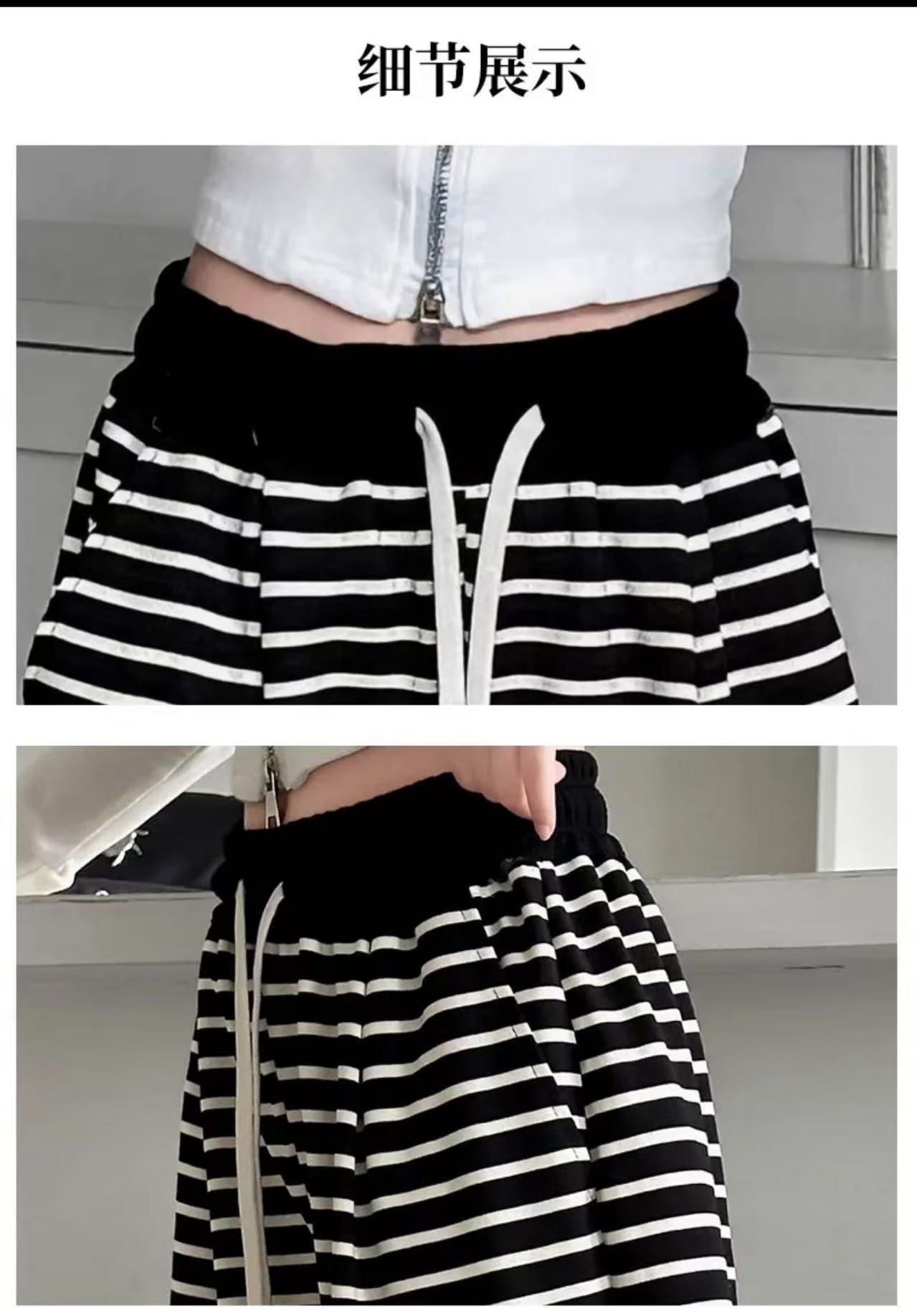 • 스트라이프 스트레이트 팬츠 - 화이트 (드로스트링 없음, 포켓 있음)