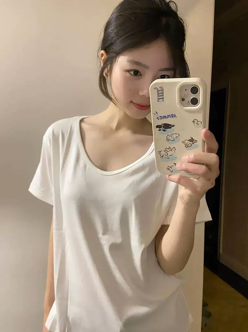 U 칼라 어깨 티셔츠 여자 흰색 반팔 봄과 여름 2025 큰 칼라 느슨한 슬리밍 내부 재킷 간단한 올매치