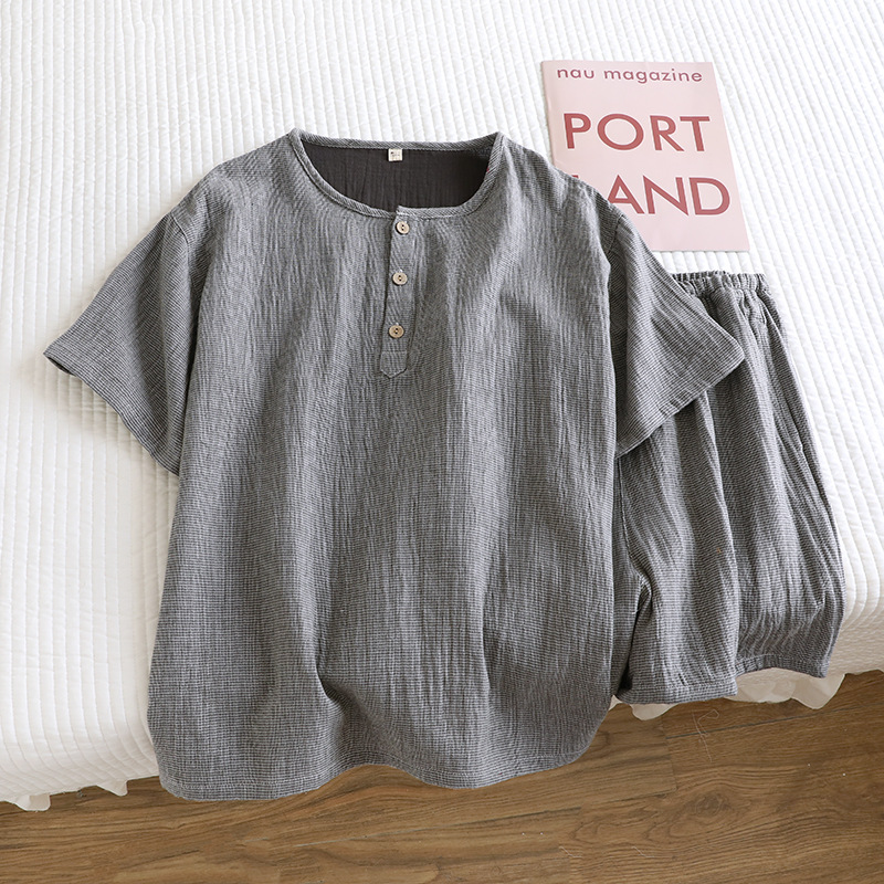 [평야] 커플의 면 2 층 면 원사 여름 홈 의류 세트 반팔 반바지 크루 넥 풀오버 아우터