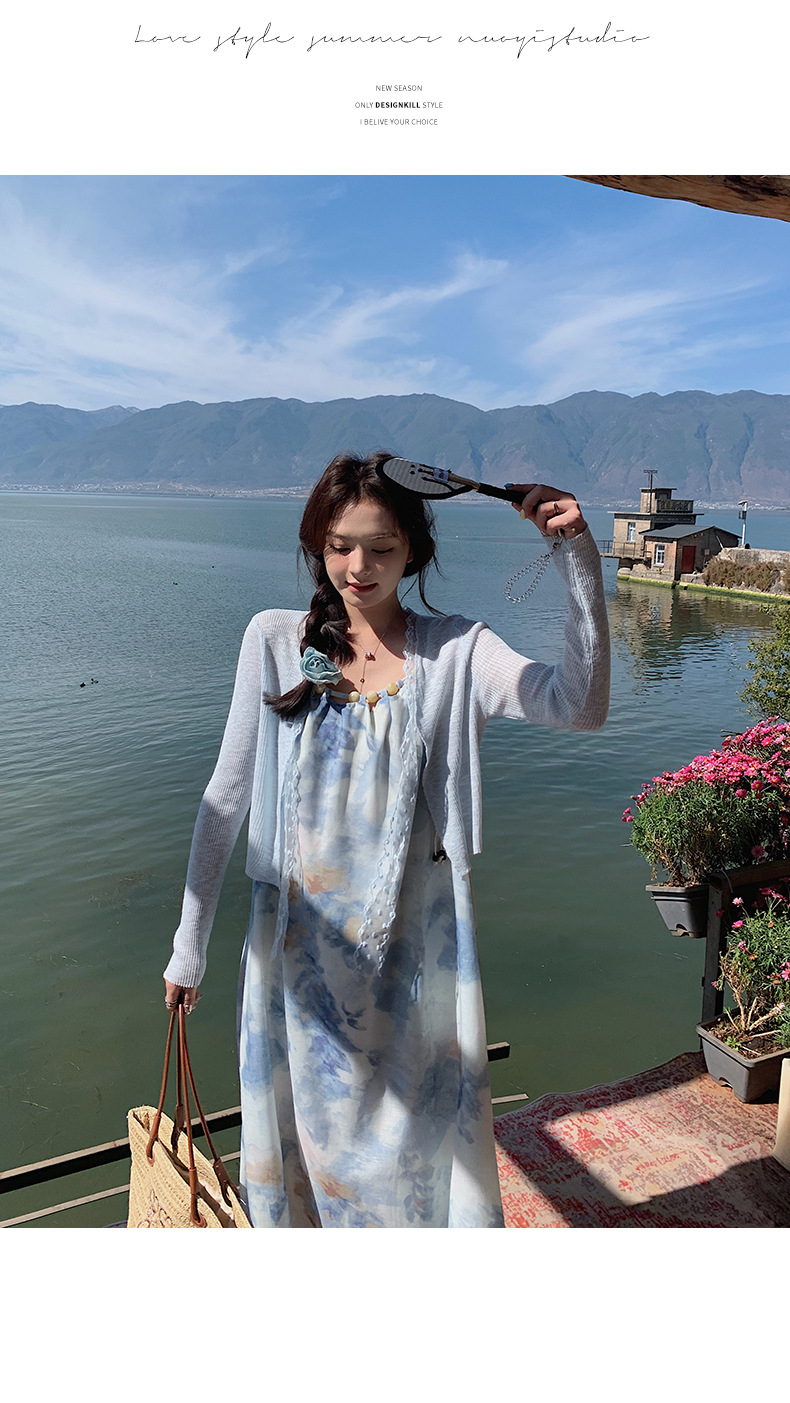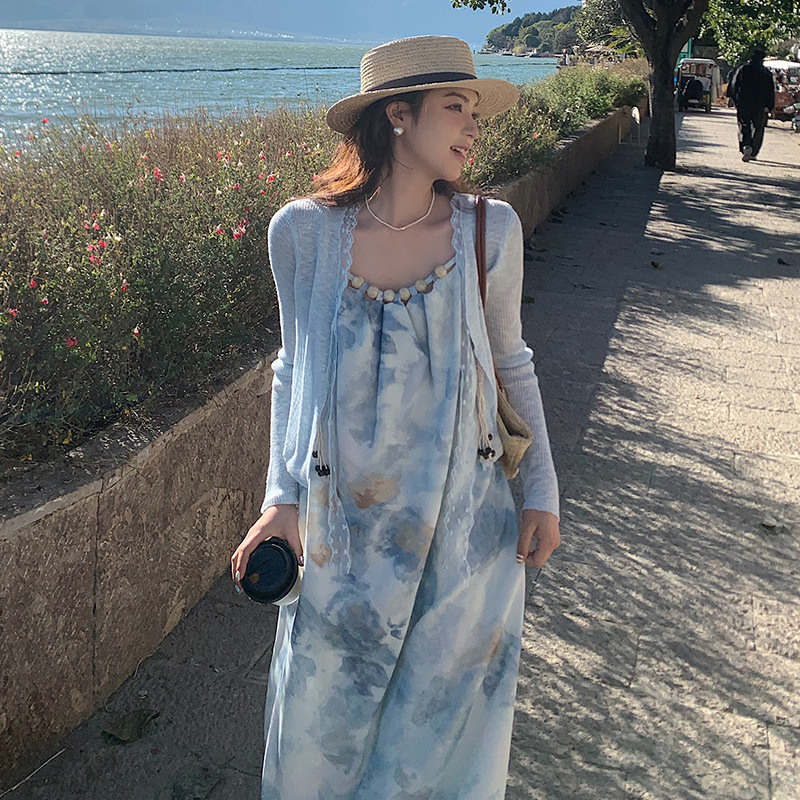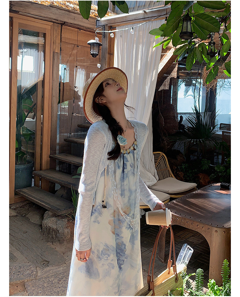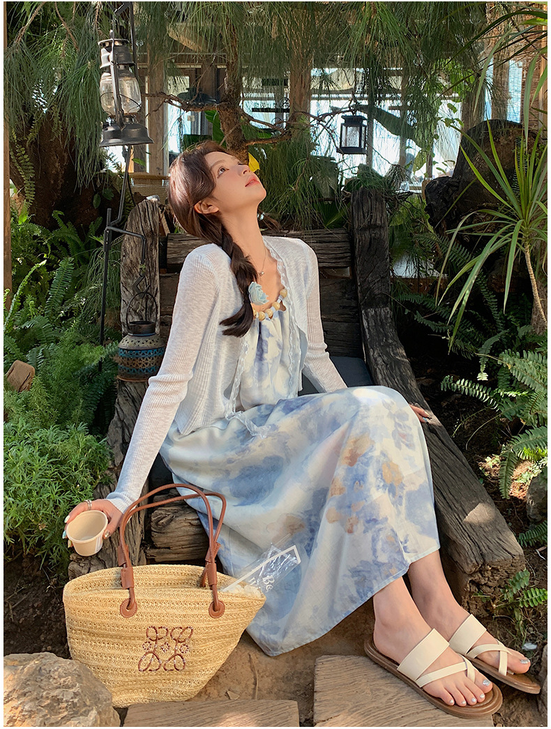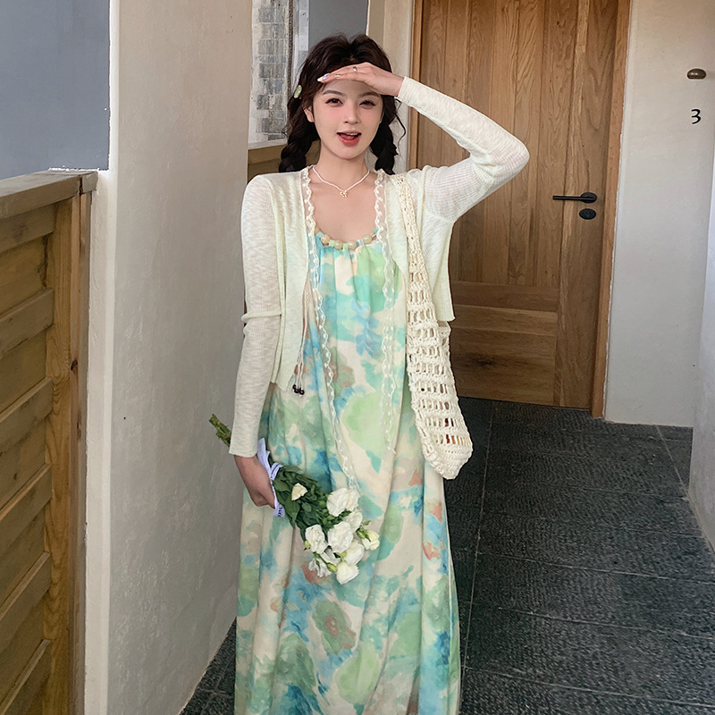 리얼 샷 플로랄 슬링 원피스 세트 2025 여름 할로우 카디건 해변 홀리데이 비치 롱 원피스 투피스 세트