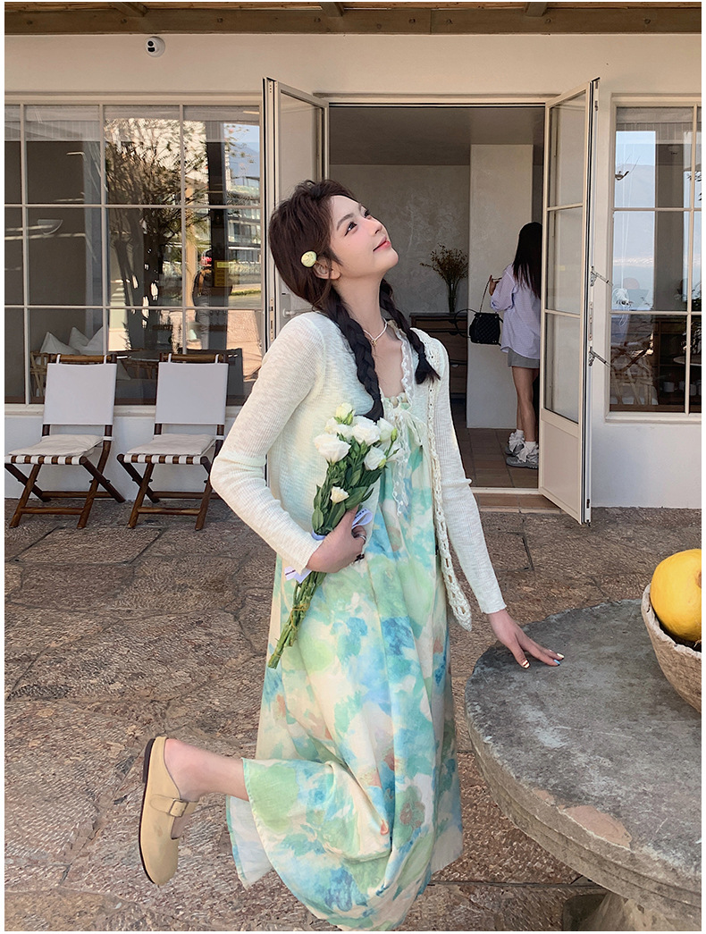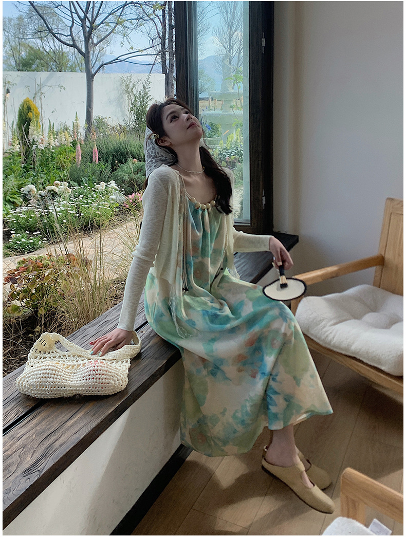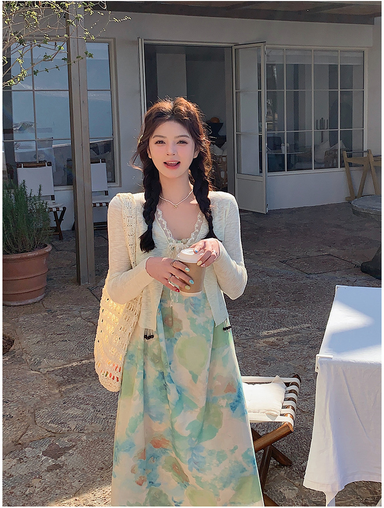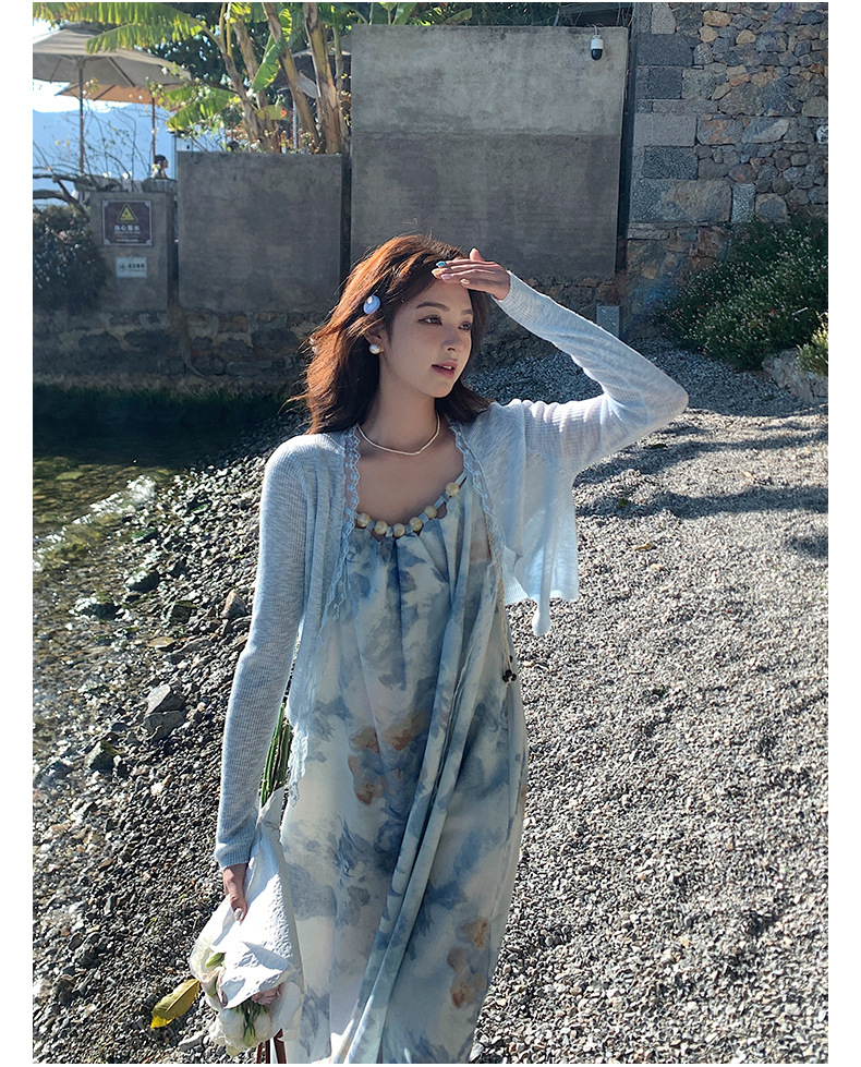 리얼 샷 플로랄 슬링 원피스 세트 2025 여름 할로우 카디건 해변 홀리데이 비치 롱 원피스 투피스 세트