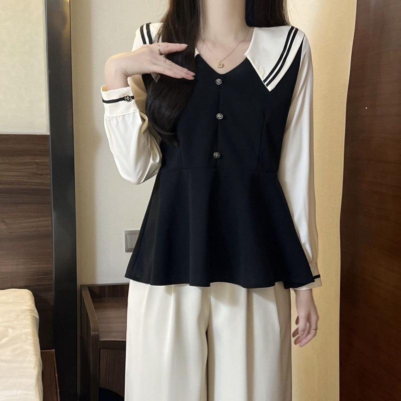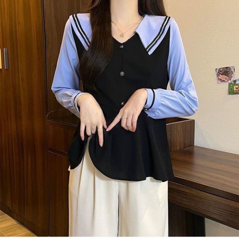 2025 봄 신상 팻 네이비 칼라 쉬폰 셔츠, 배색, 나이를 줄여주는 허리 커버 셔츠, 한국판 플러스 사이즈 여성복스토어 가기