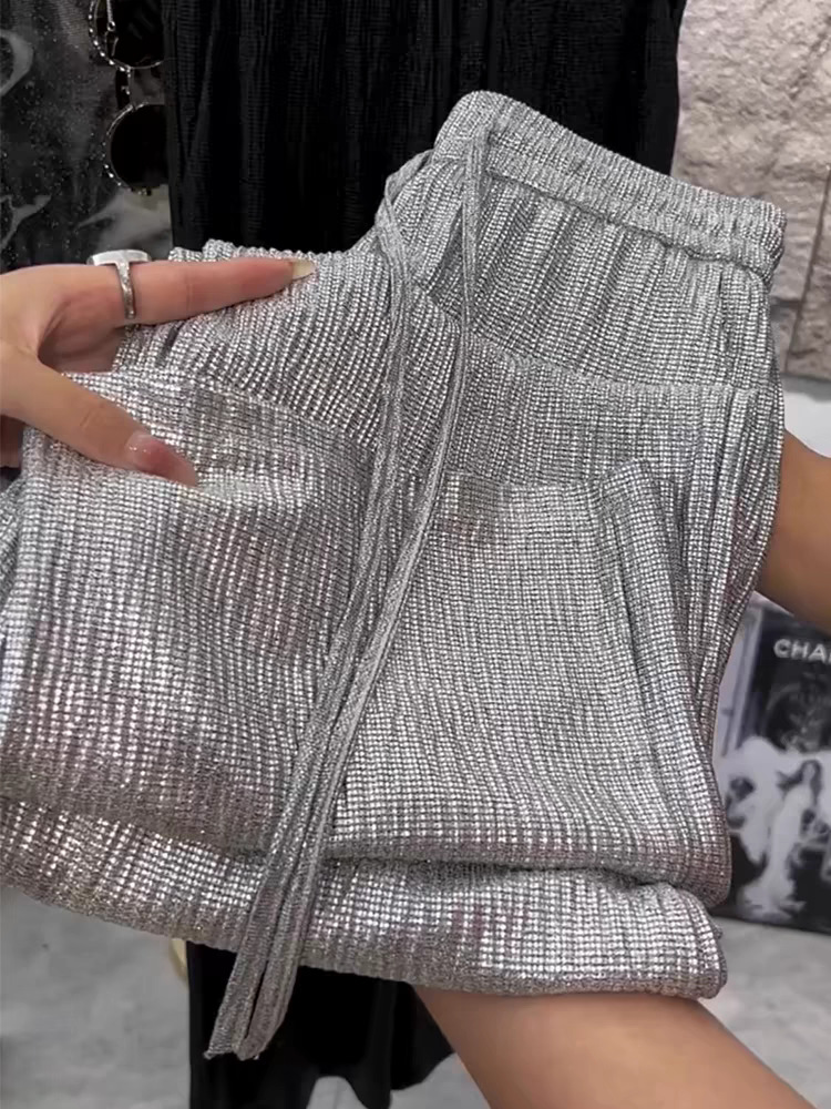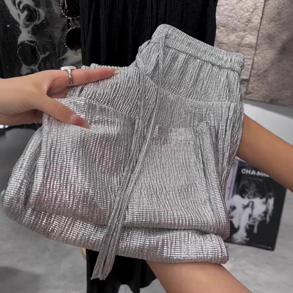 유럽산 아이스 실크 중공업 고급 드레이프 좁은 넓은 다리 바지 여성용 여름 반짝이는 얇은 스트레이트 바지스토어 가기