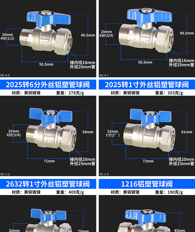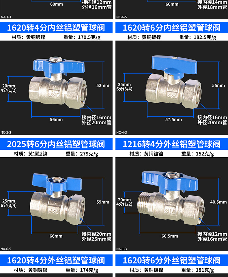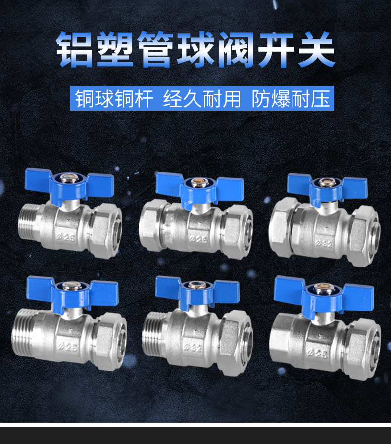 1216/1418/2025/2632 알루미늄 플라스틱 파이프 볼 밸브 스위치 4/6 포인트 태양열 온수기 수도관 구리 밸브