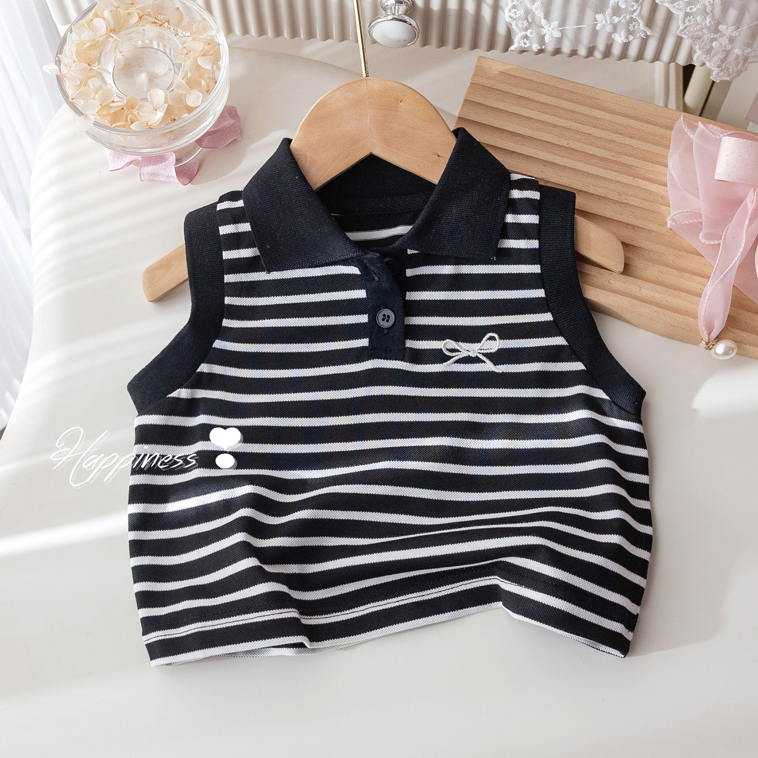 여자 여름 줄무늬 조끼 티셔츠 새로운 여성 아기 여름 폴로 칼라 어린이 서양식 올 매치 민소매 탑