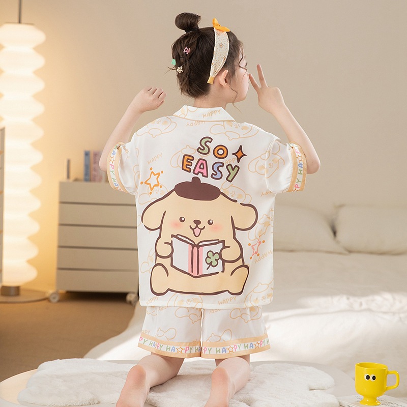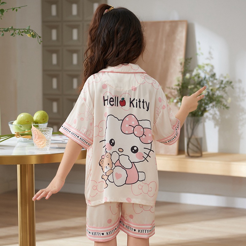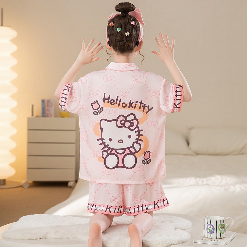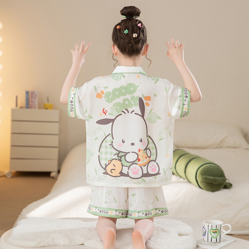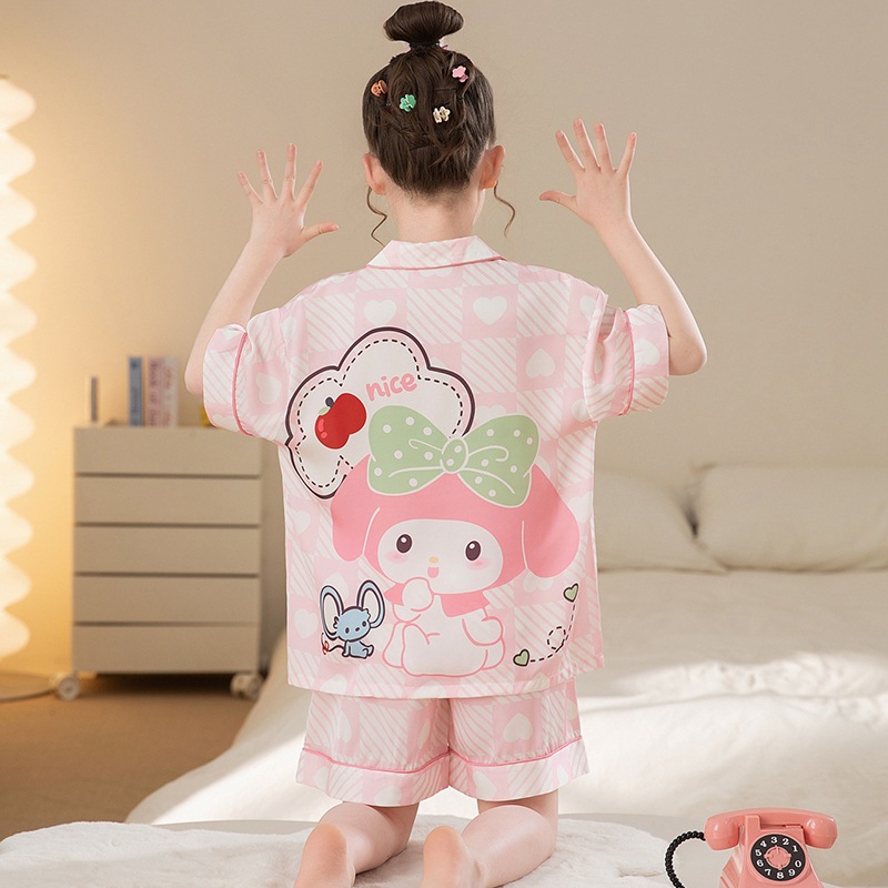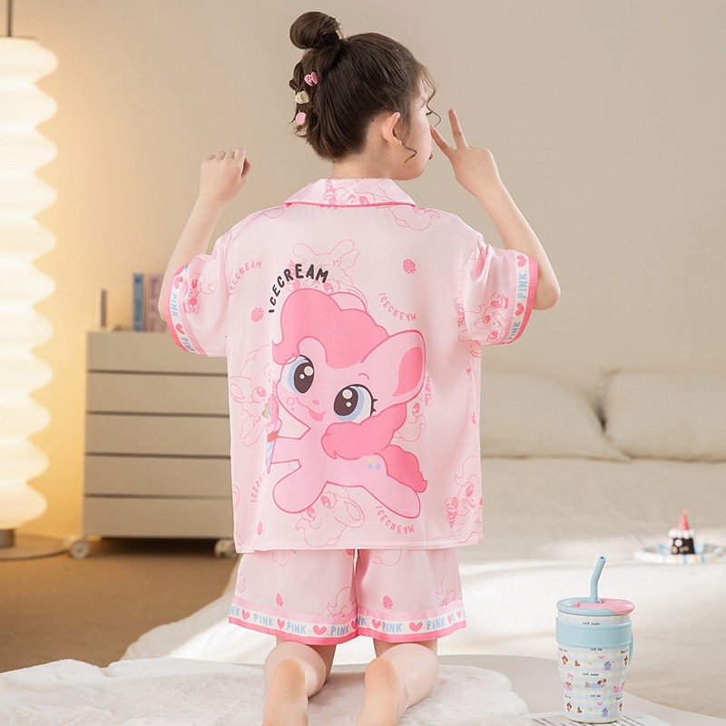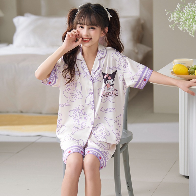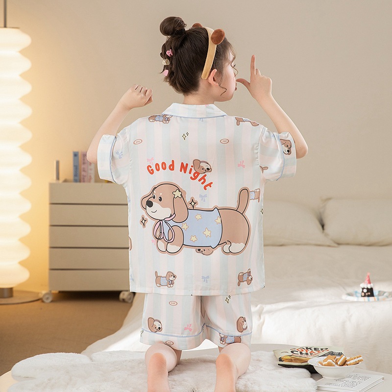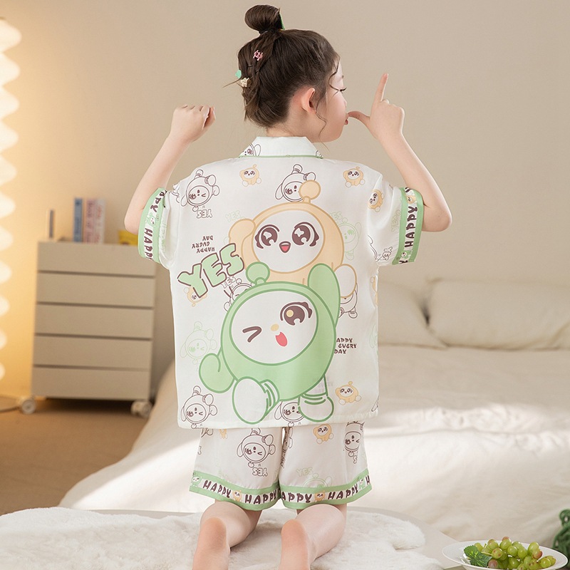 중학생용 아이스 실크 잠옷, 여아 여름 반팔 실크 가정복, 어린이 만화, 중대형 어린이 부모-자식 에어컨 의류스토어 가기
