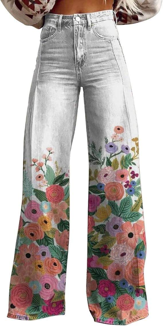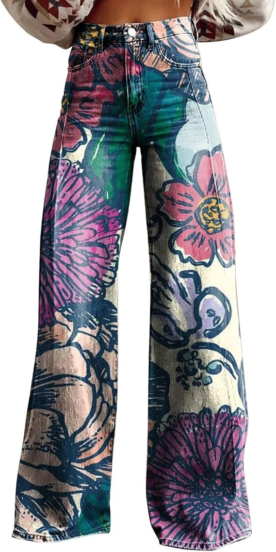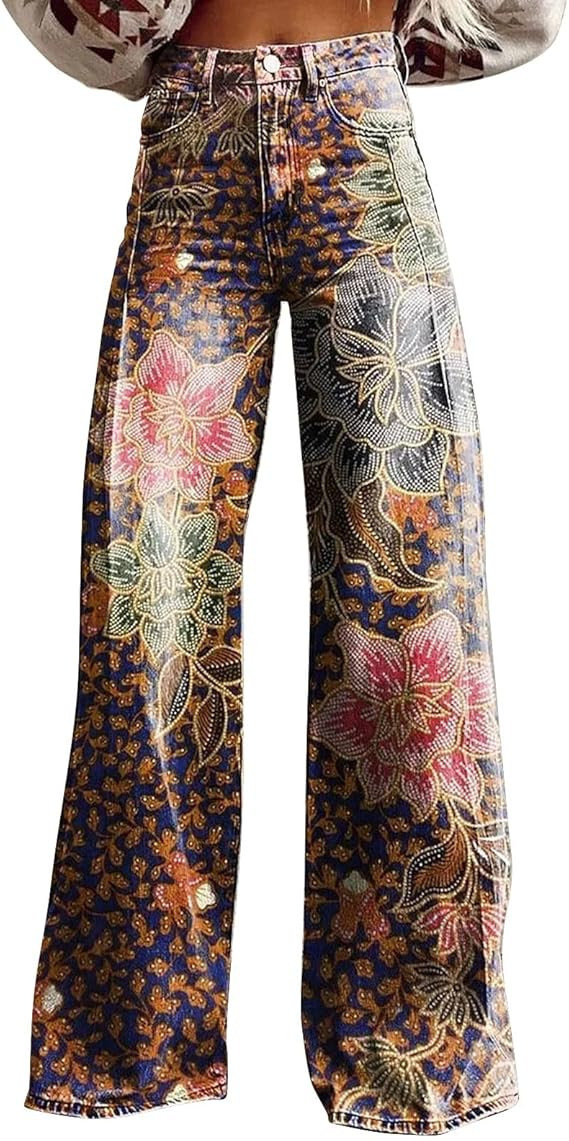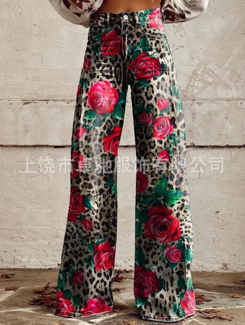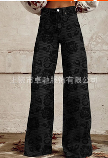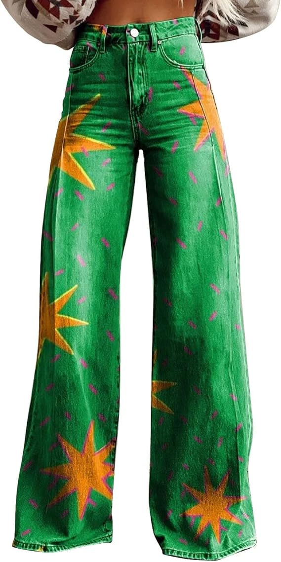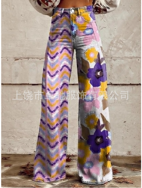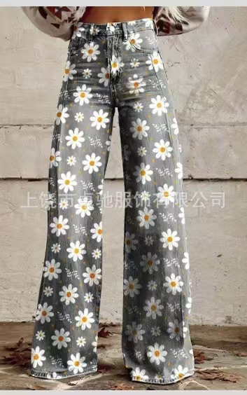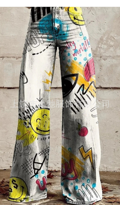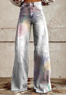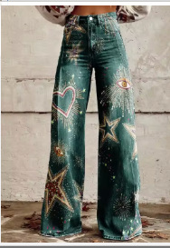 (포켓 버전) 2025 디지털 인쇄 다섯 개의 별 가짜 데님 여성의 넓은 다리 바지 3D 여성용 바지 트럼펫스토어 가기