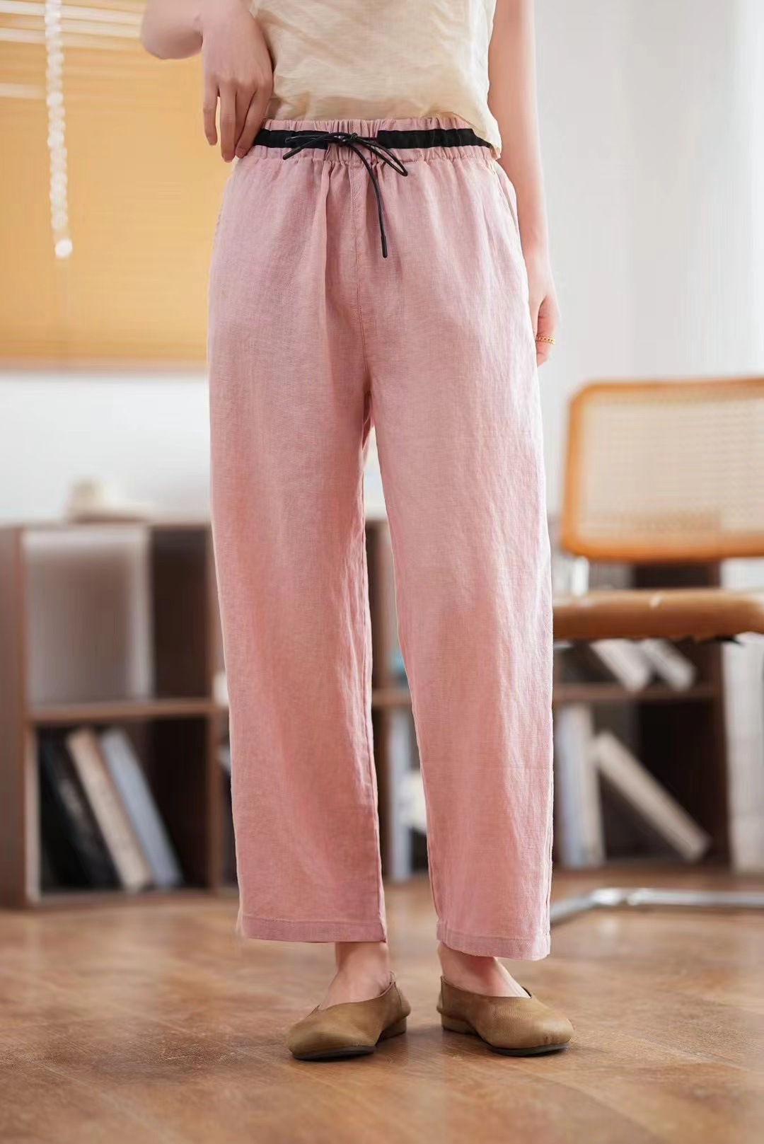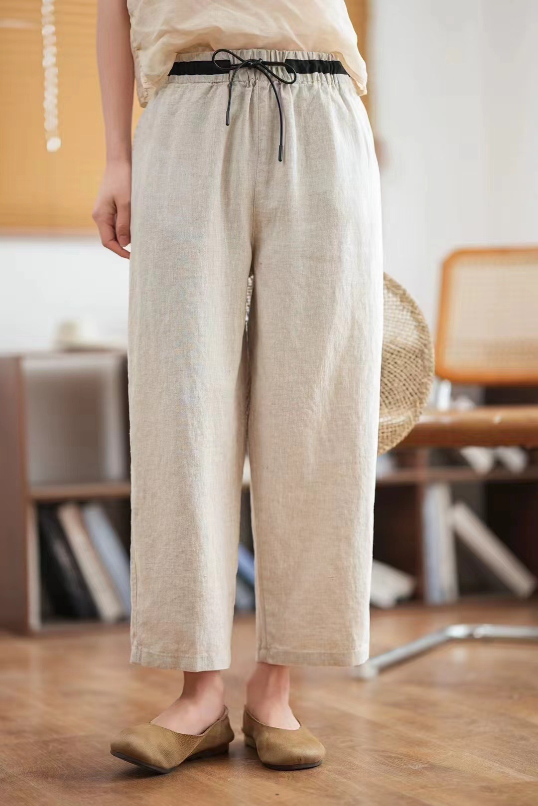 2025 년 여름 새로운 느슨한 플러스 사이즈 린넨 스트레치 허리 끈 할렌 바지 여성용 예술적 복고풍 자른 바지스토어 가기