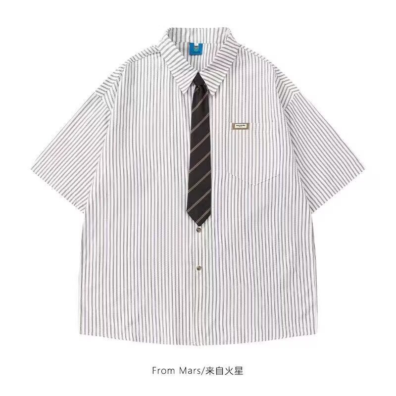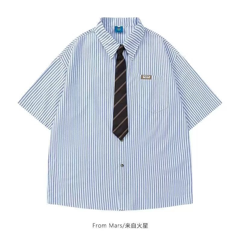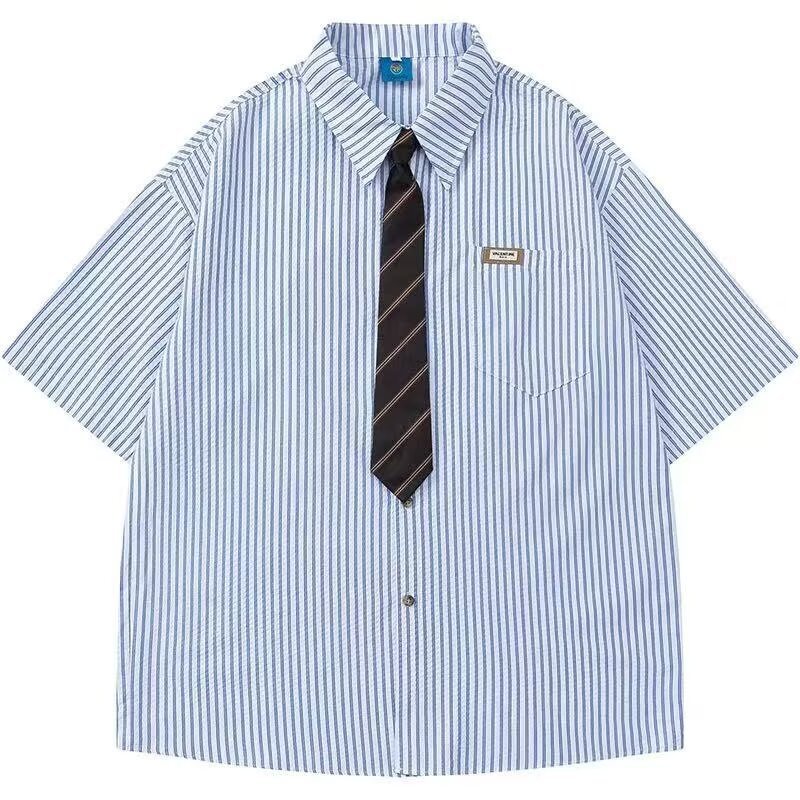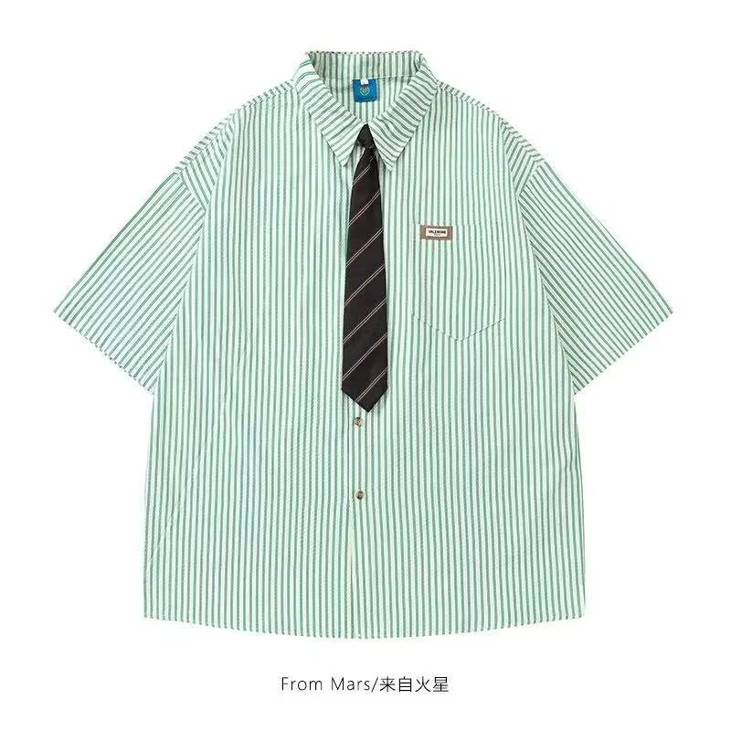 아메리칸 레트로 트렌디 브랜드 세로 줄무늬 포켓 반팔 셔츠 남성용 루즈 캐주얼 대학 스타일 여름 비즈니스 셔츠스토어 가기