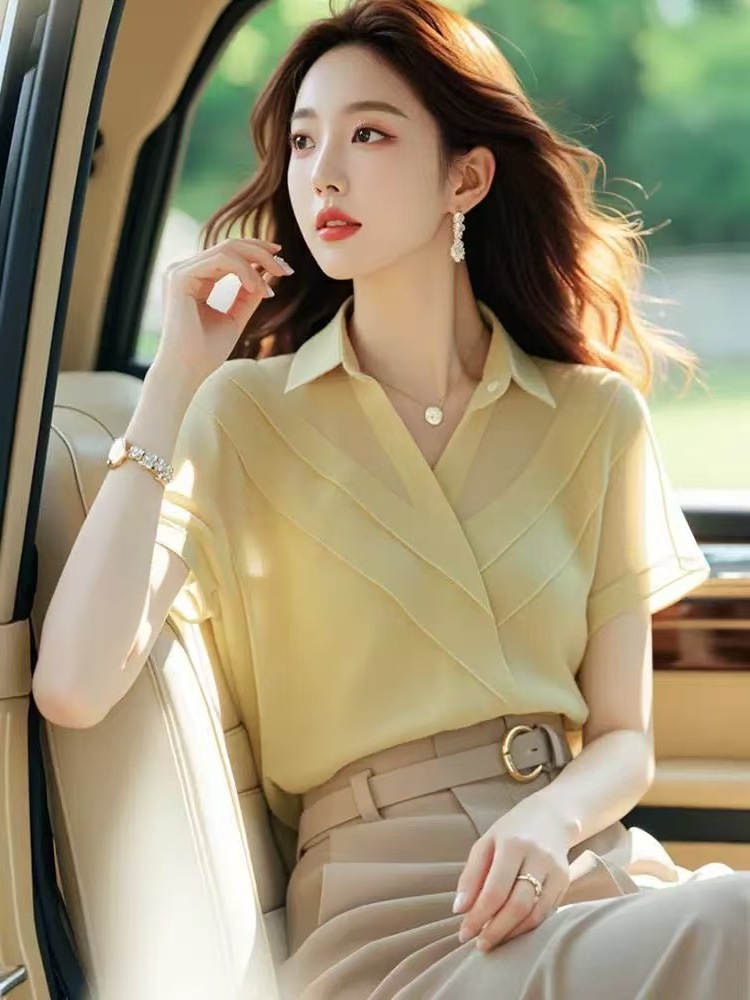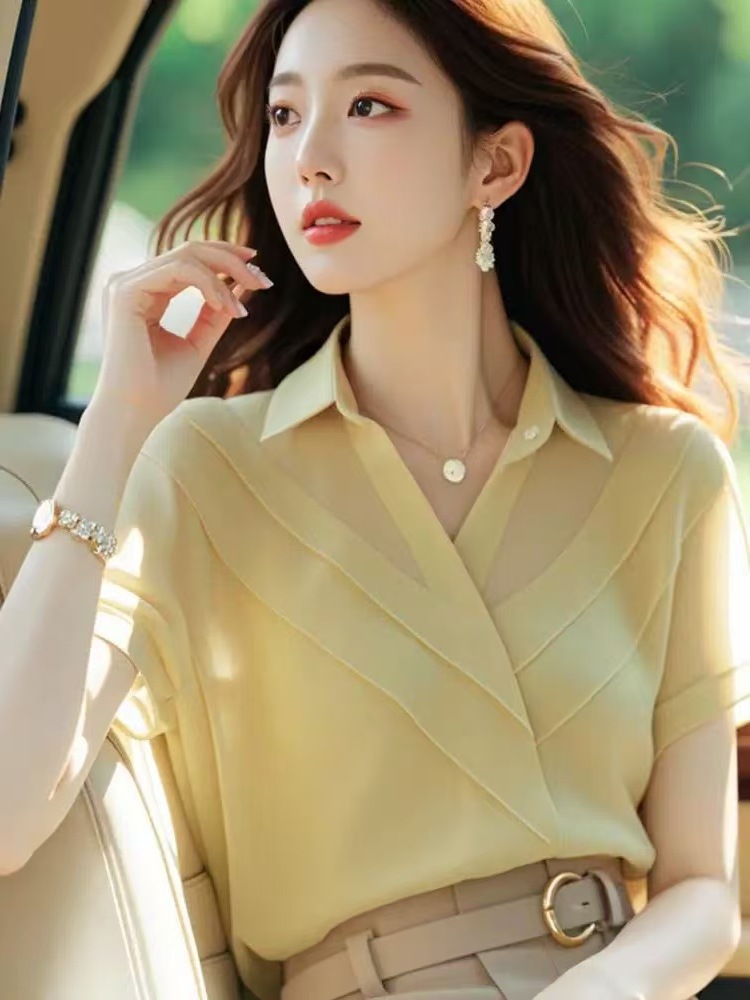 2025 새로운 올해 인기있는 아름다운 셔츠 프랑스 탑 셔츠 노란색 쉬폰 짧은 소매 셔츠 여성 여름