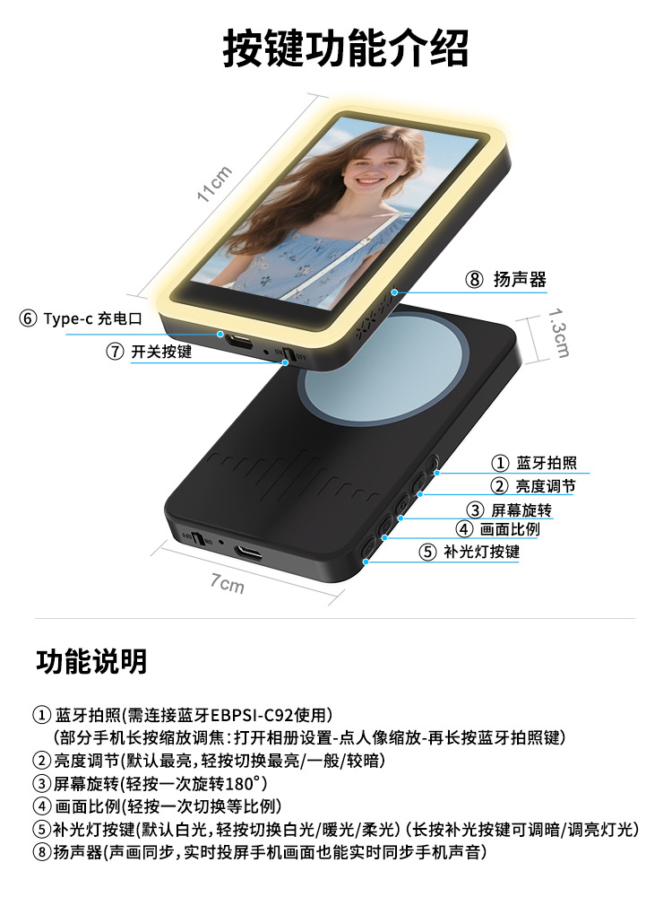 휴대폰 동시화면기 야외 블루투스 자석 셀카 디스플레이 보조광 라이브 방송 후면 모니터링 휴대폰 화면 전송기