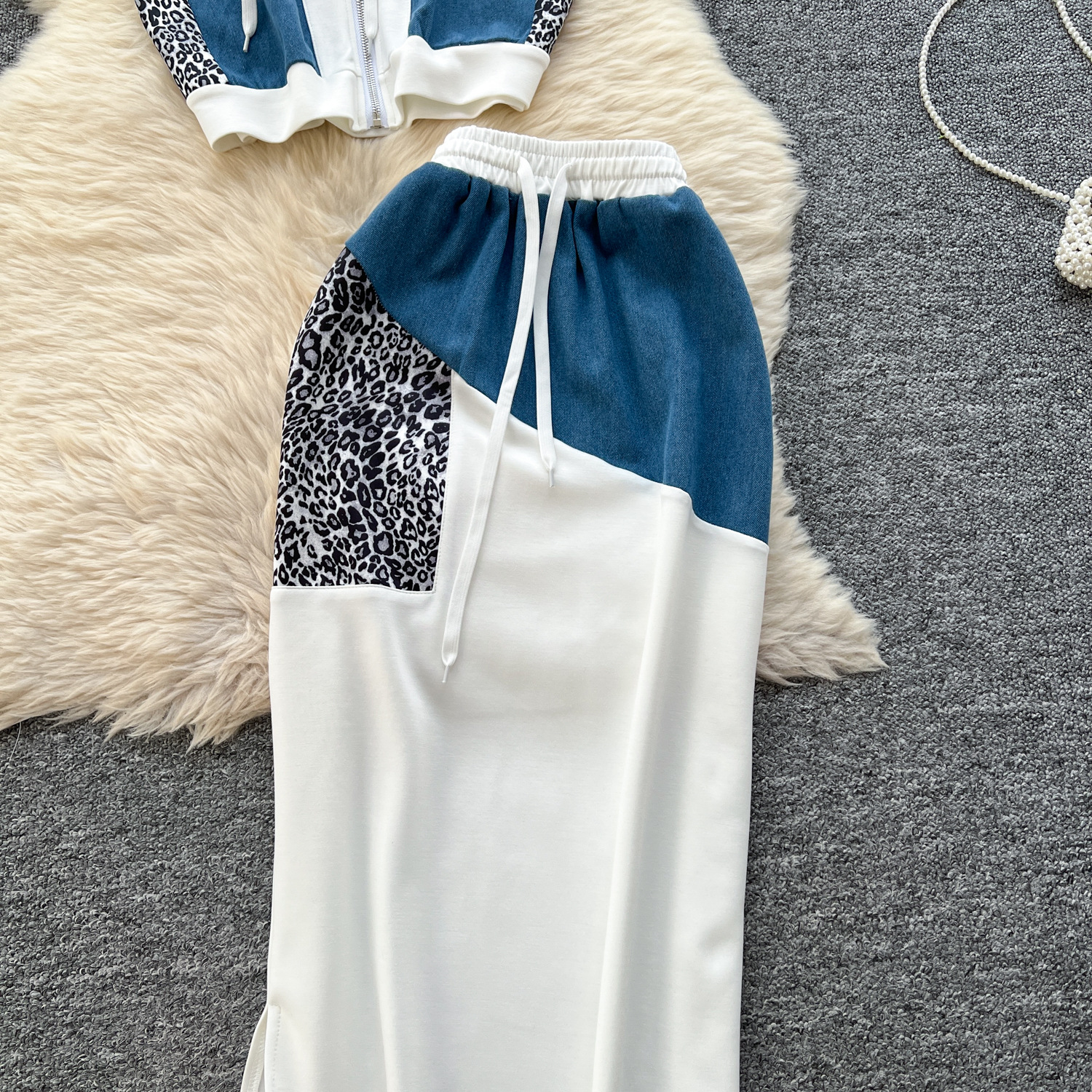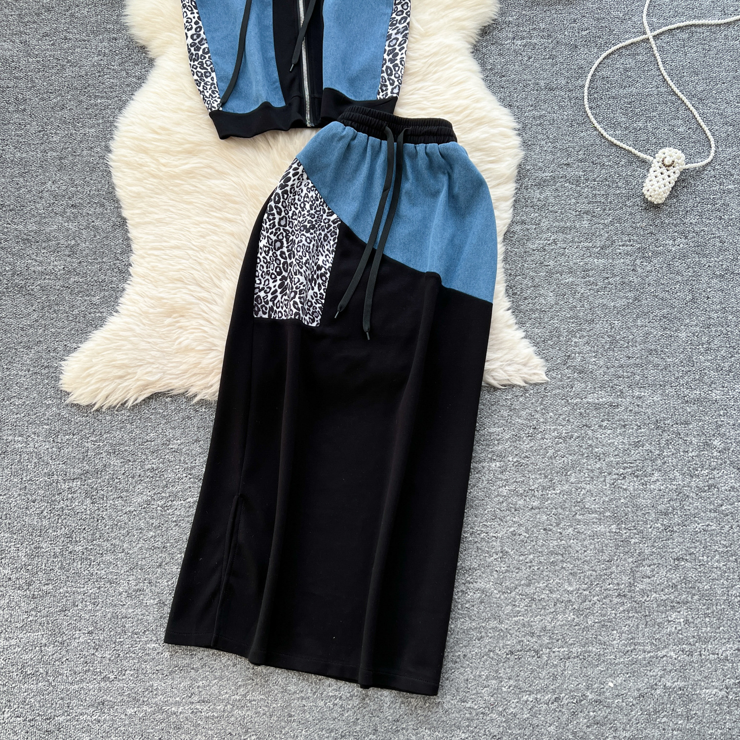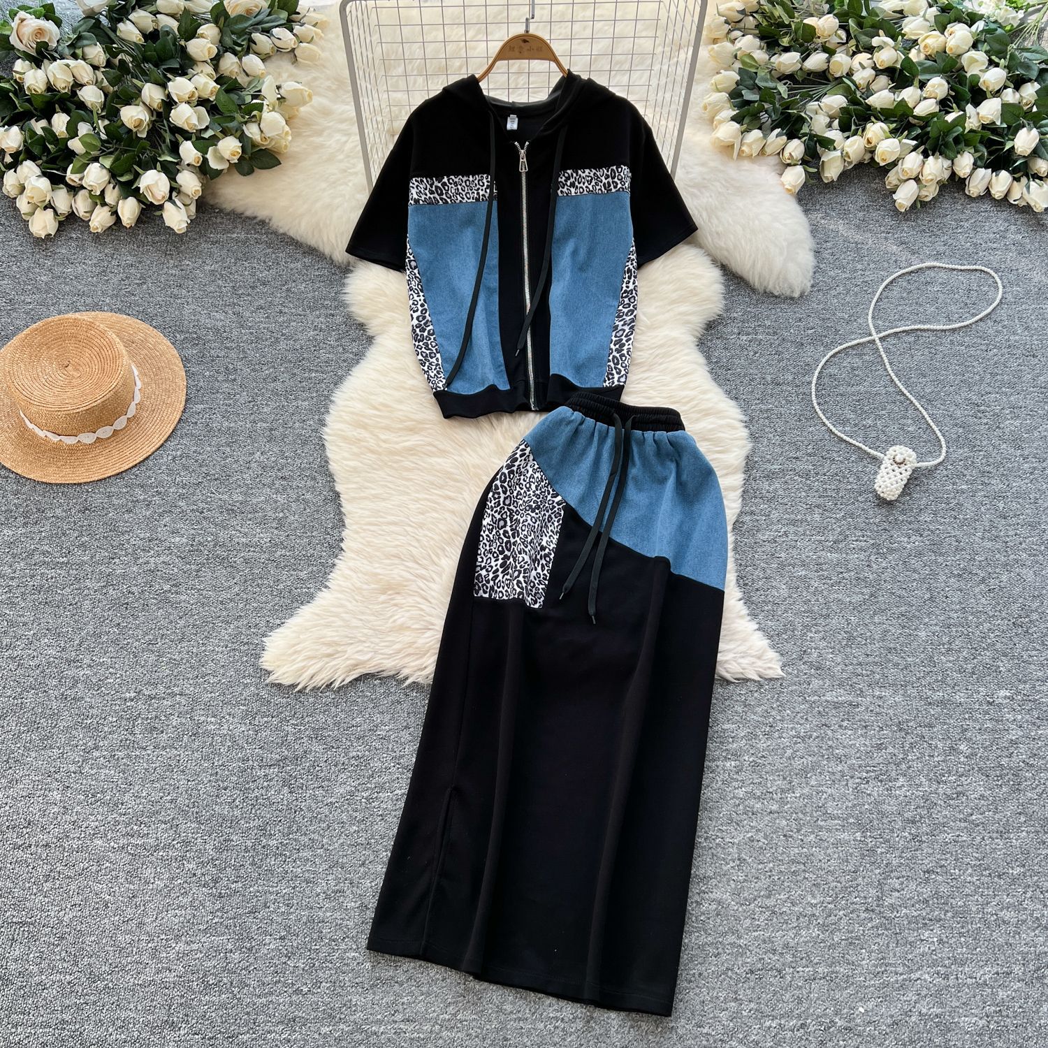올해 인기있는 세트 여성 여름 패션 표범 바느질 후드 스웨터 하이 허리 스플릿 힙 스커트 세트스토어 가기