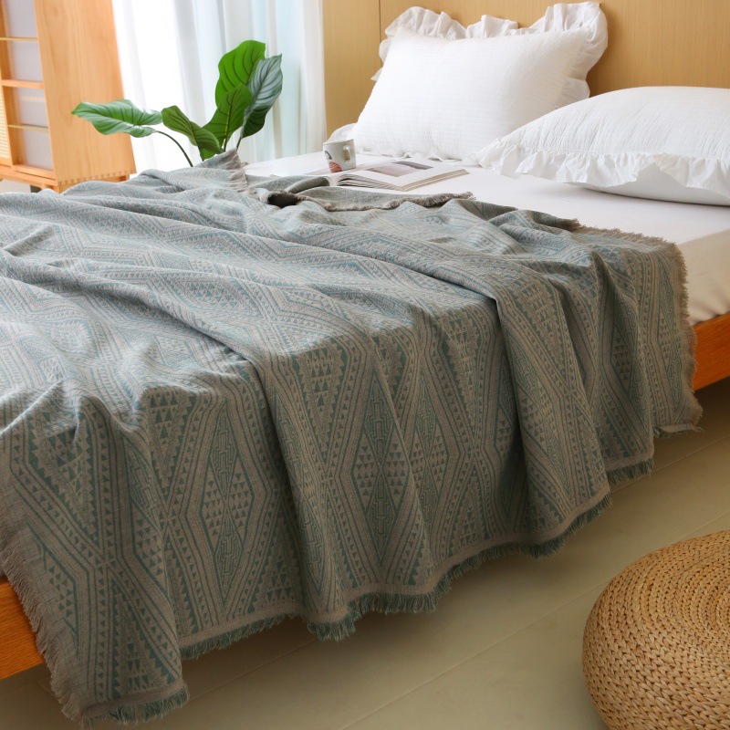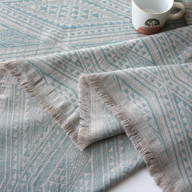 • 다이아몬드 체크 원사 염색 자카드 태슬 담요(대나무와 린넨 혼방-그린)