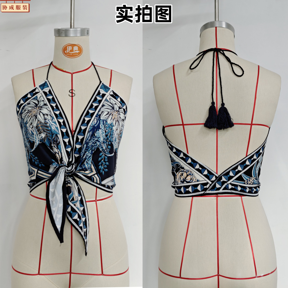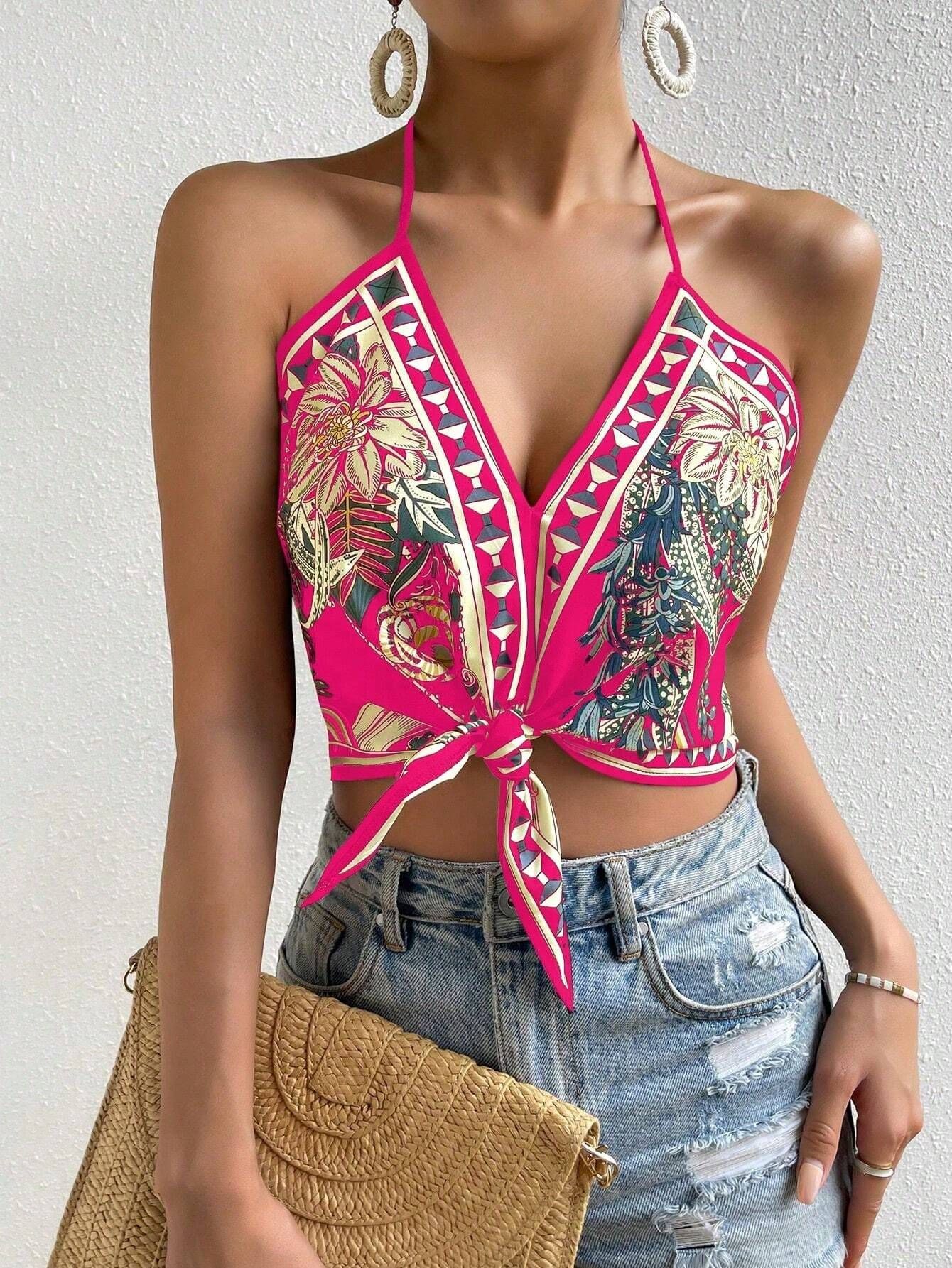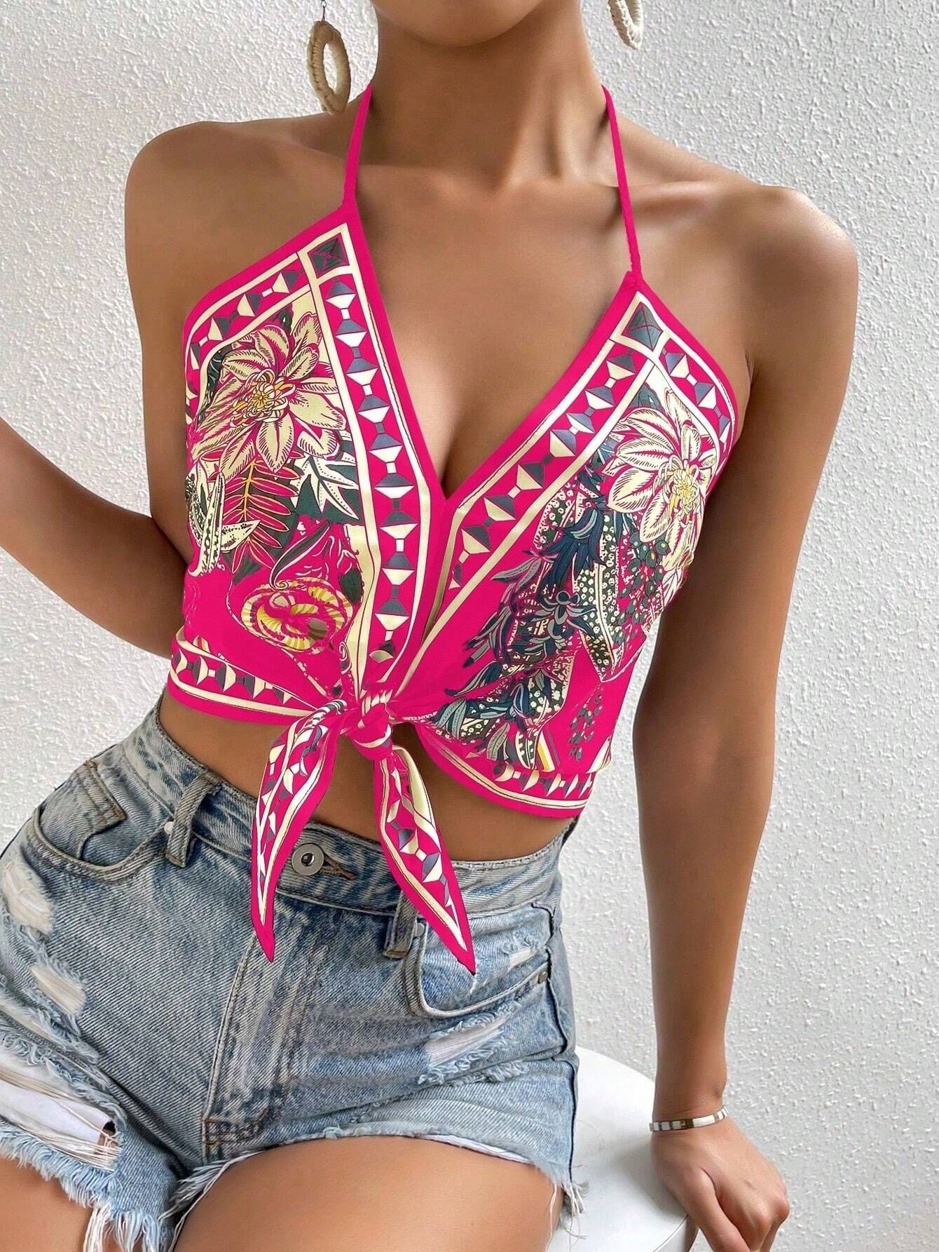 2025 아마존 국경 유럽과 미국의 새로운 휴일 스타일 섹시 프린트 매듭 민소매 목 슬링 탑