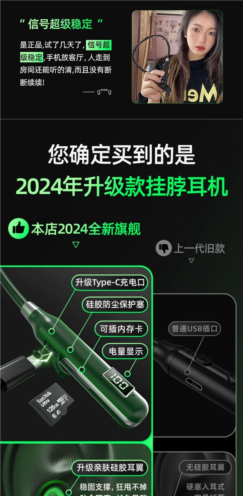 • 캔글링 그린 ★ 플래그십 버전 [200% 향상된 매우 긴 배터리 수명 + 플러그인 메모리 카드 + 천 위안 36D 서라운드 사운드 + 수입 저전력 5.3 칩 + 액체 실리콘