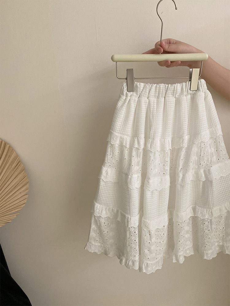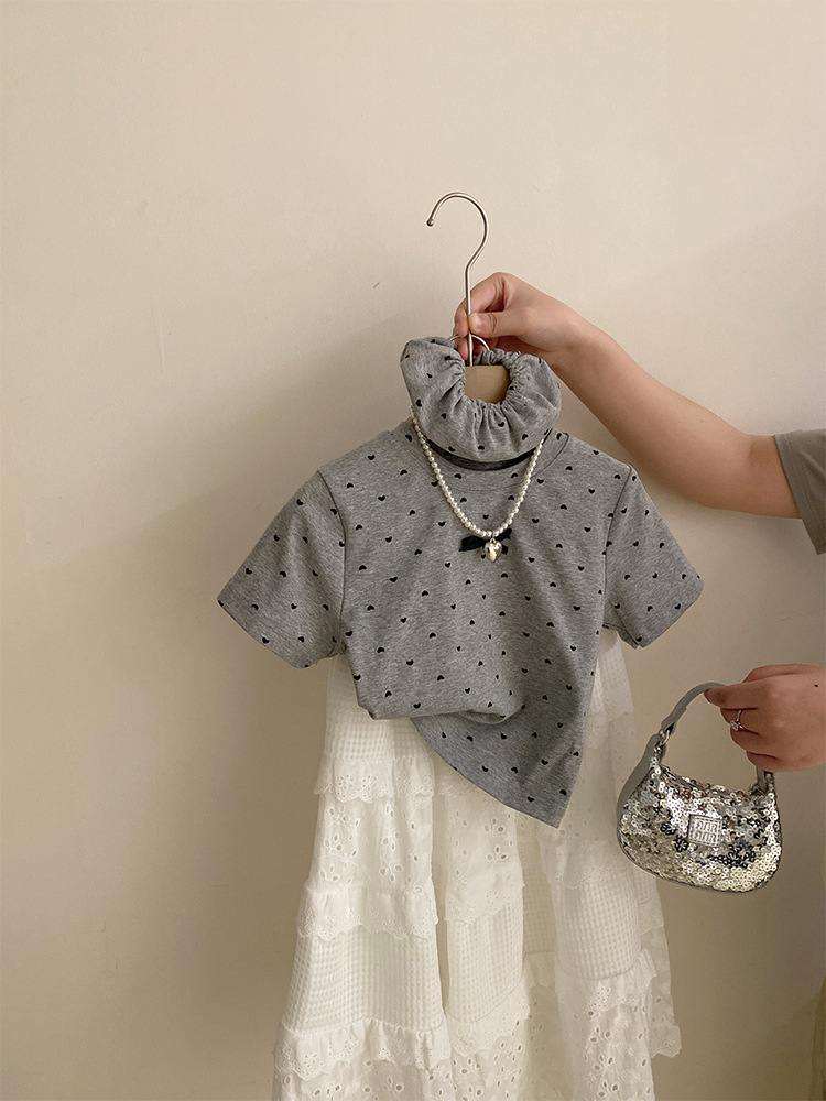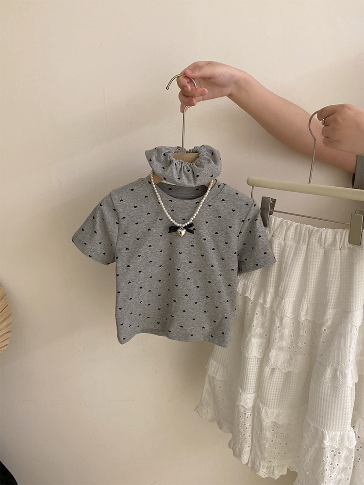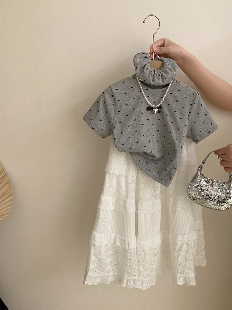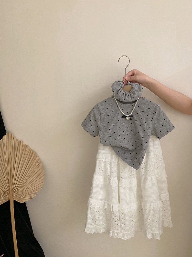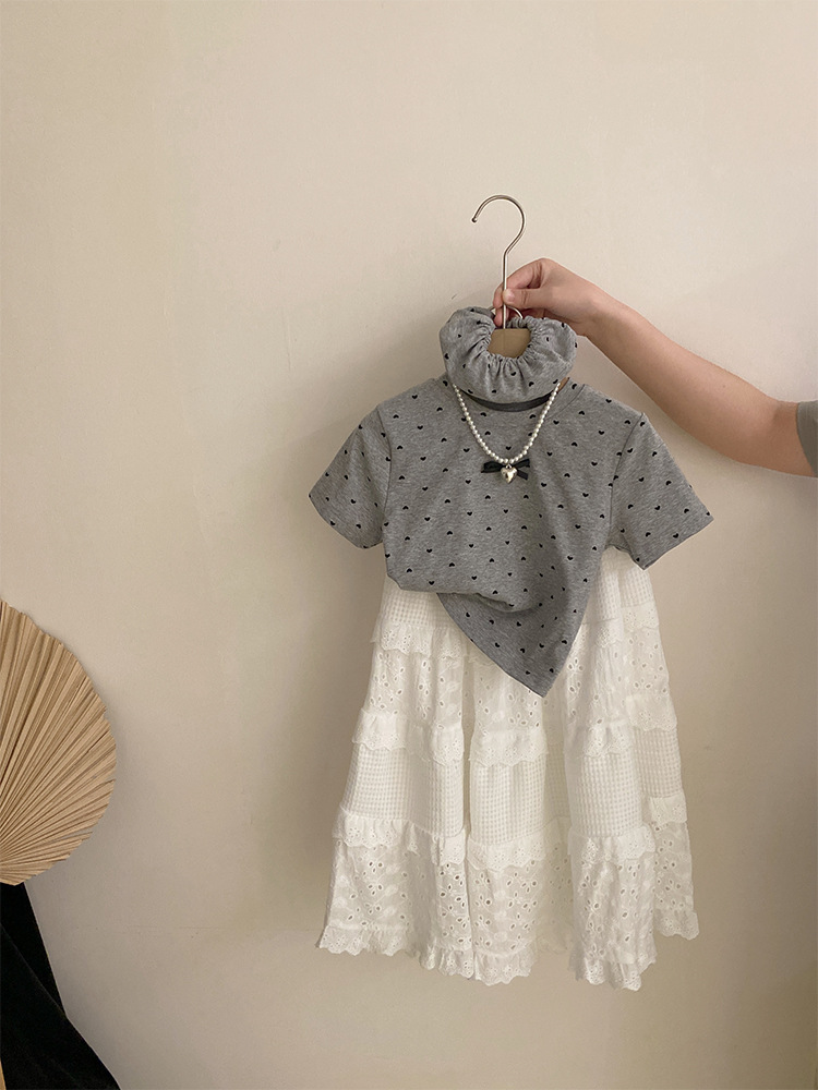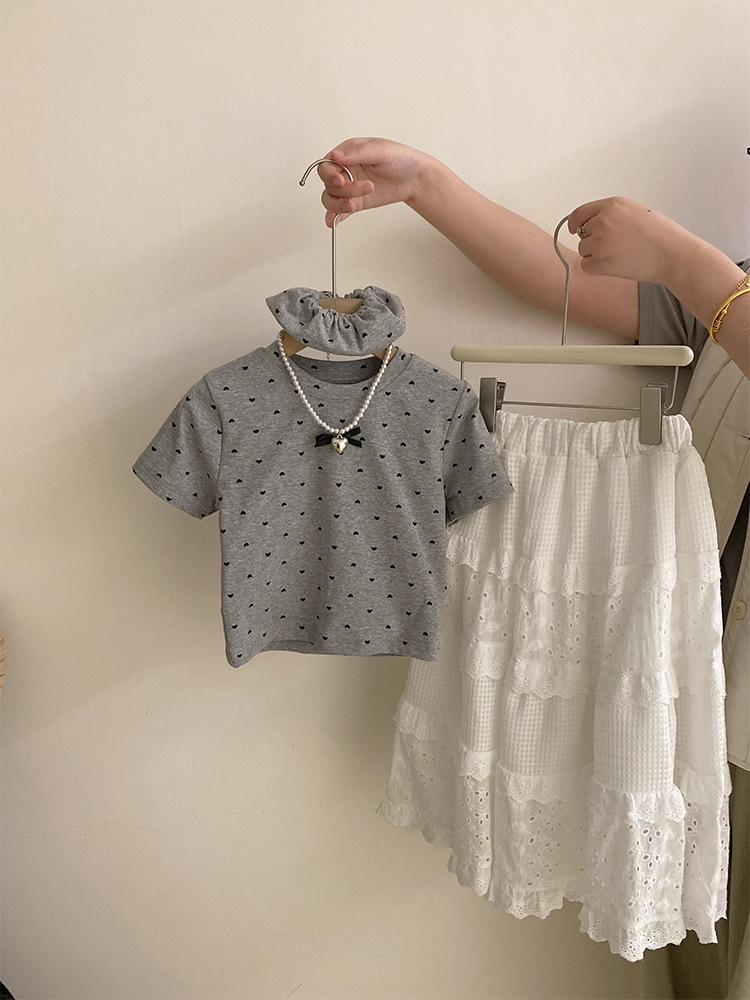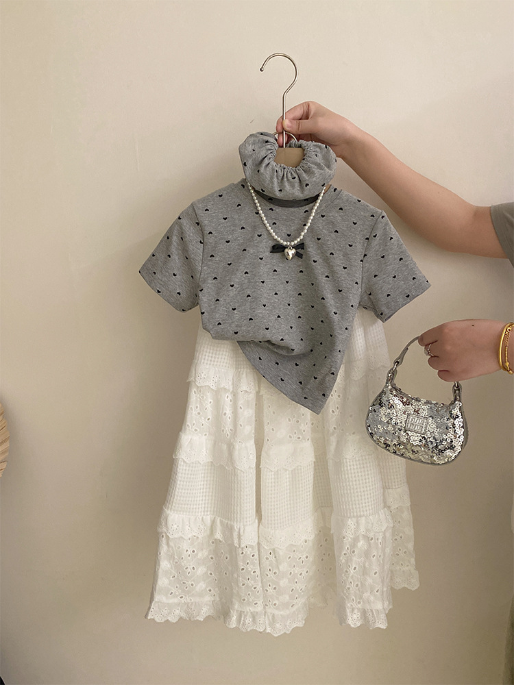 소녀 한국식 여름 2025 새로운 올매치 인쇄 사랑 반팔 최고 어린이 중공 공주 트렌디 스커트