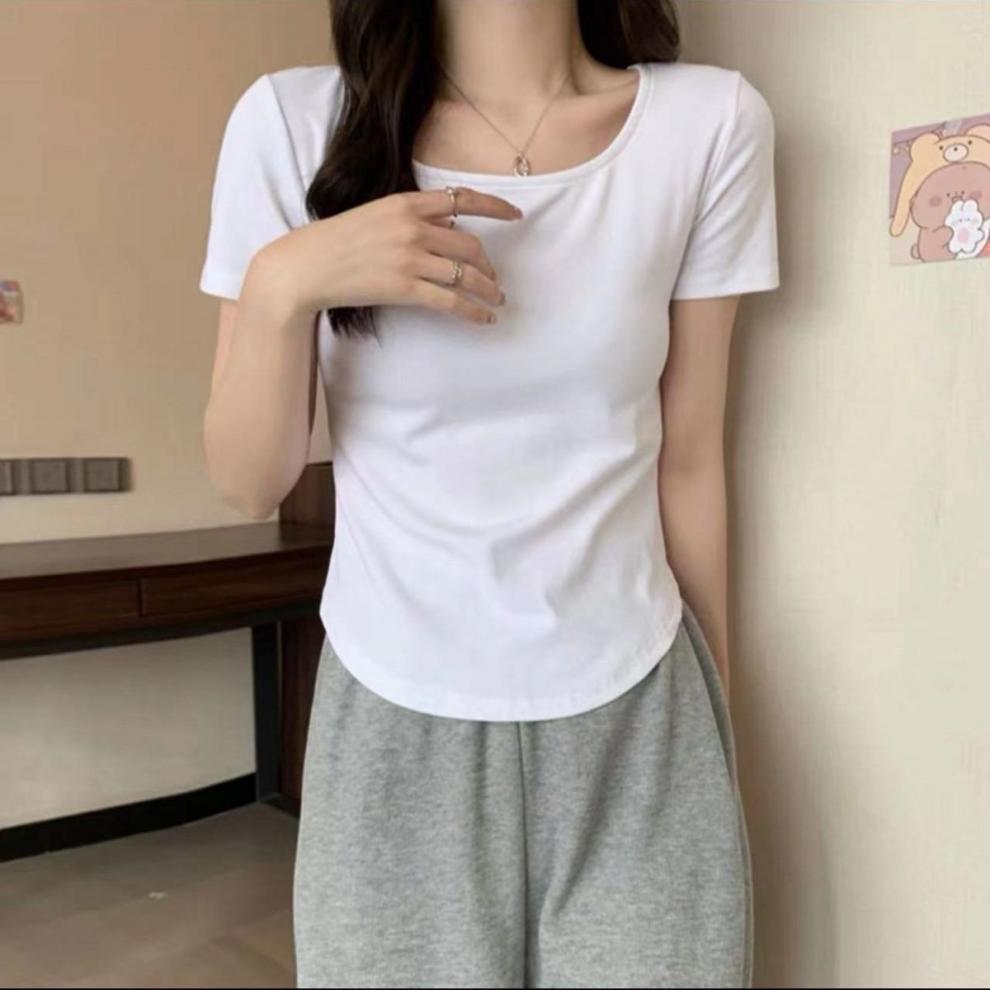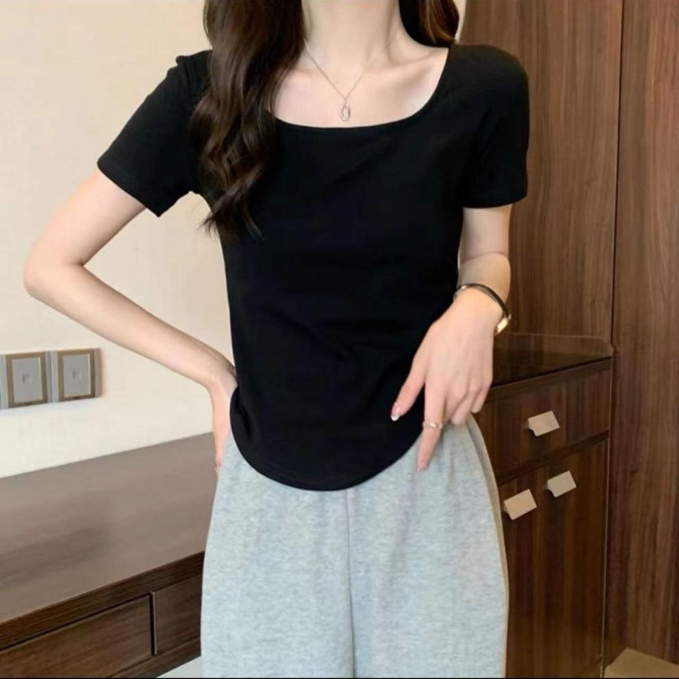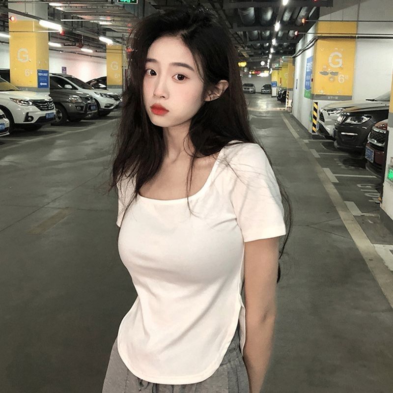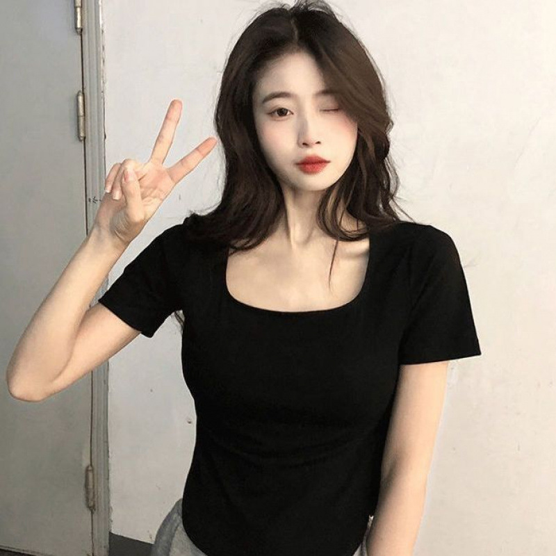 인터넷 기념 핫 숄더 스퀘어 칼라 반팔 셔츠 여성용 여름 새로운 슬림 슬리밍 커브 반팔 탑