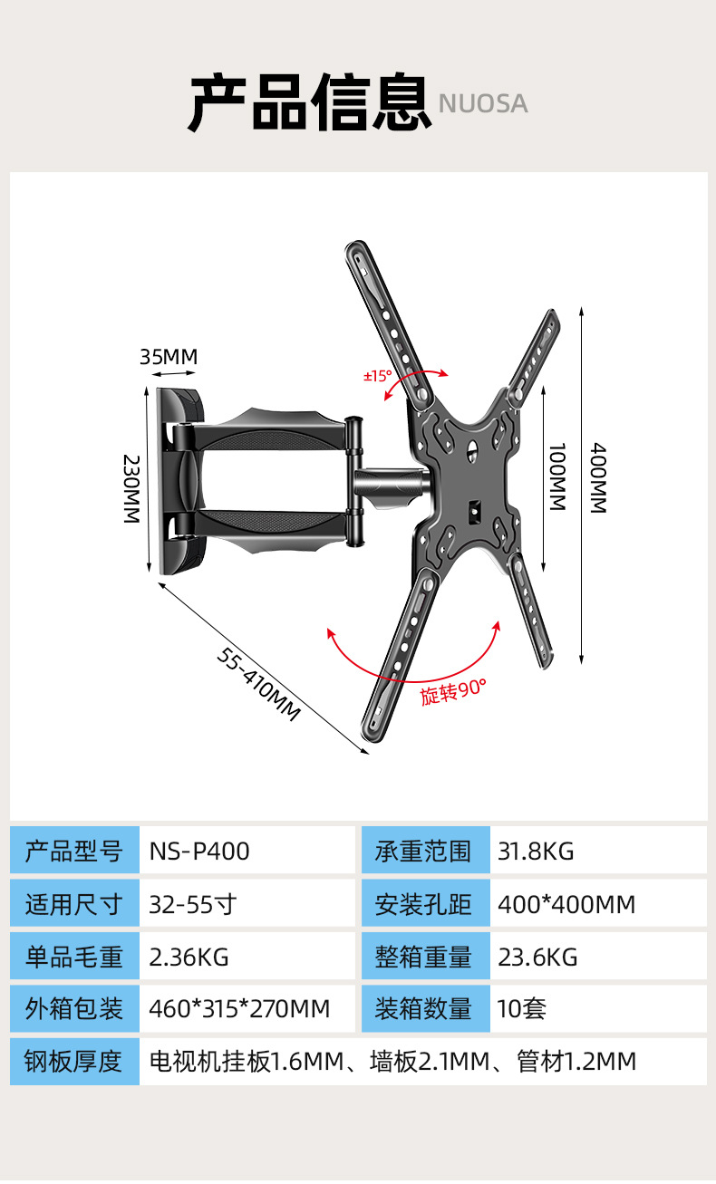 TV 브래킷 벽걸이형 스윙 랙 범용 텔레스코픽 회전 TV 브래킷 32-55인치 접이식 TV 브래킷스토어 가기