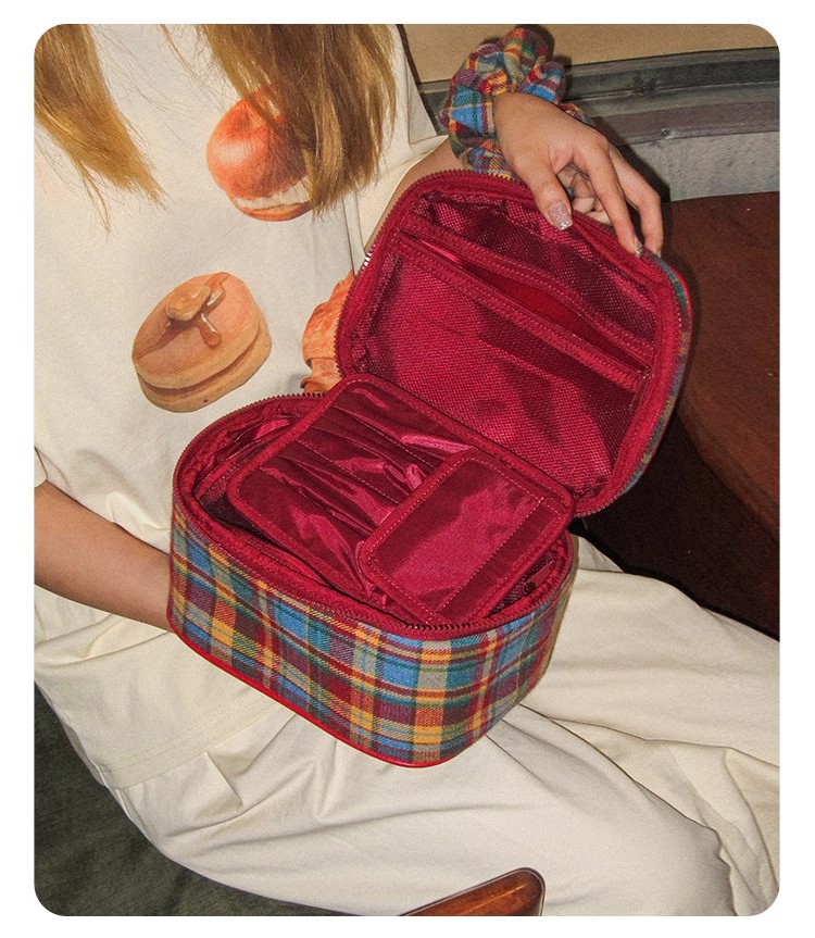 Puui 원래 화장품 가방 휴대용 대용량 레트로 격자 무늬 보관 가방 고급 센스 여행 세탁 가방스토어 가기