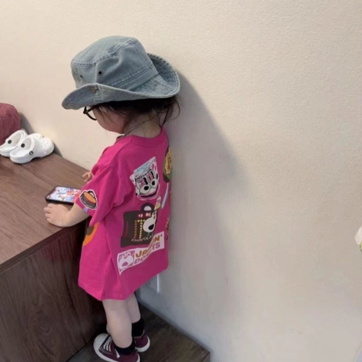 아기 소녀의 핑크 만화 인쇄 티셔츠 2025 여름 새로운 소녀 유행 어린이 의류 느슨한 반 소매 탑스토어 가기