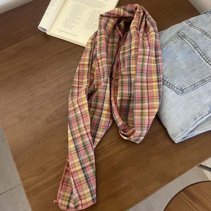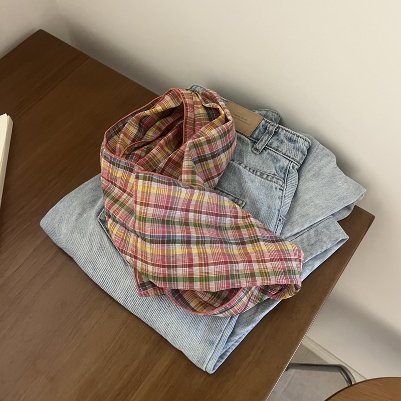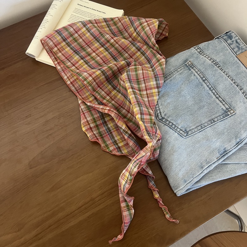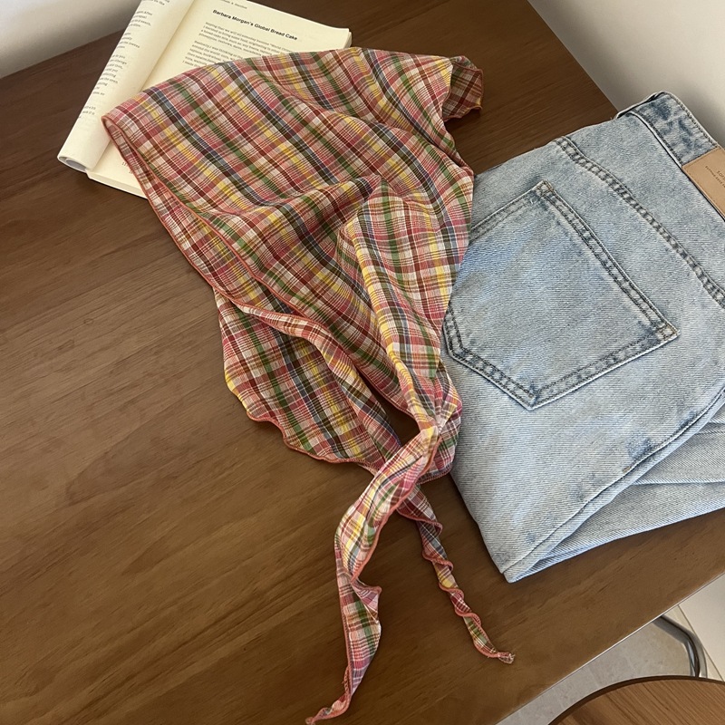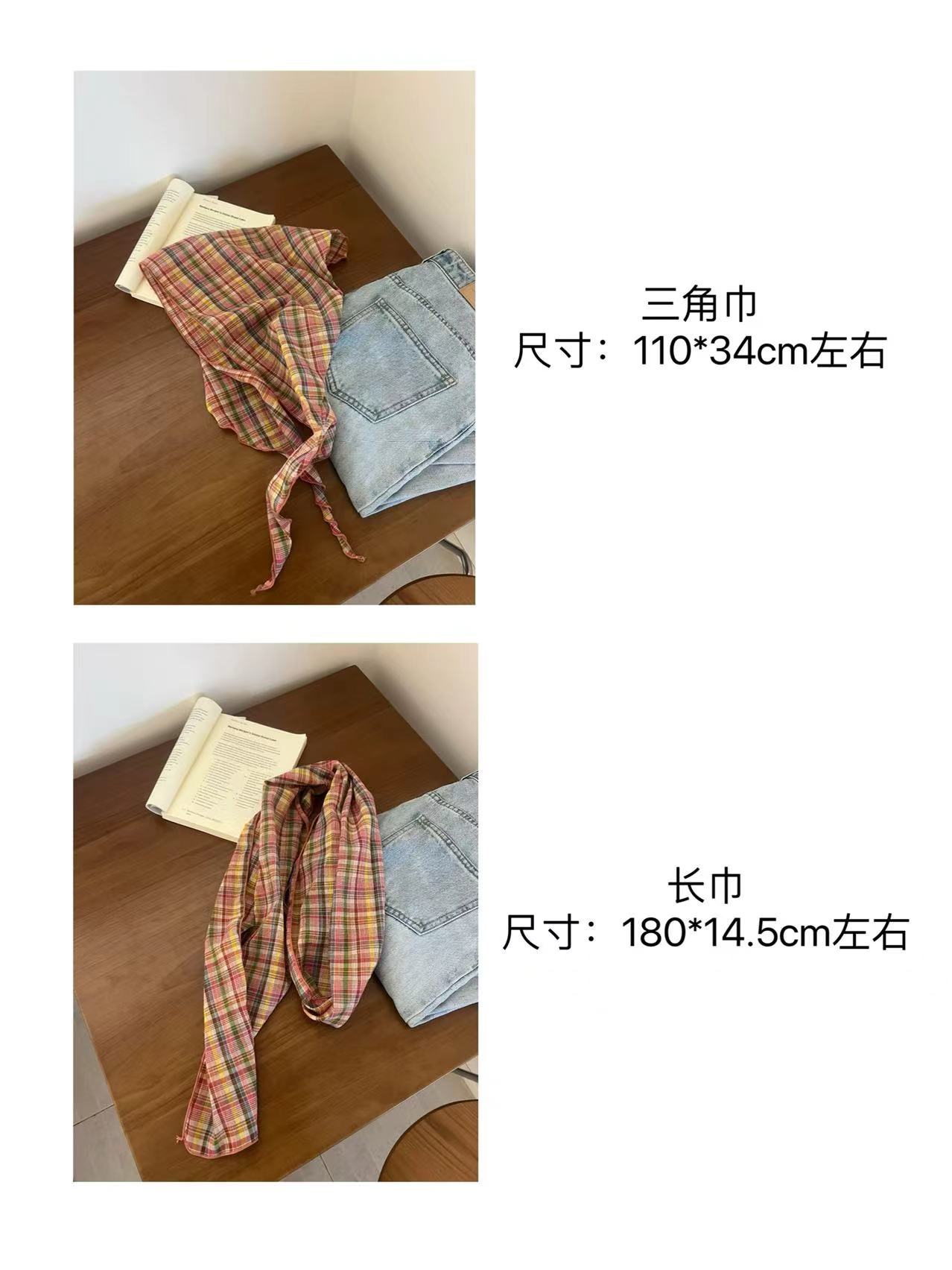 여름 도파민 컬러 격자 삼각형 터번 달콤한 장식 긴 실크 스카프 여성 헤어 밴드 목 리본 벨트