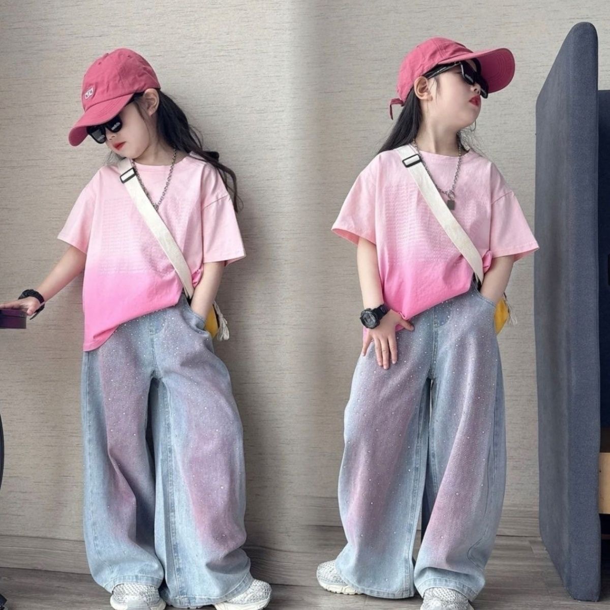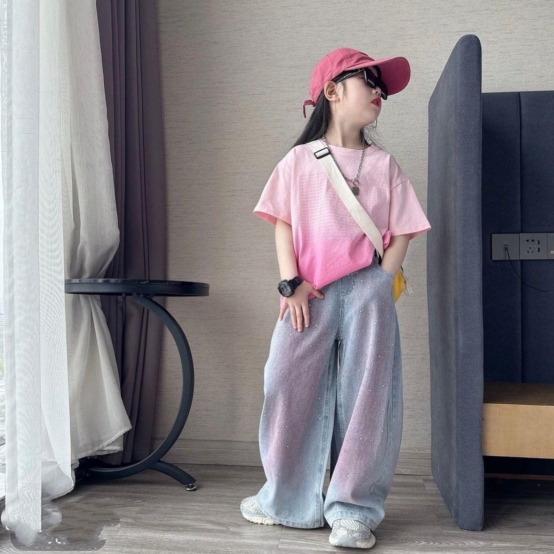 소녀 여름 세트 2025 새로운 스타일 서양식 매달린 염료 짧은 소매 대형 어린이 뜨거운 드릴링 데님 넓은 다리 바지 투피스 세트스토어 가기