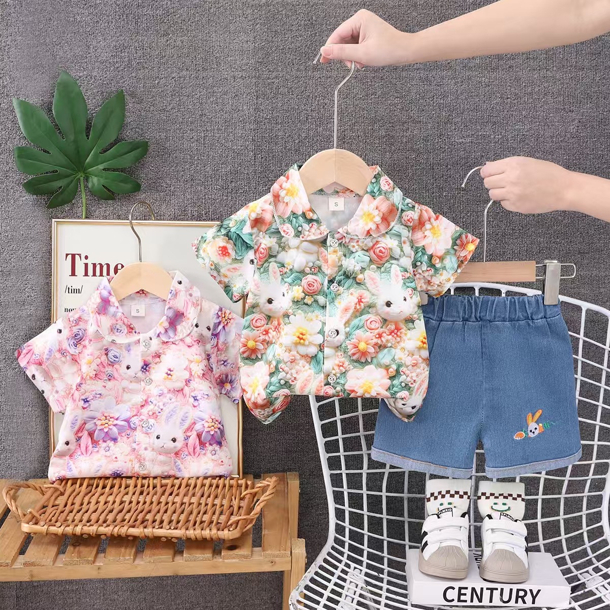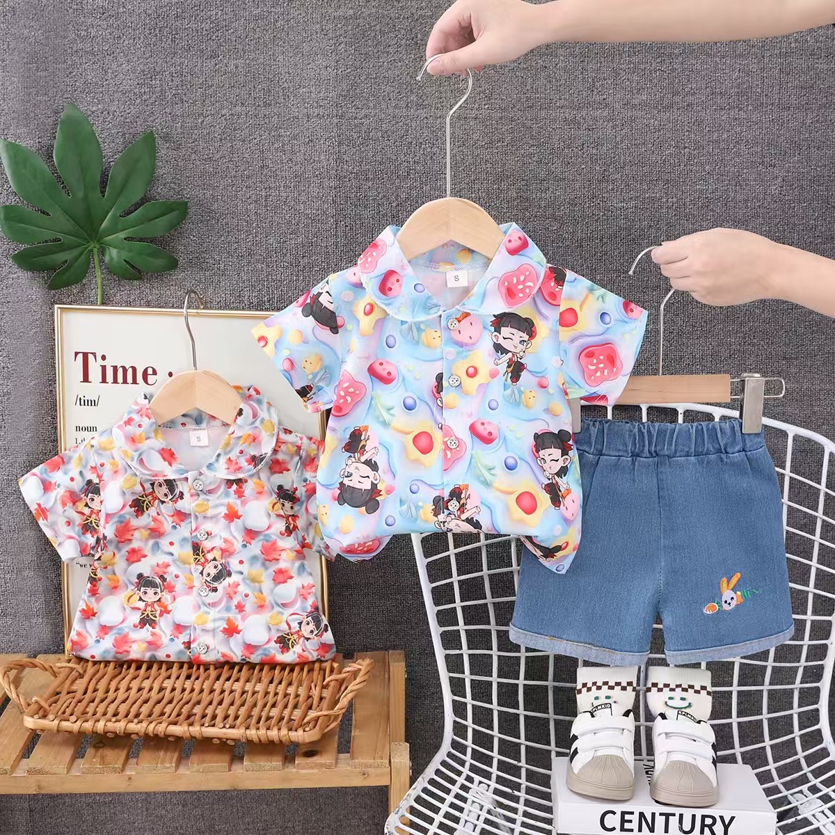 아동복 세트 여름 신작 남성과 여성의 얇은 입체 반팔 셔츠 탑과 바지 2개스토어 가기