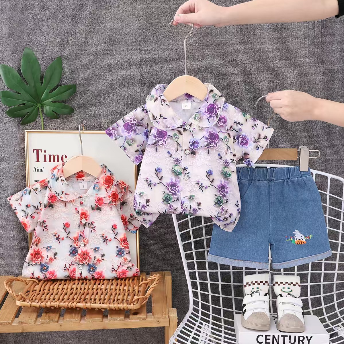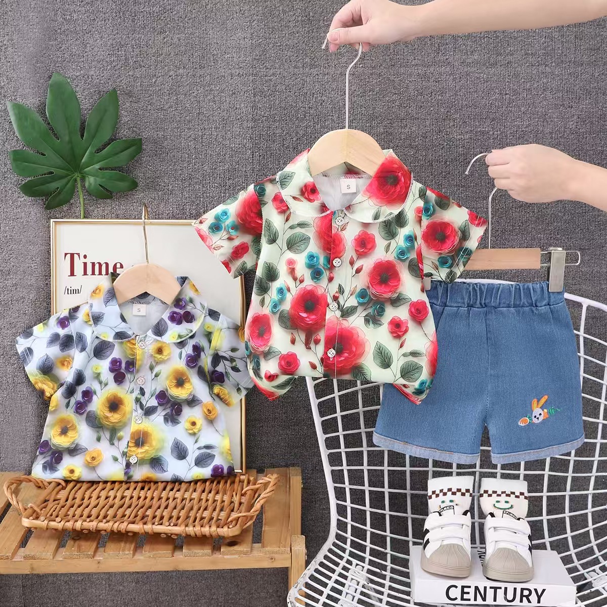아동복 세트 여름 신작 남성과 여성의 얇은 입체 반팔 셔츠 탑과 바지 2개