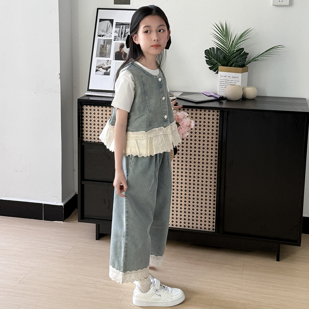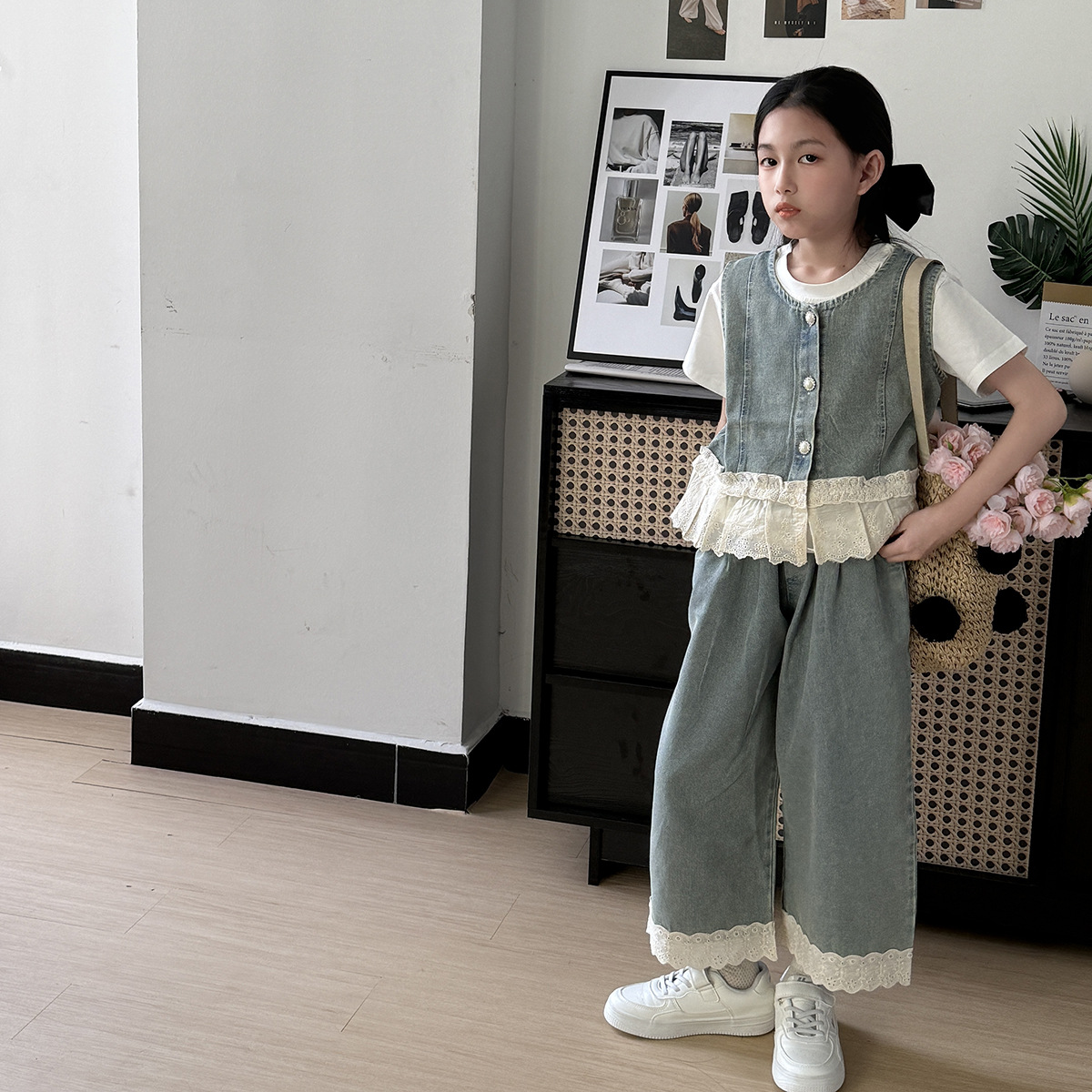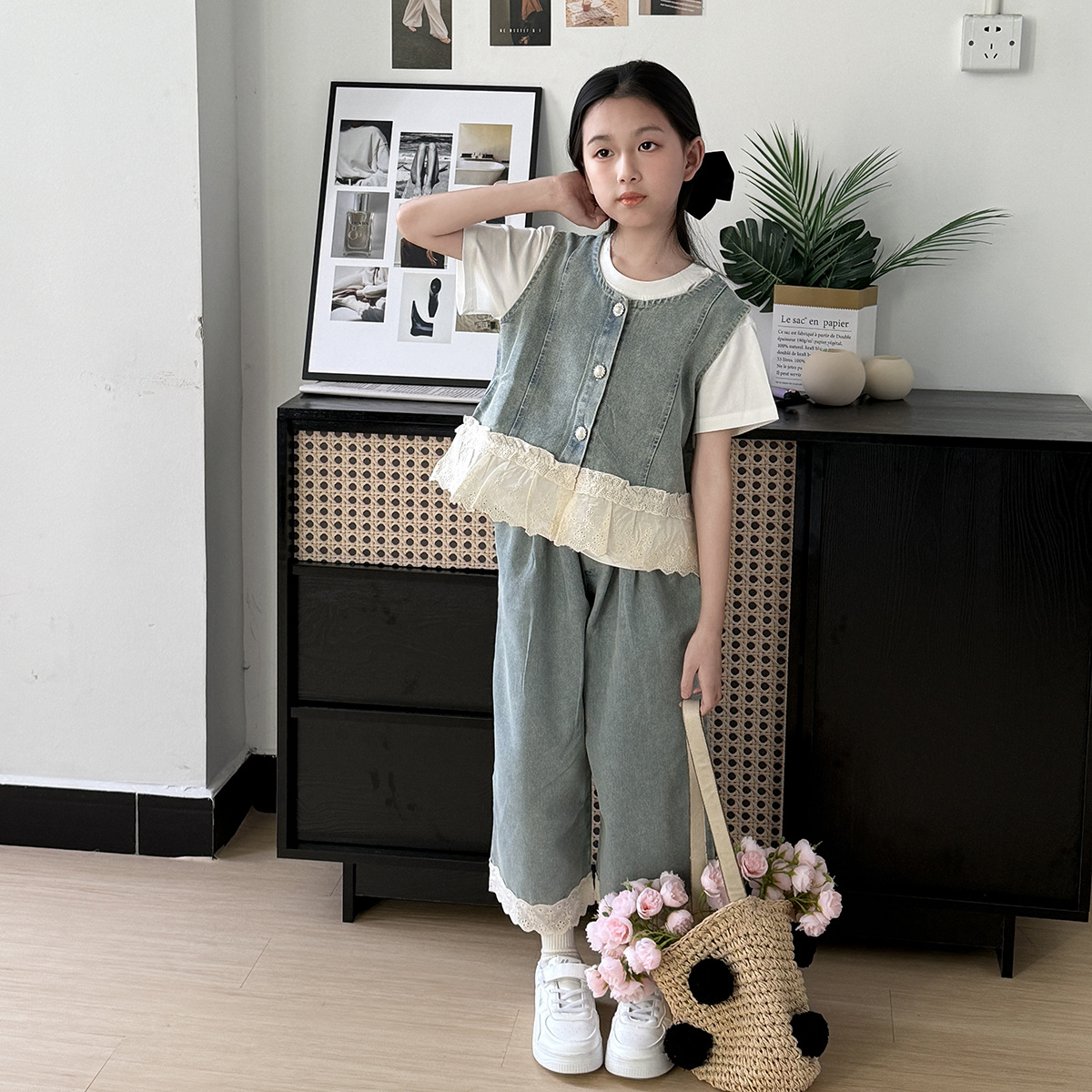 여자 새 조끼 레이스 내셔널 스타일 여름 세트 민소매 서양식 카프리 팬츠 화이트 티셔츠 3 피스 세트