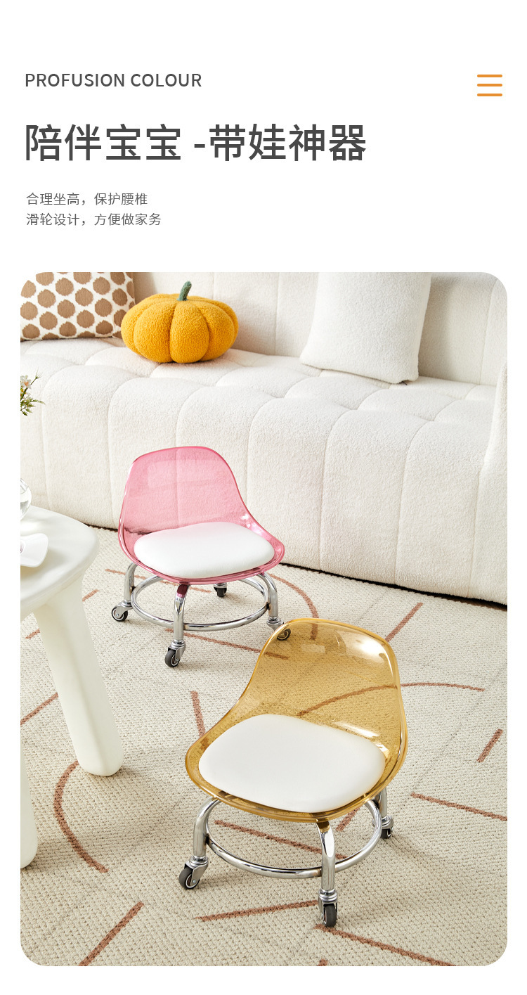 아크릴 가정용 유니버설 휠 아름다운 스티칭 조용한 의자 어린이 벨트 아기 학습 낮은 의자 그물 작은 의자 풀리