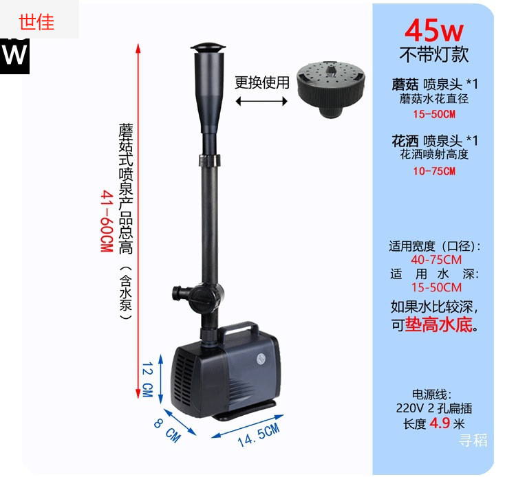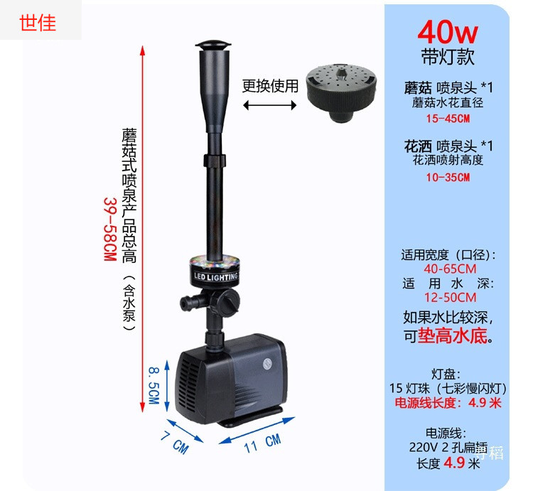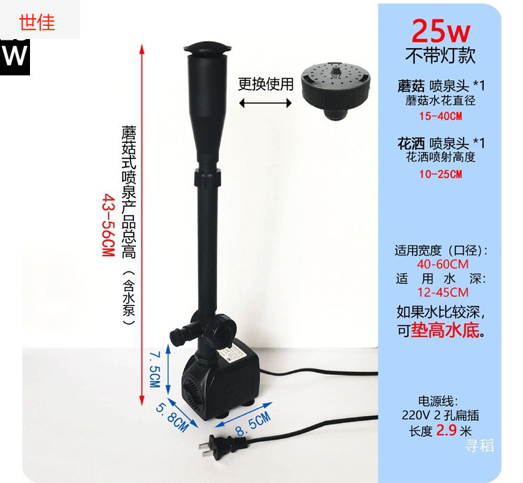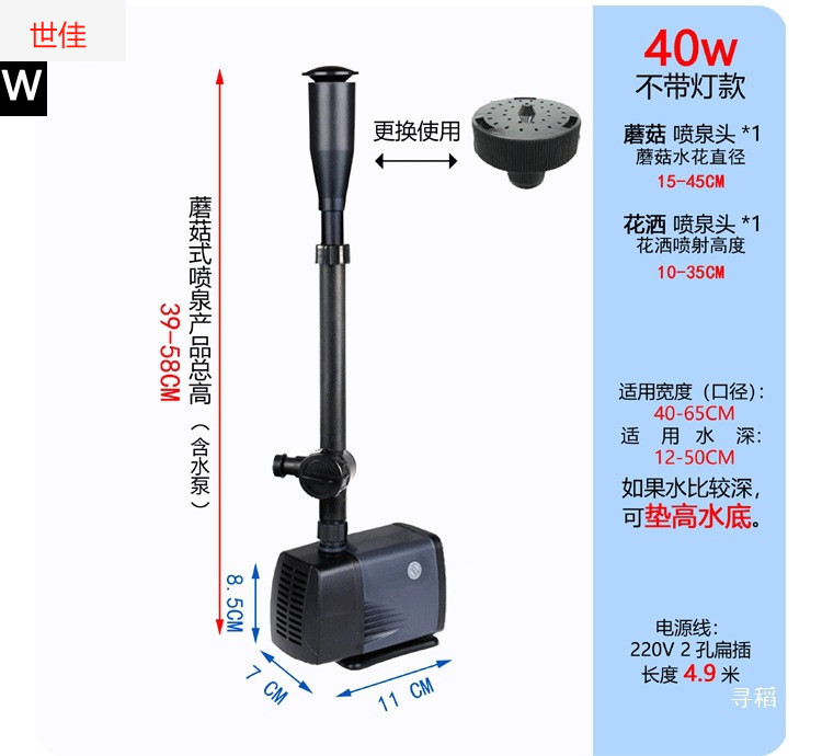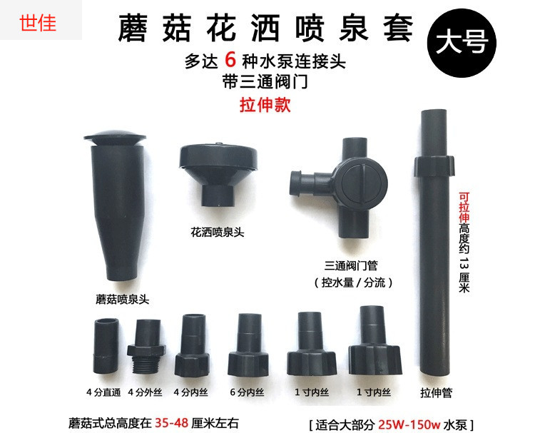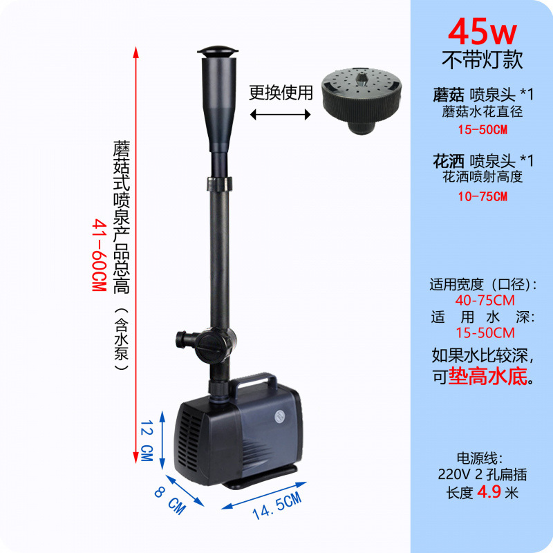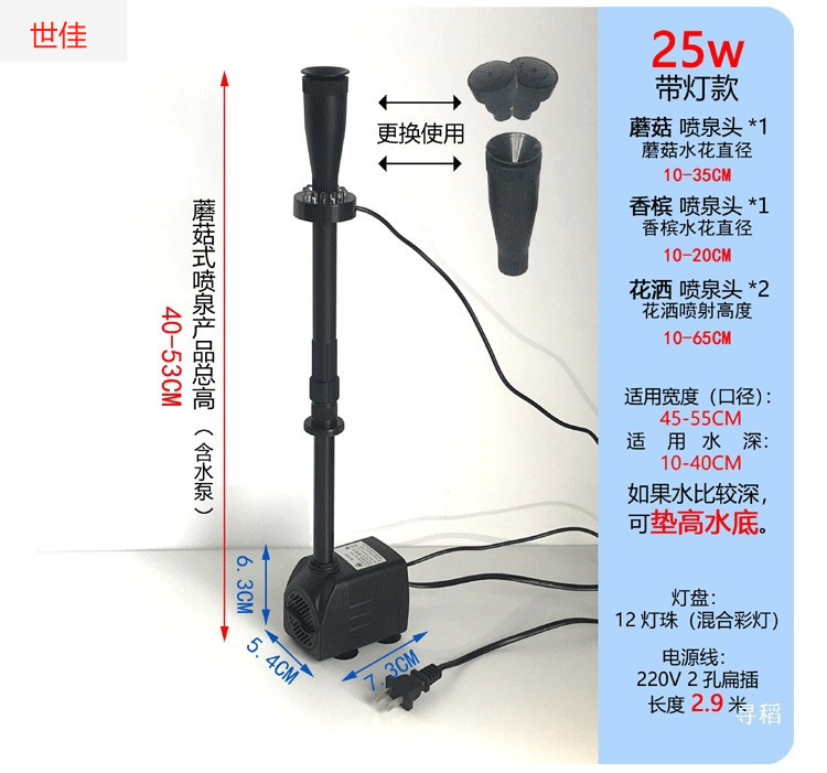 • 25W 워터 펌프(조명 포함) + 스트레치 분수 파이프 커버 소형 + 소형 램프 링 - 높이 40- 53cm