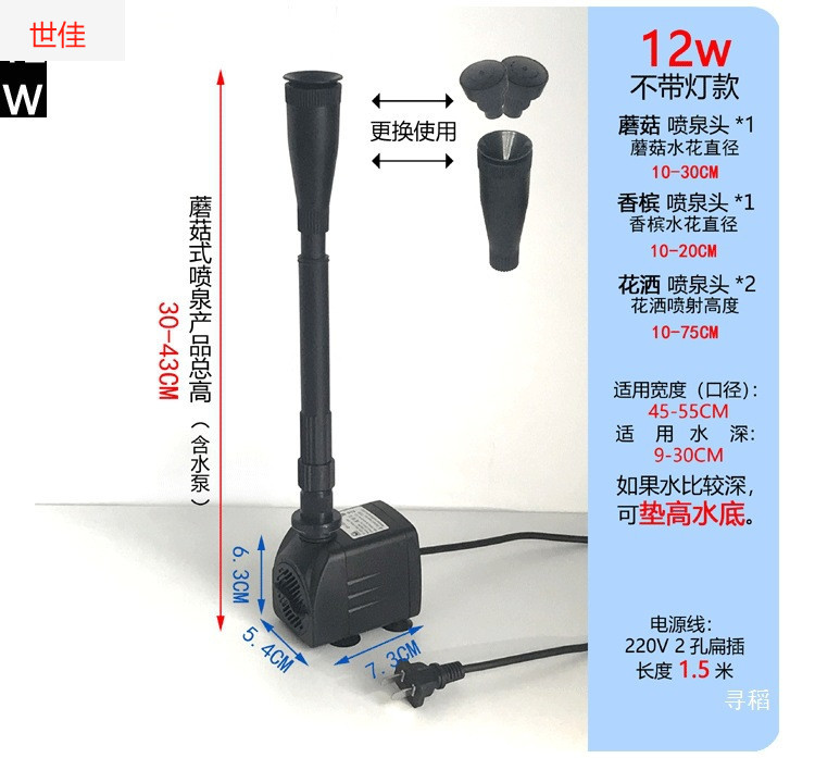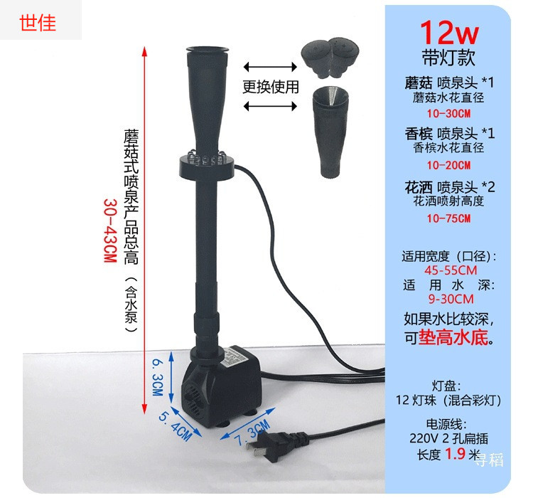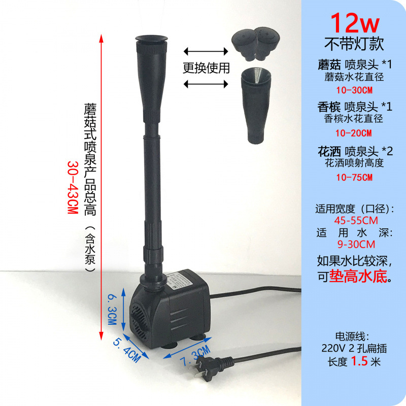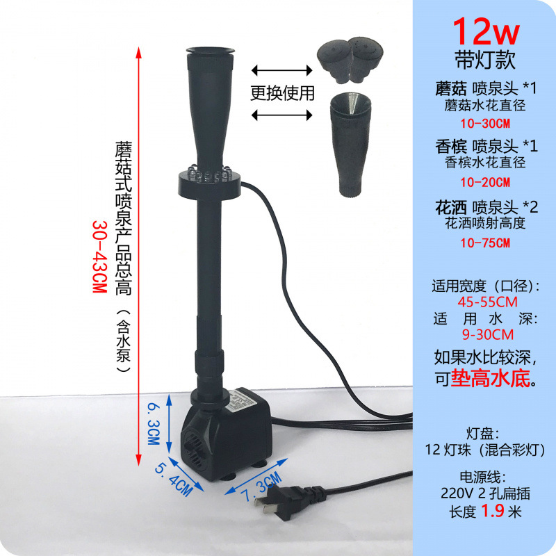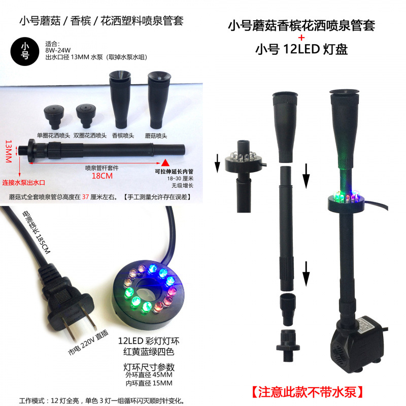 • 12W 워터 펌프 + 스트레치 분수 파이프 커버 소형 + 소형 라이트 링 - 높이 30- 43cm