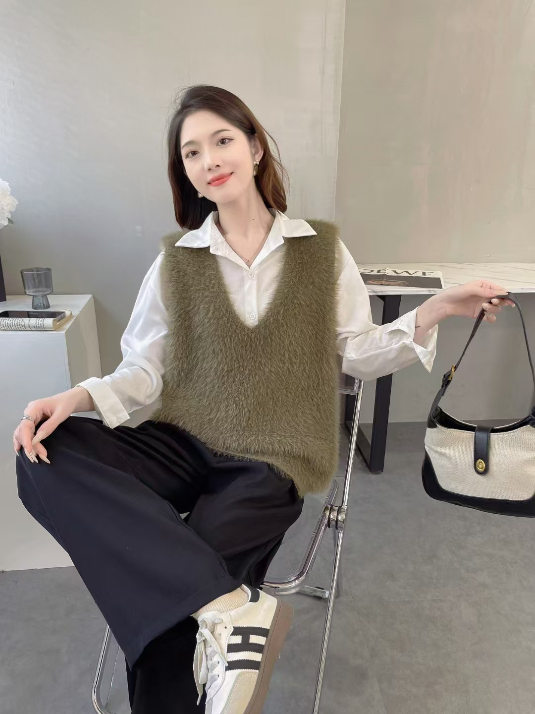 가을 겨울 여성용 모조 밍크 벨벳 브이넥 조끼 니트 조끼 솔리드 컬러 풀오버 민소매 패션 아우터 스웨터 조끼