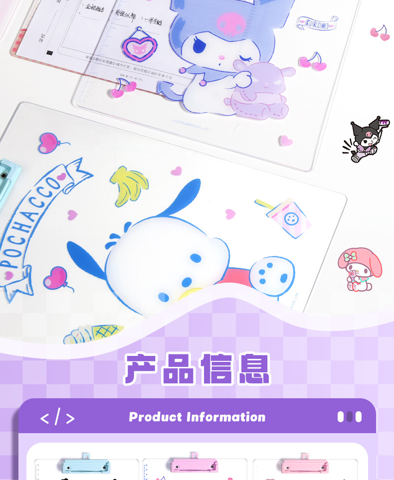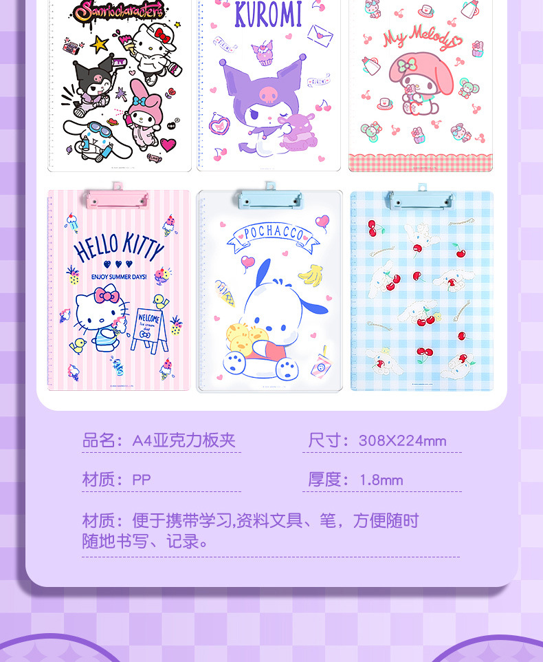 산리오 부목 아크릴 문구 학생 보드 클립 쿨로 미 귀여운 A4 데이터 테스트 종이 쓰기 스케치 패드