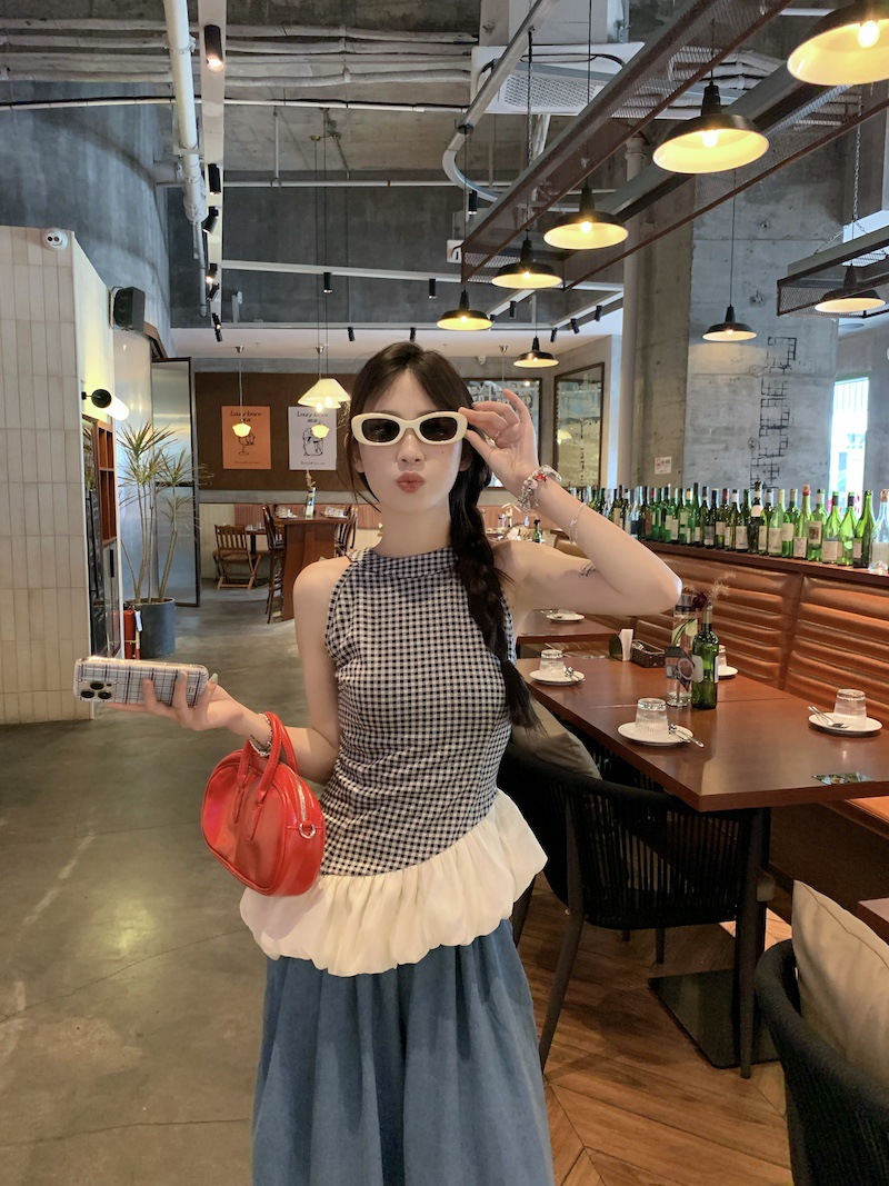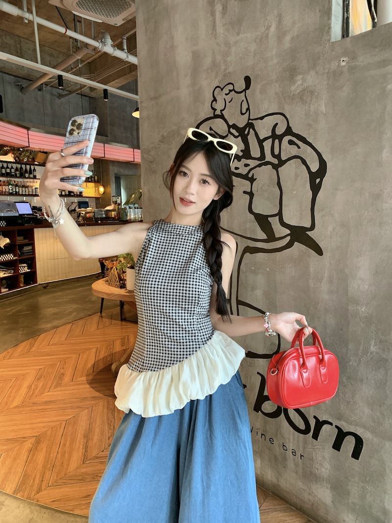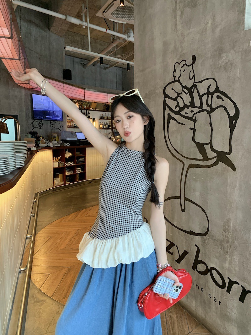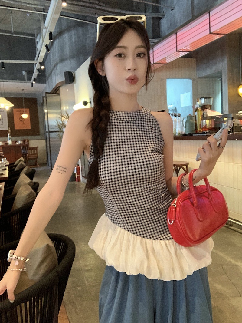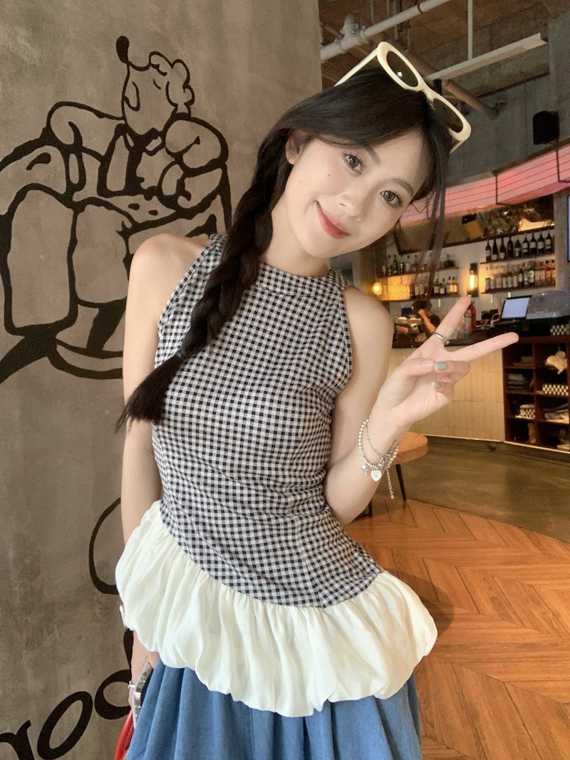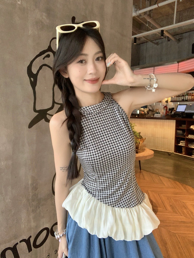 한국 스타일 틈새 스티칭 불규칙한 격자 무늬 조끼 여성 여름 디자인 세련된 외부는 민소매 허리 타이트탑