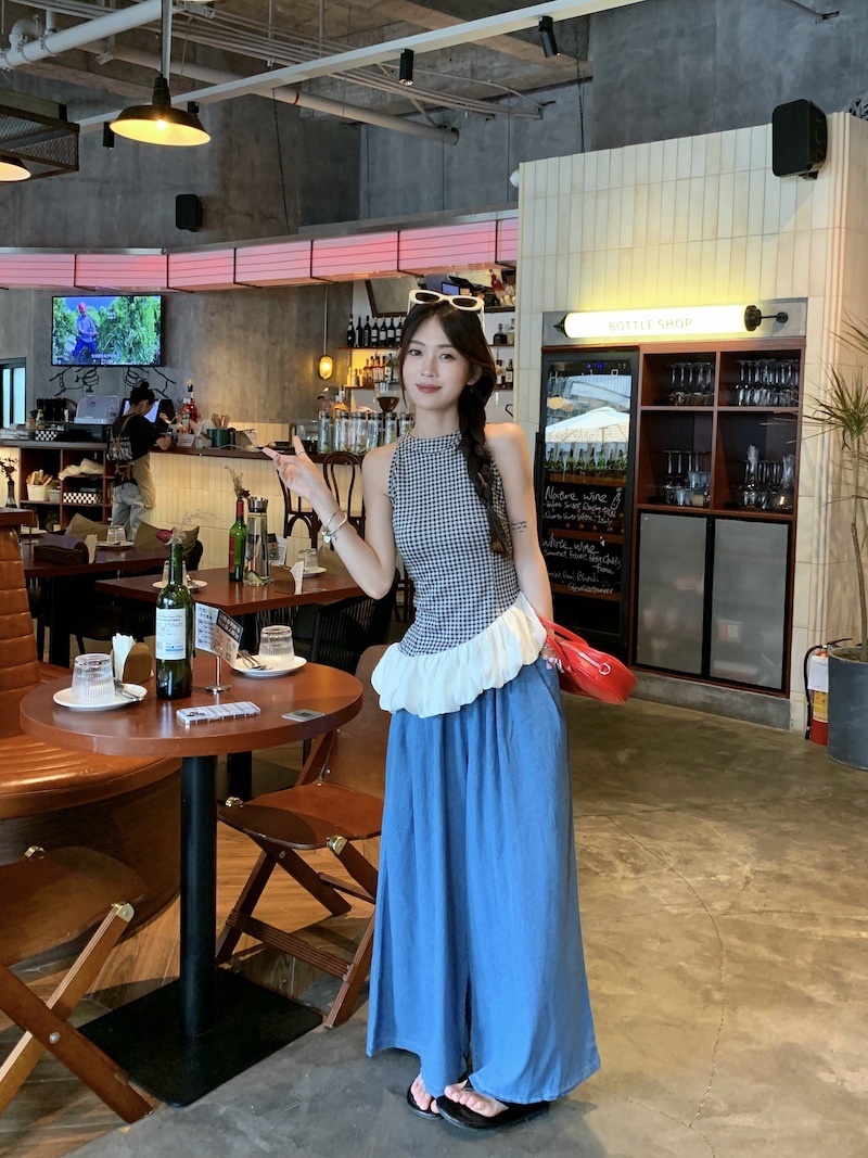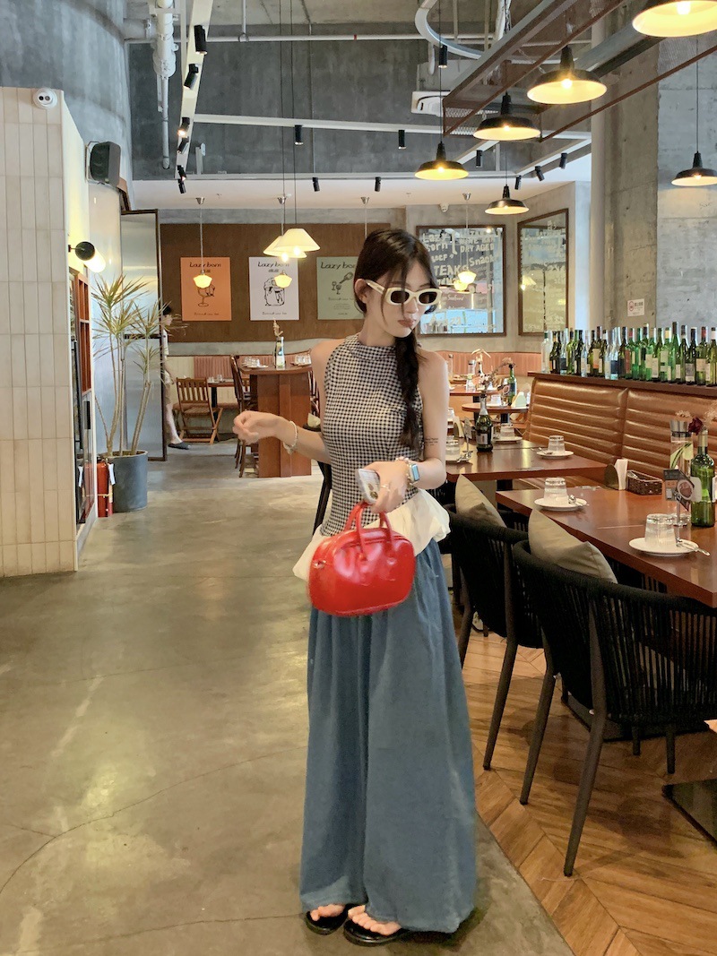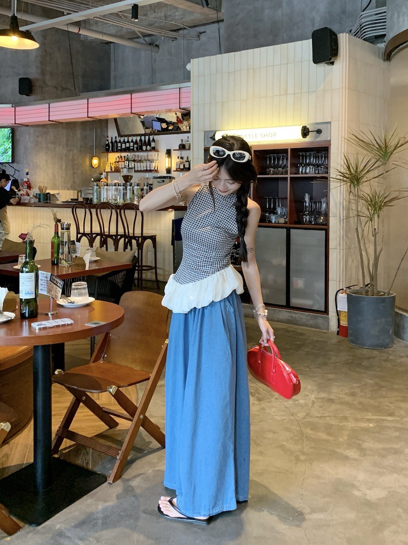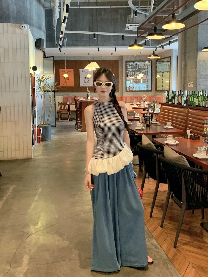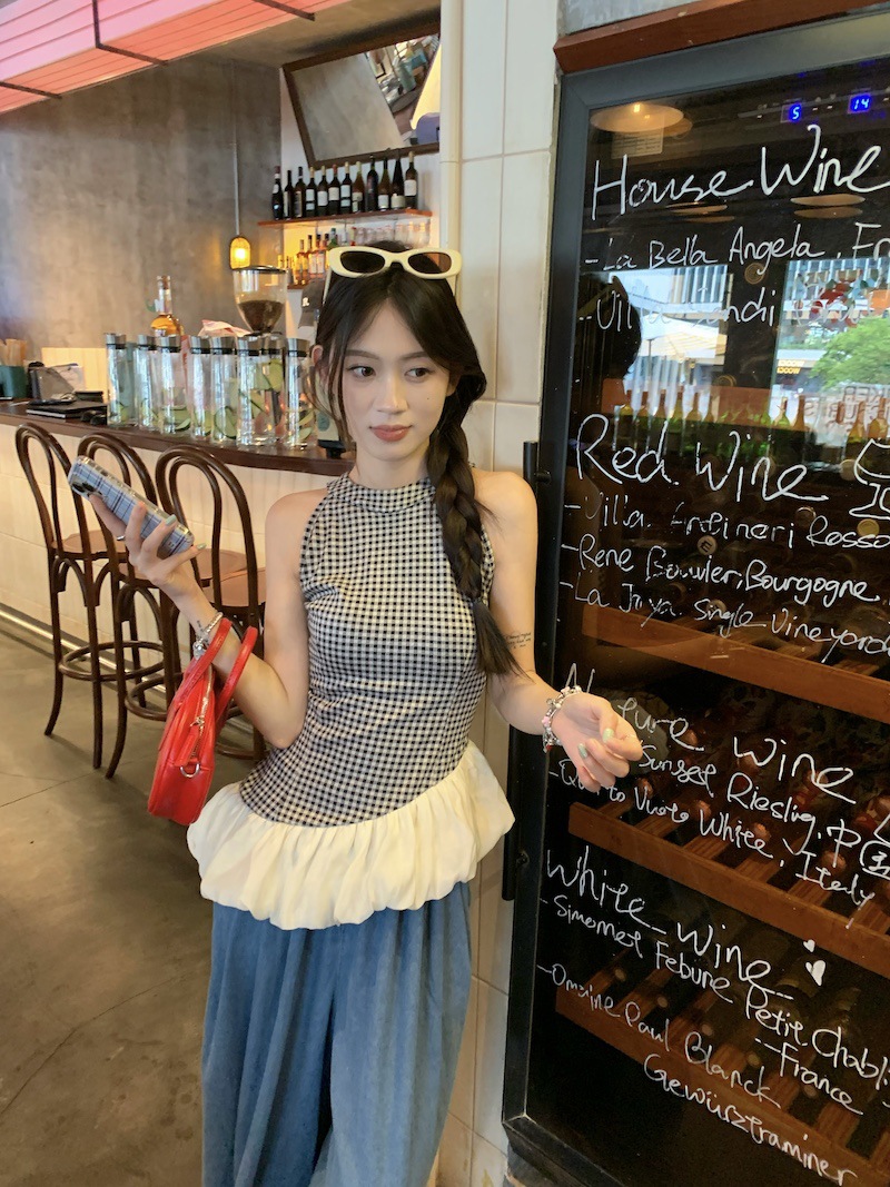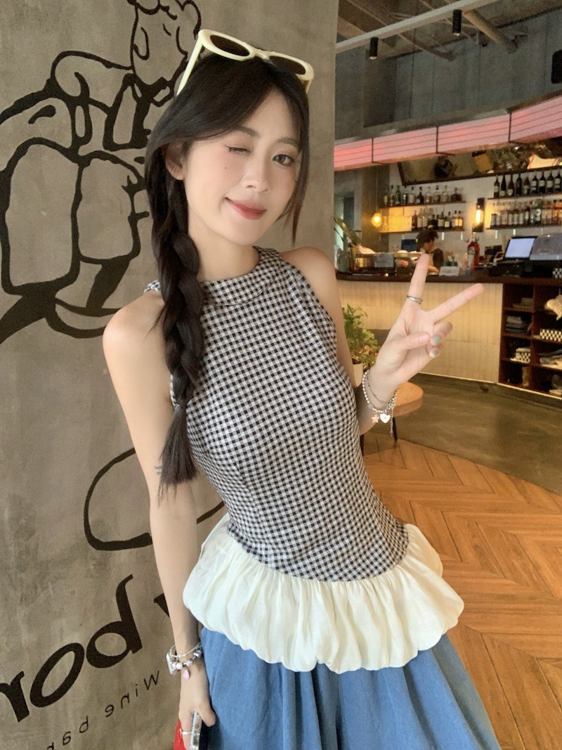 한국 스타일 틈새 스티칭 불규칙한 격자 무늬 조끼 여성 여름 디자인 세련된 외부는 민소매 허리 타이트탑