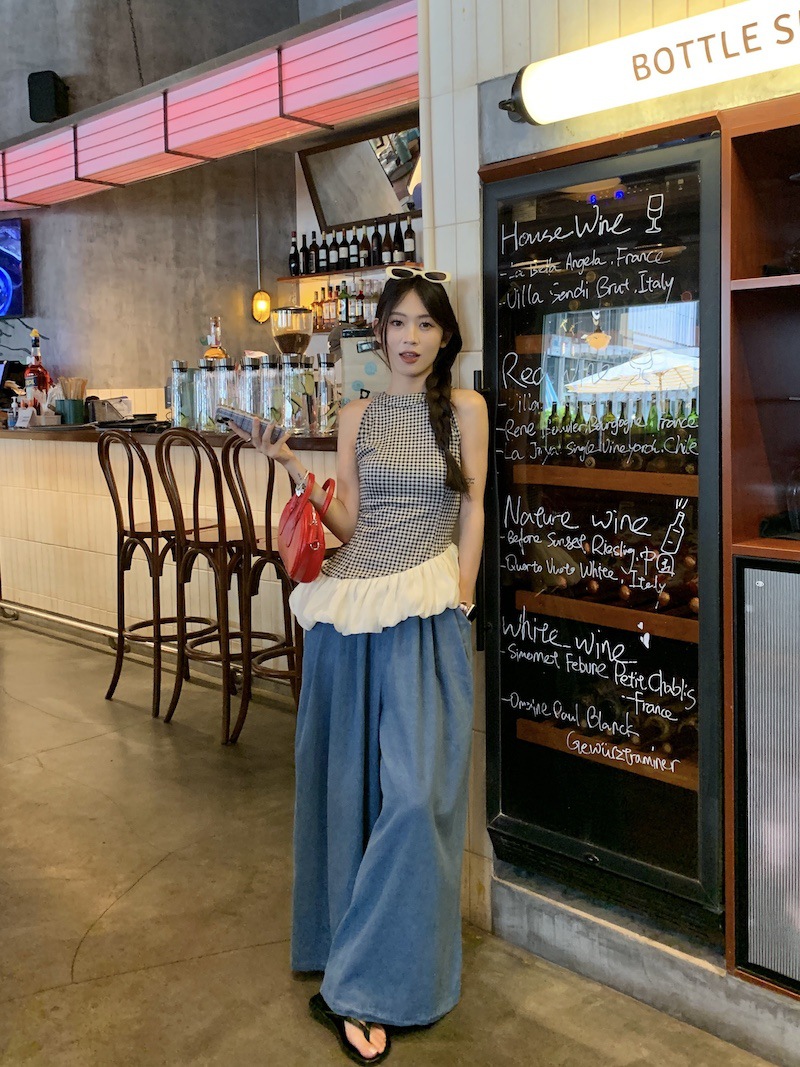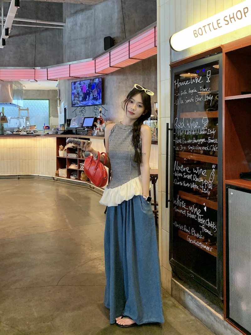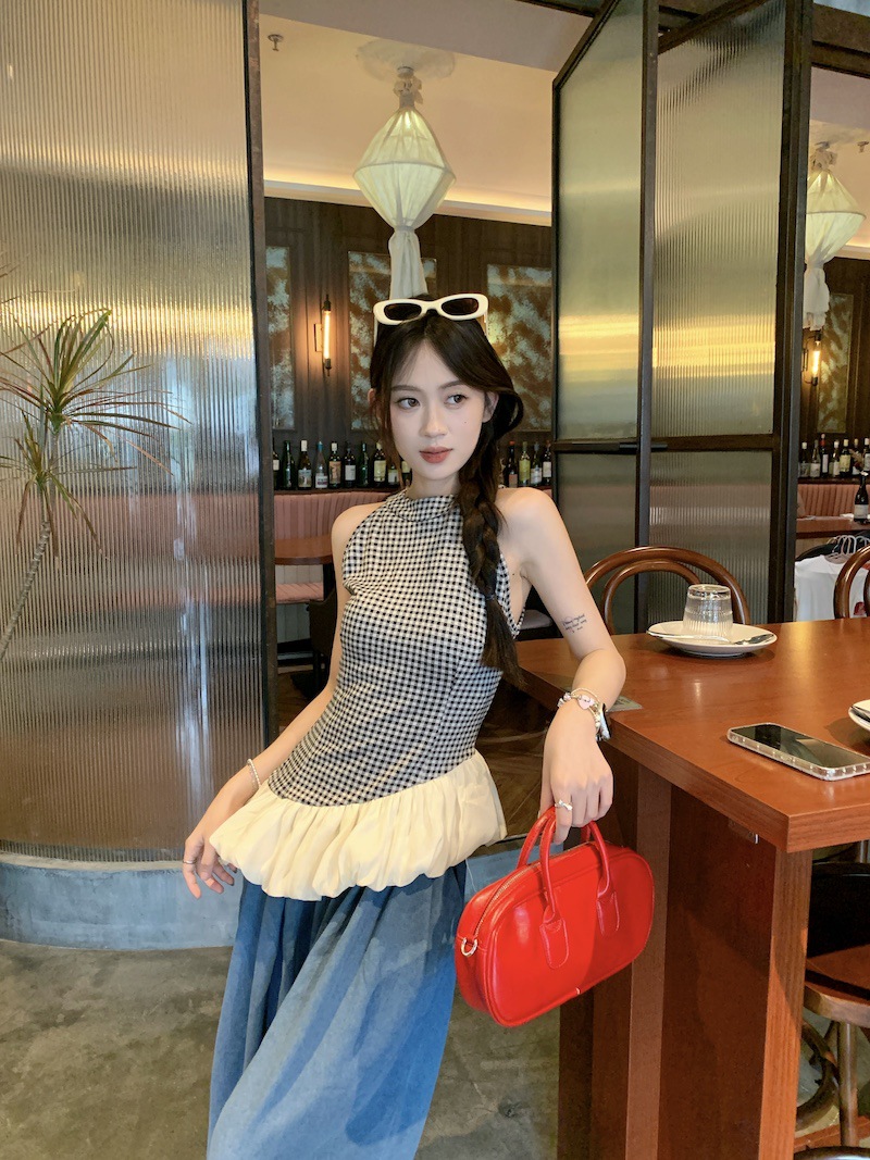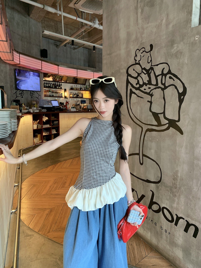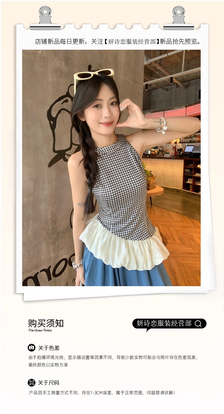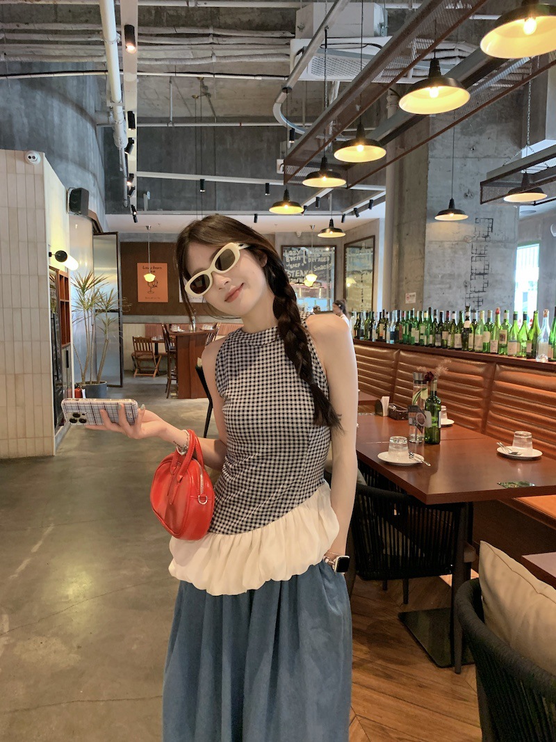 한국 스타일 틈새 스티칭 불규칙한 격자 무늬 조끼 여성 여름 디자인 세련된 외부는 민소매 허리 타이트탑스토어 가기