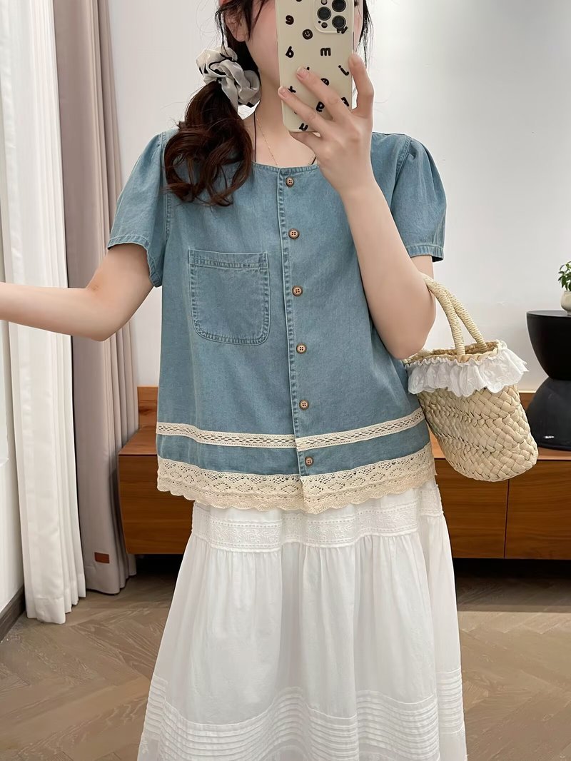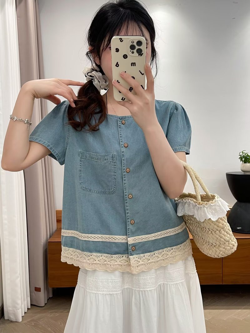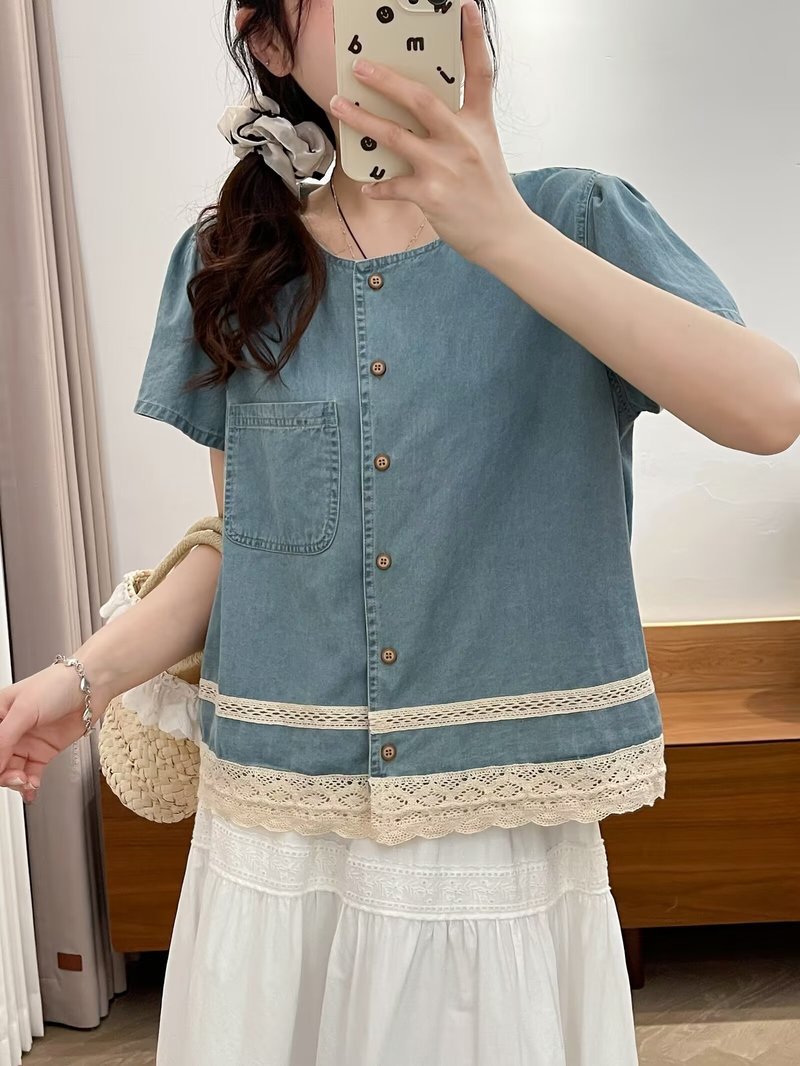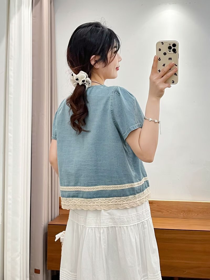 짧은 소매 셔츠 작은 셔츠 도매를 데님 씻은 새로운 레이스 스티칭 둥근 목의 한국어 버전스토어 가기
