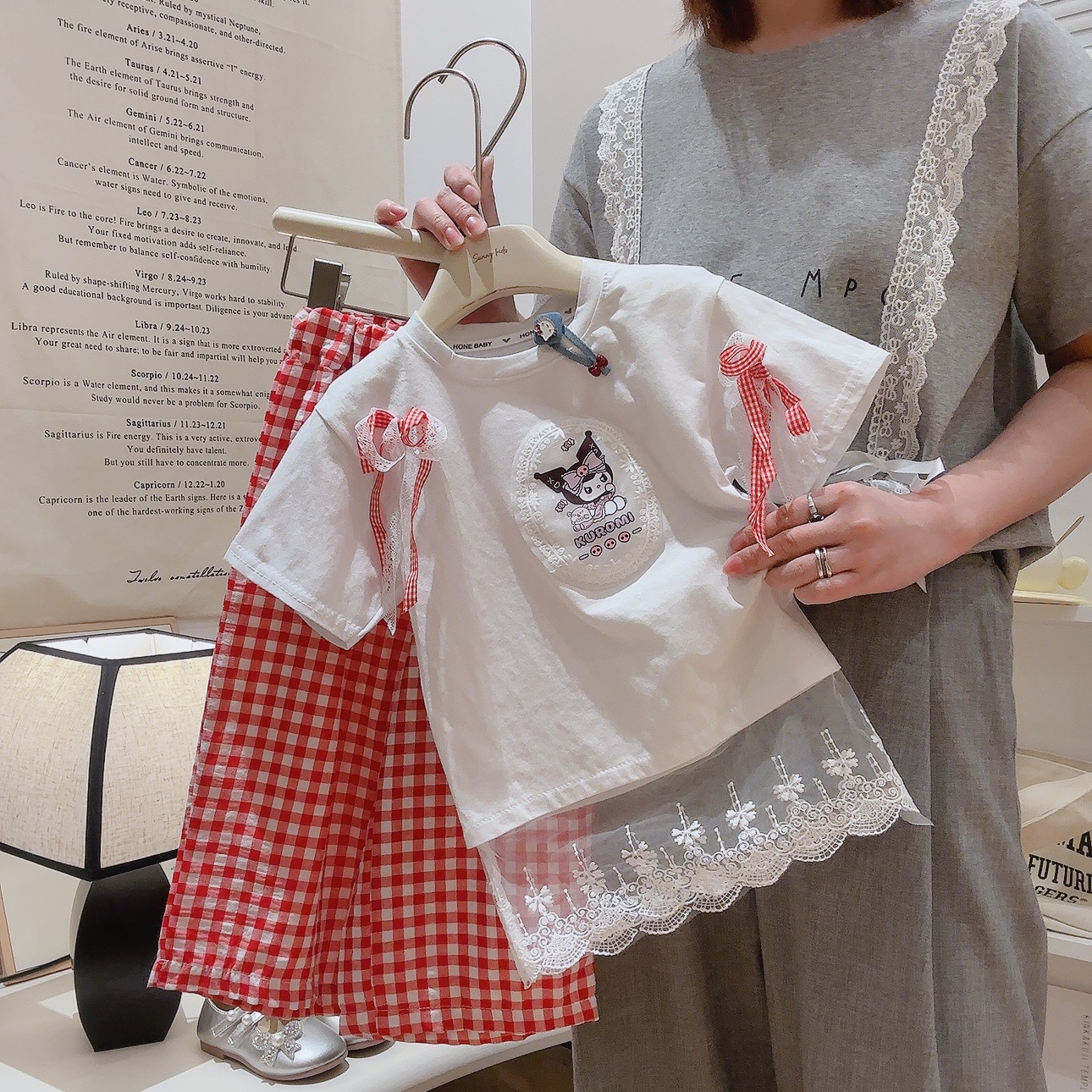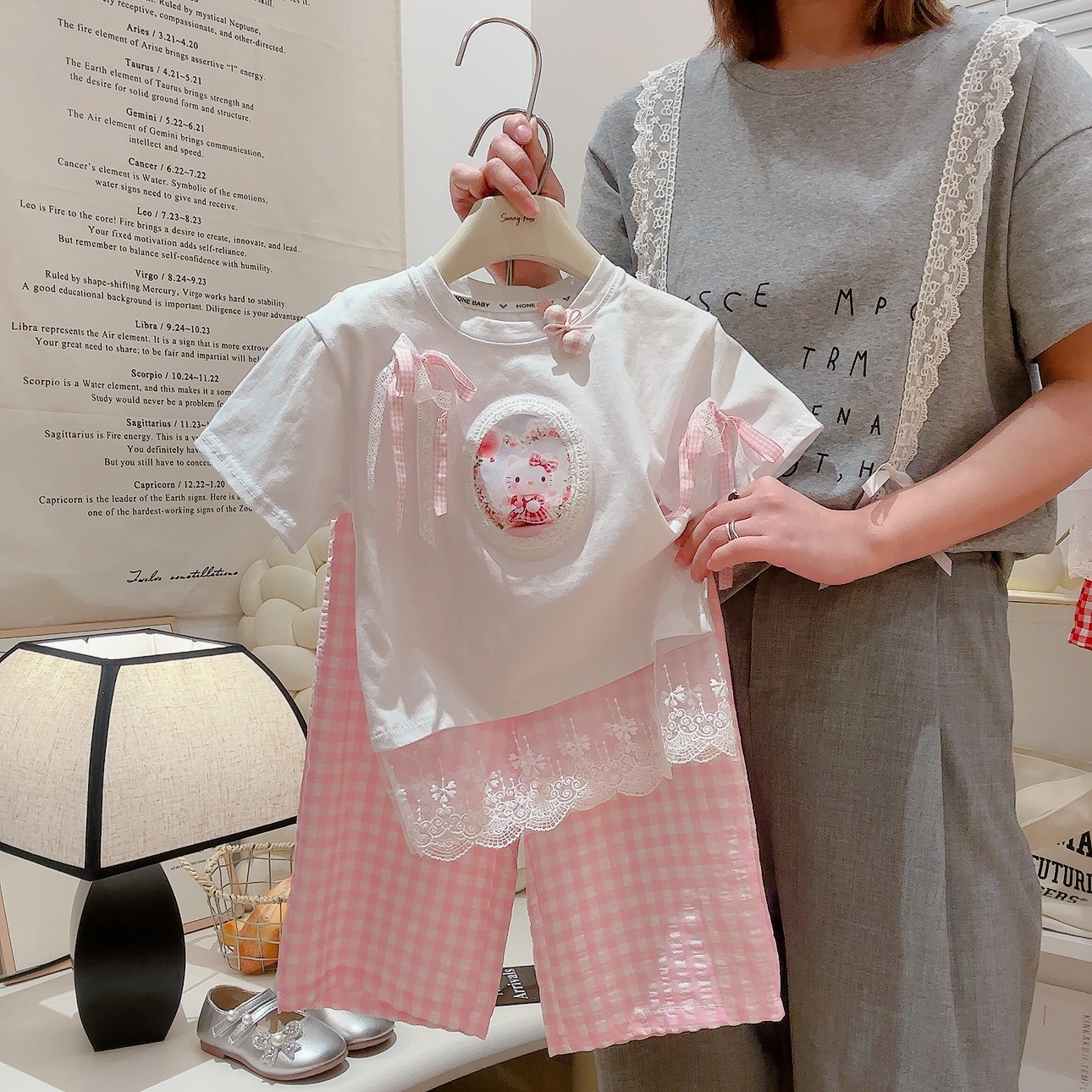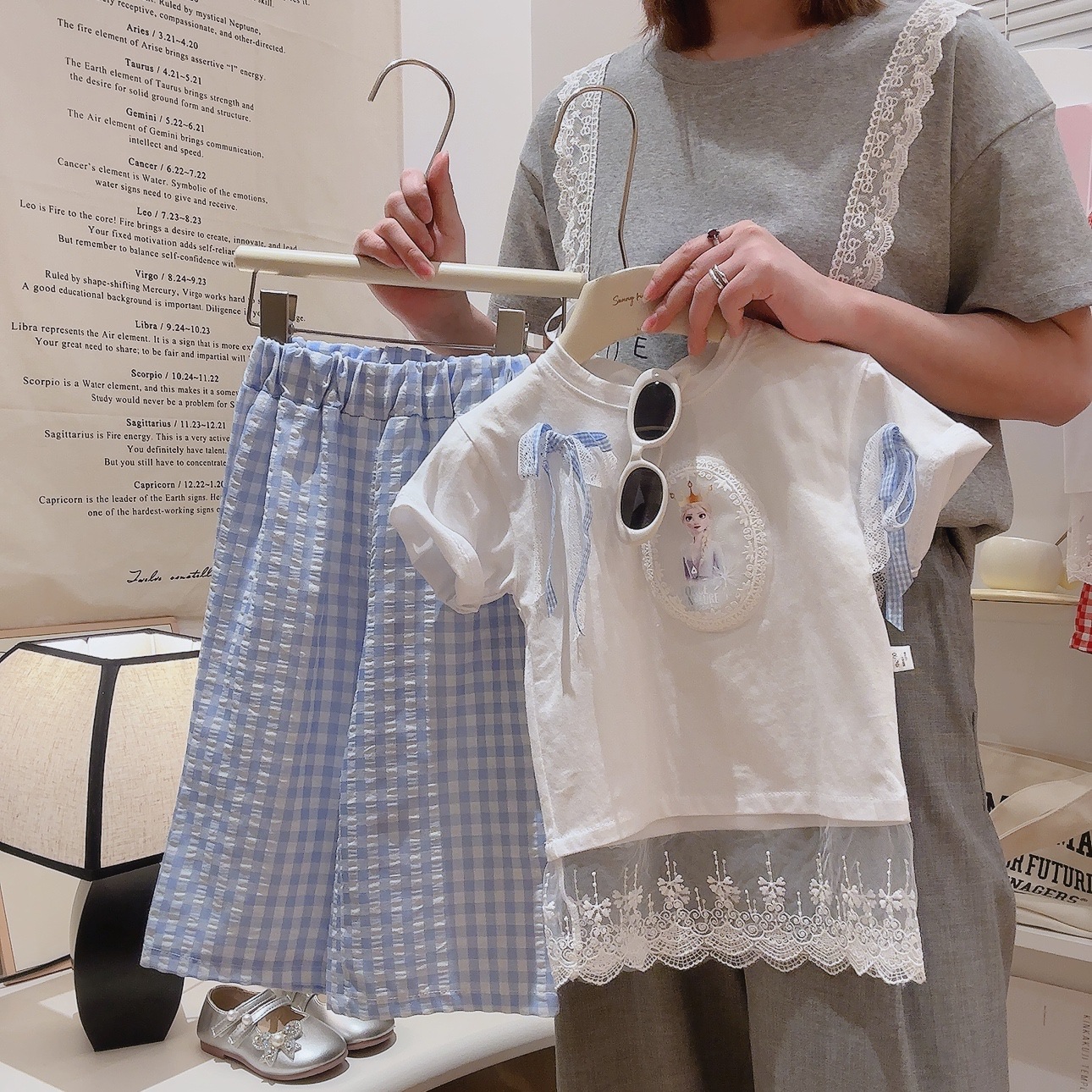 부모-아이 선호 세트 레이스 레이스 활 티셔츠 체크 스트레이트 바지 투피스 세트 달콤한 소녀 투피스 세트스토어 가기