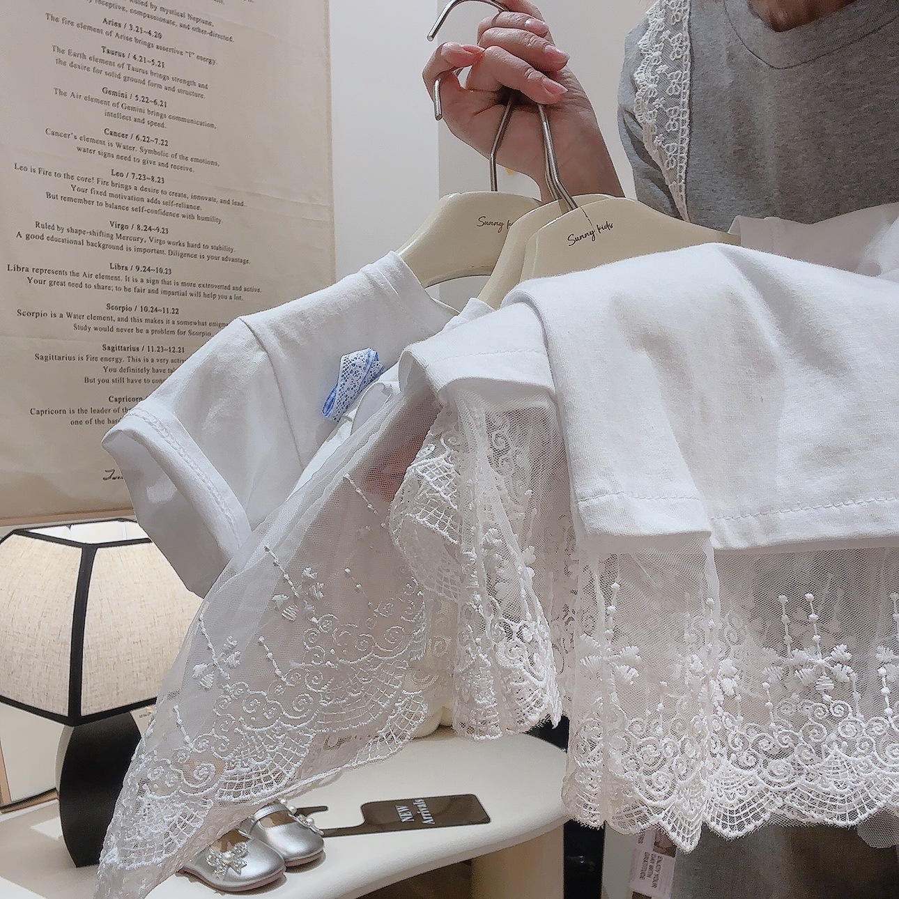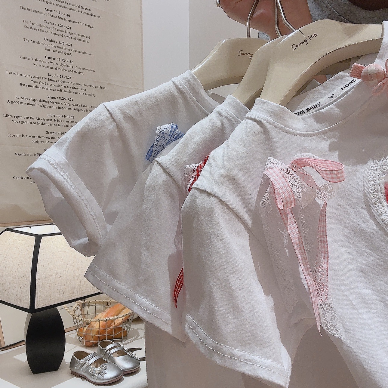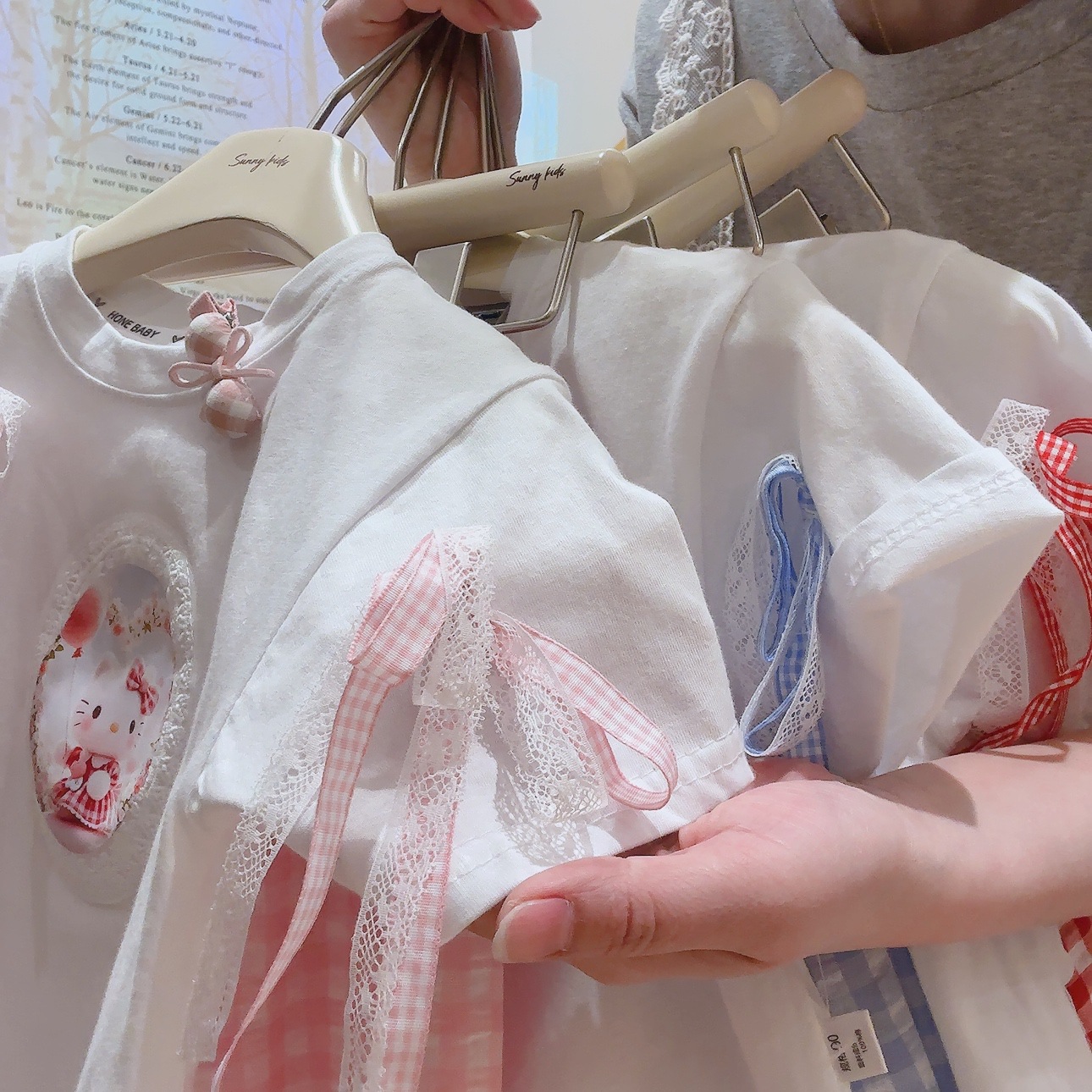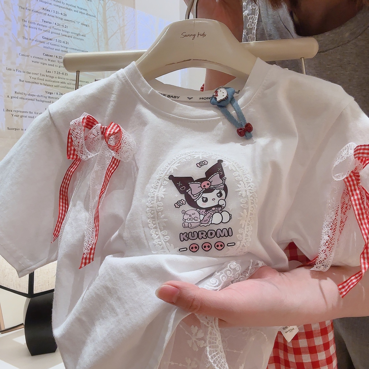 부모-아이 선호 세트 레이스 레이스 활 티셔츠 체크 스트레이트 바지 투피스 세트 달콤한 소녀 투피스 세트스토어 가기