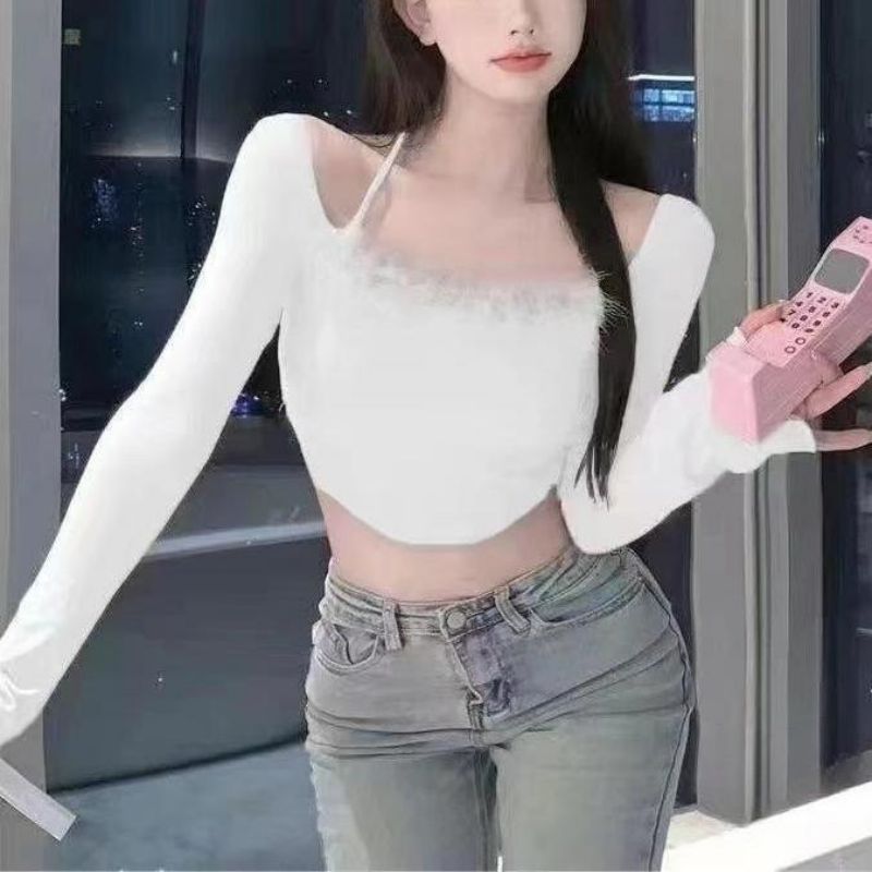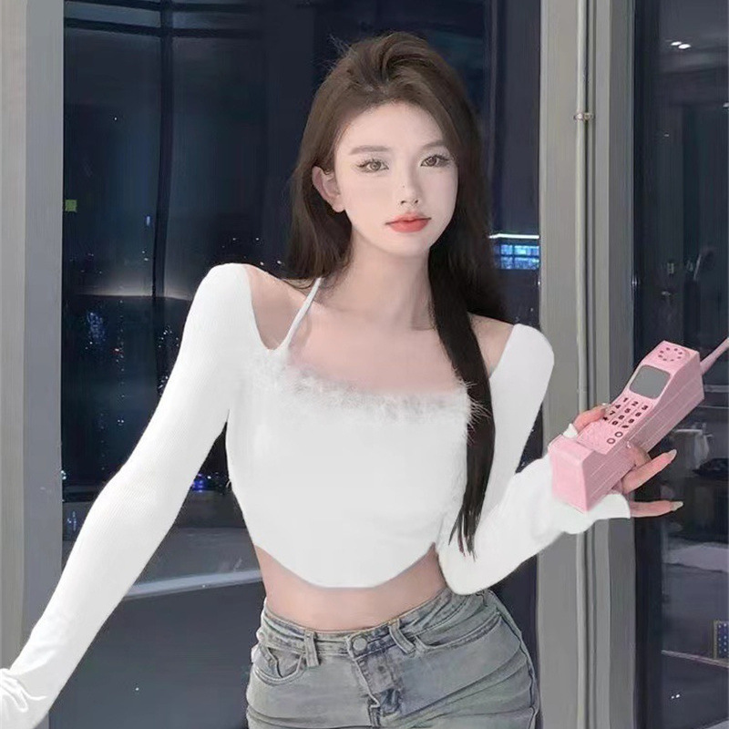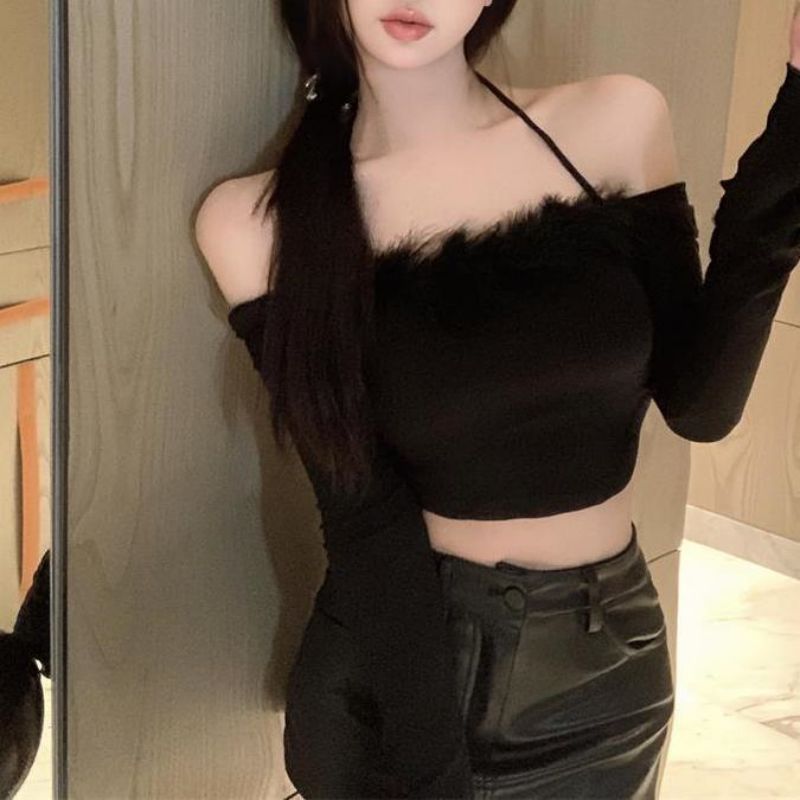 2025 가을 여성 스웨터 디자인 핫 소녀 스타일 홀터넥 오프 숄더 모피 칼라 하이 웨이스트 긴팔 스웨터 탑스토어 가기