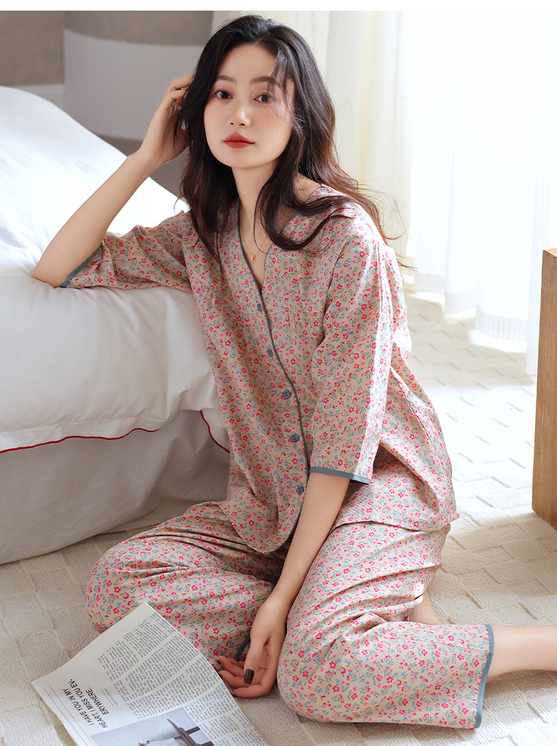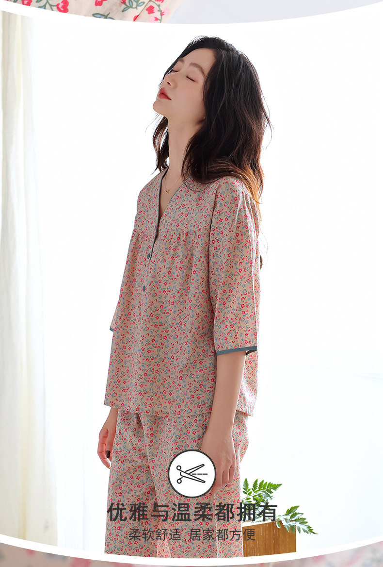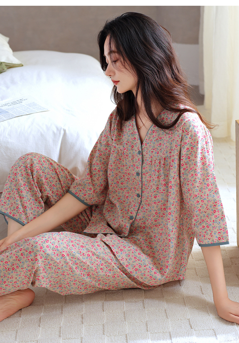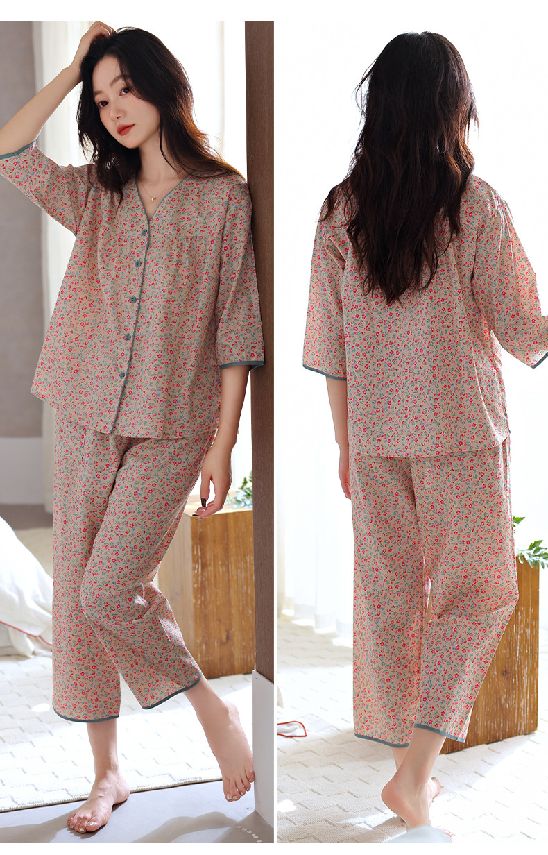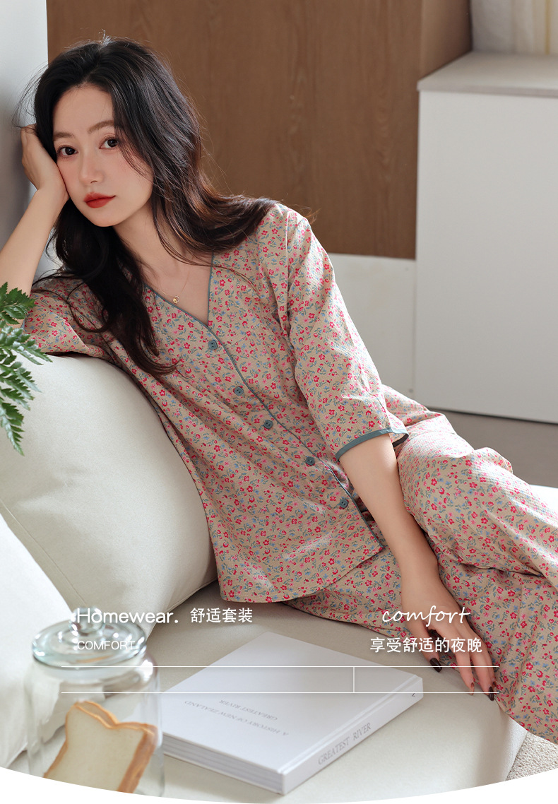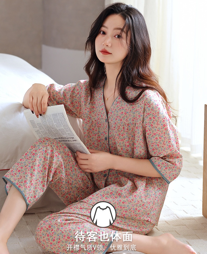 잠옷 여성의 여름 구름 면 7 점 소매 봄과 여름 얇은 플러스 사이즈 여름 홈 옷은 새로운 스타일의 세트 입을 수 있습니다