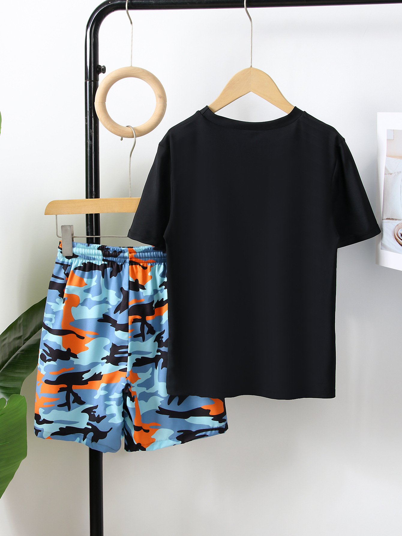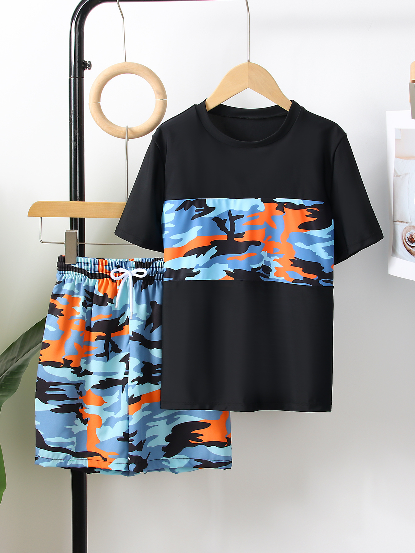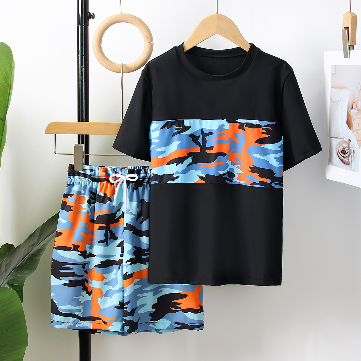 어린이 수영복 소년 스플릿 수영복 2025 새로운 반팔 비치 반바지 속건성 위장 소년 수영복