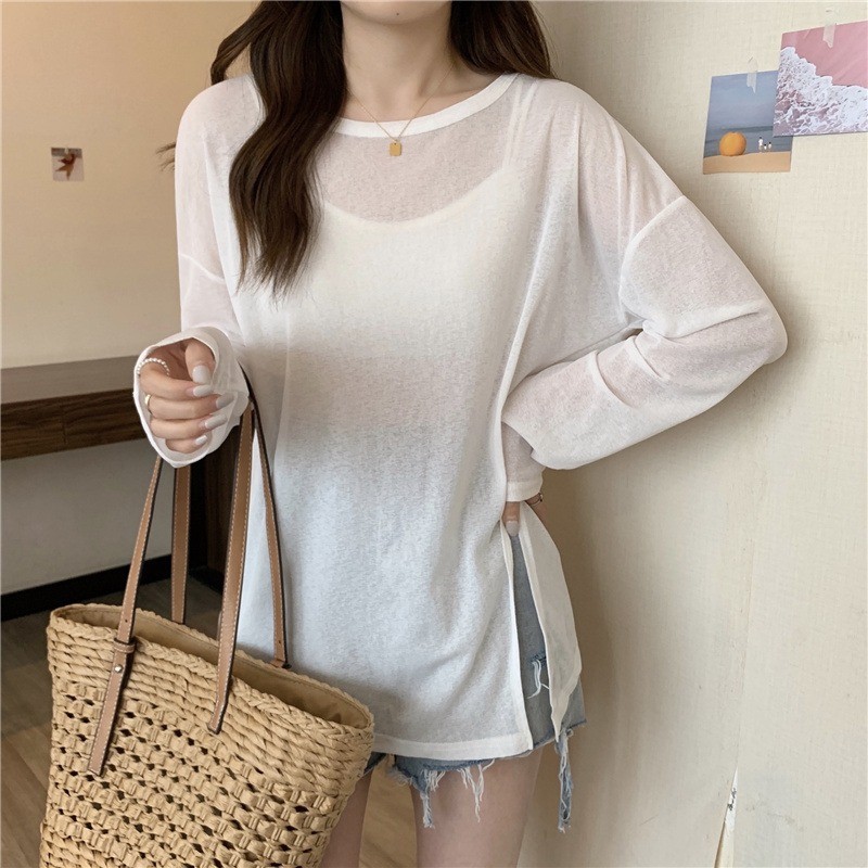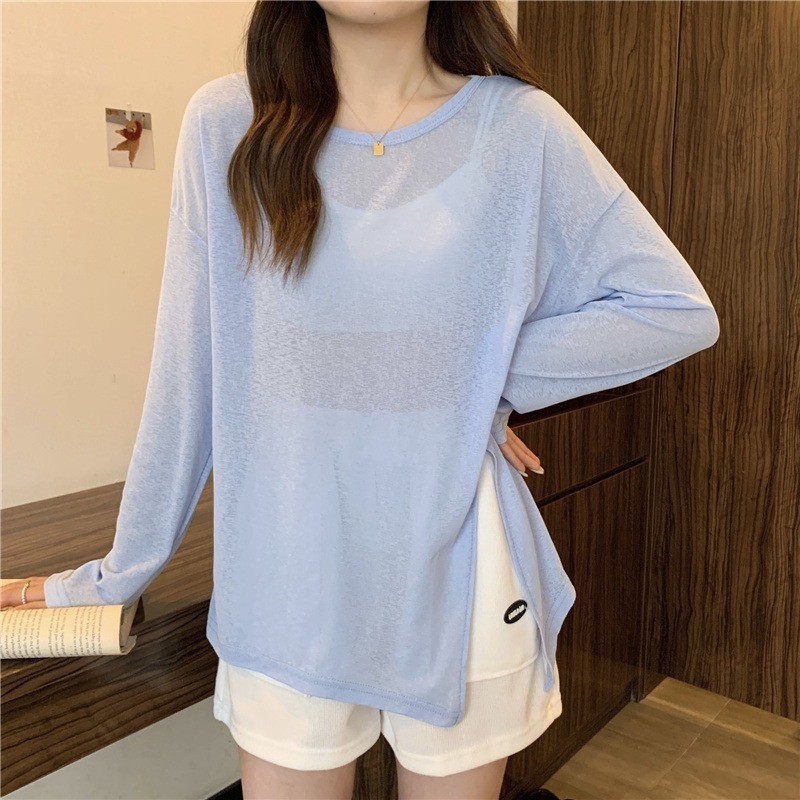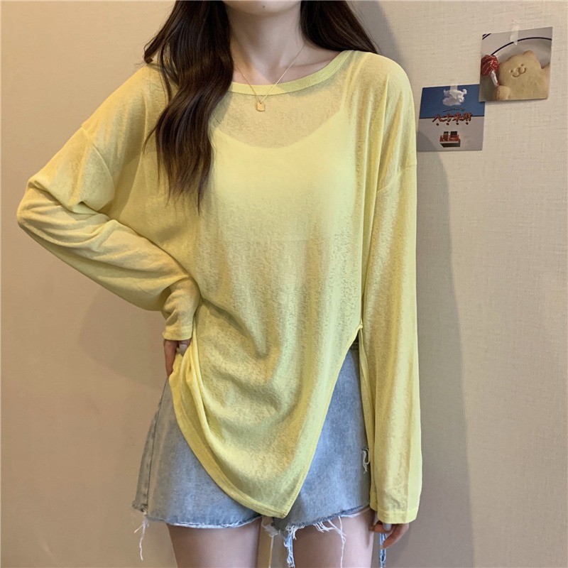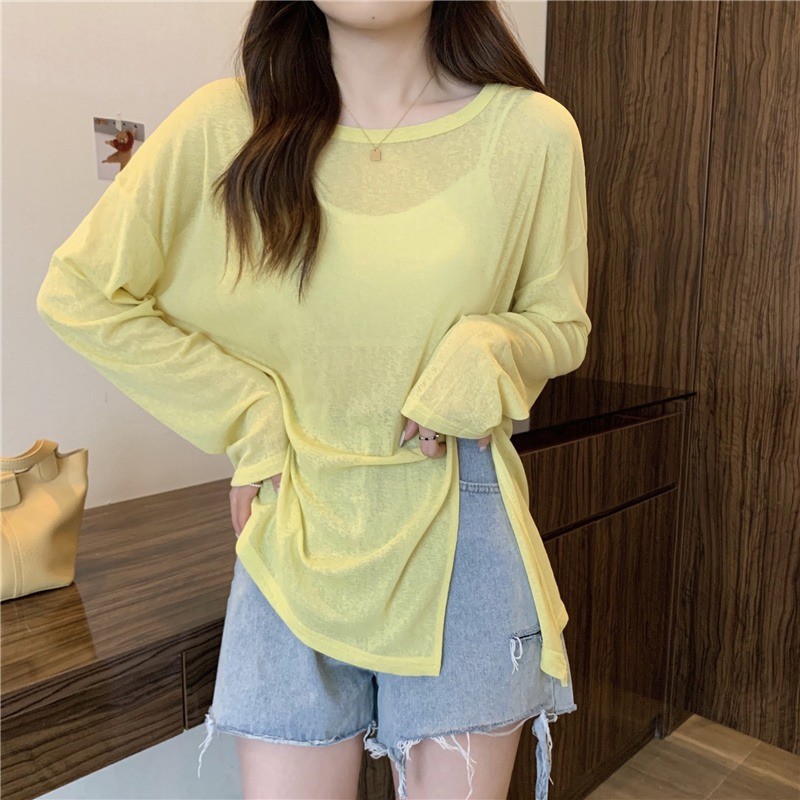 얇은 반투명 슬릿 디자인 자외선 차단 긴팔 티셔츠 여성용 여름 캔디 컬러 루즈핏 에어컨 커버업 2025 통기성 가볍고 얇음