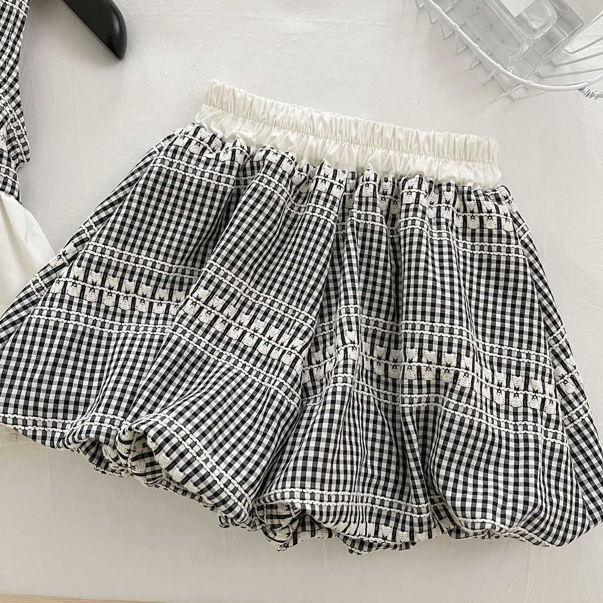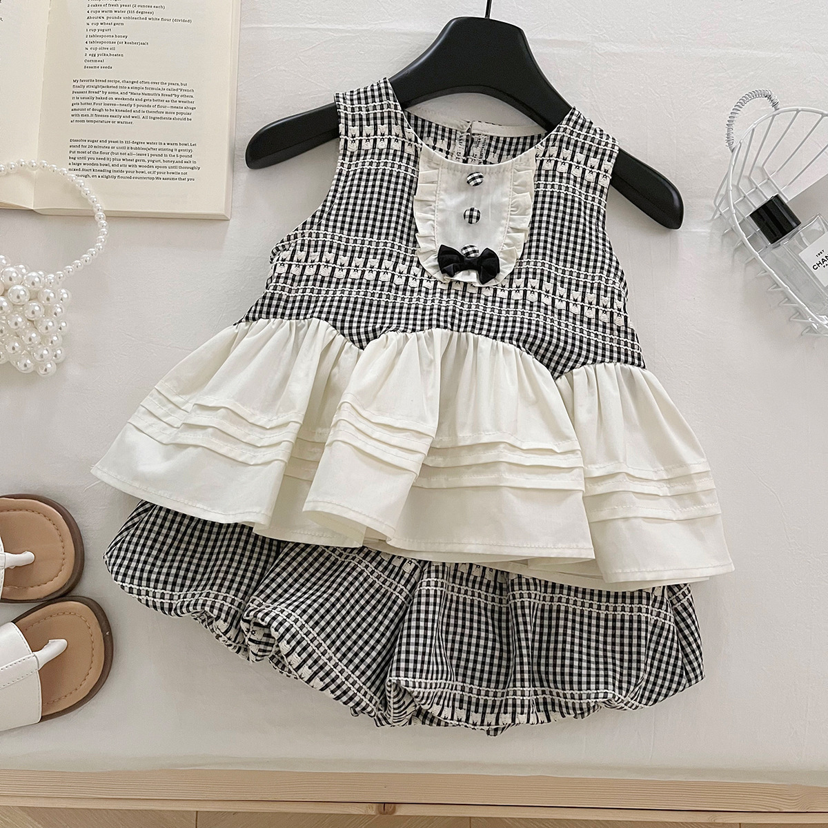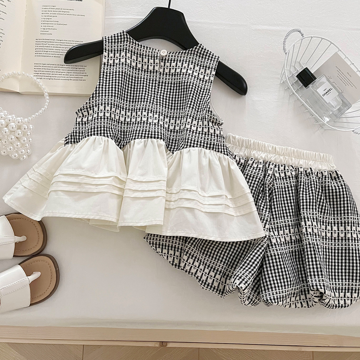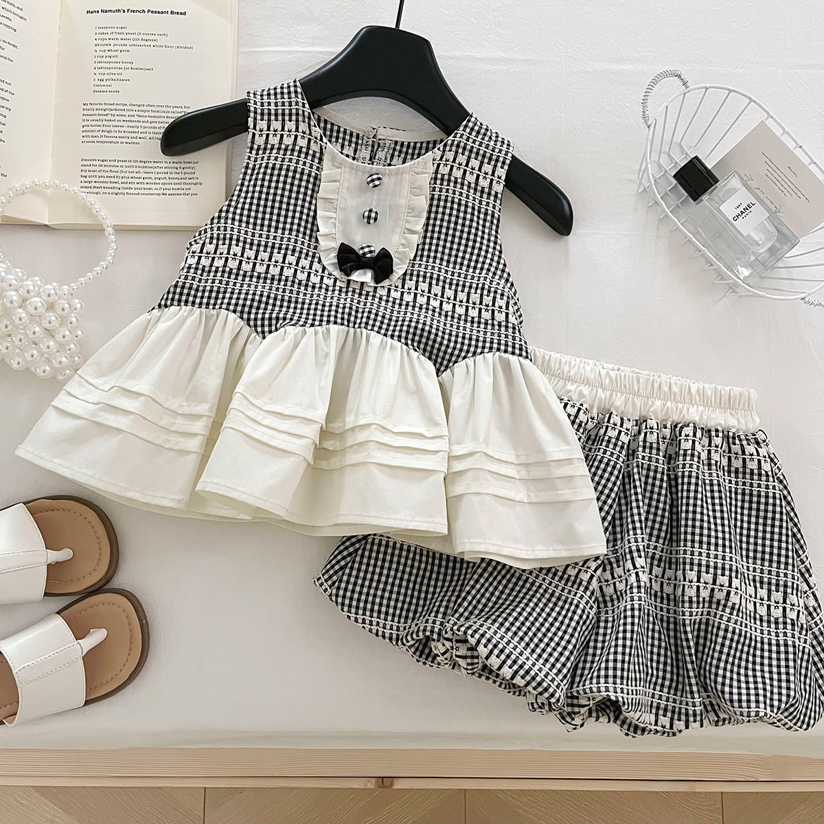 2025 새로운 여름 한국 스타일 소녀 민소매 조끼 드레스 반바지 투피스 세트 어린이 스타일 격자 무늬 세트스토어 가기