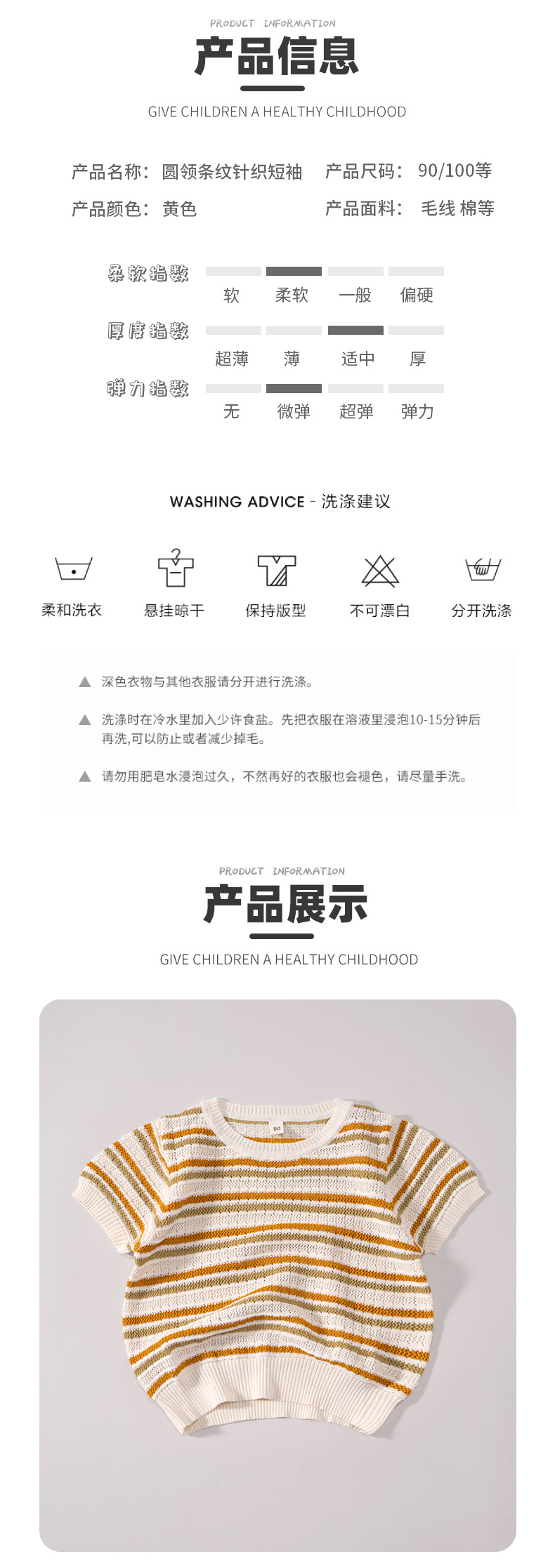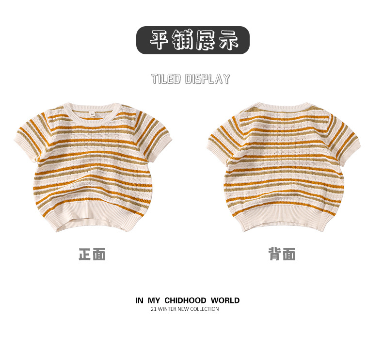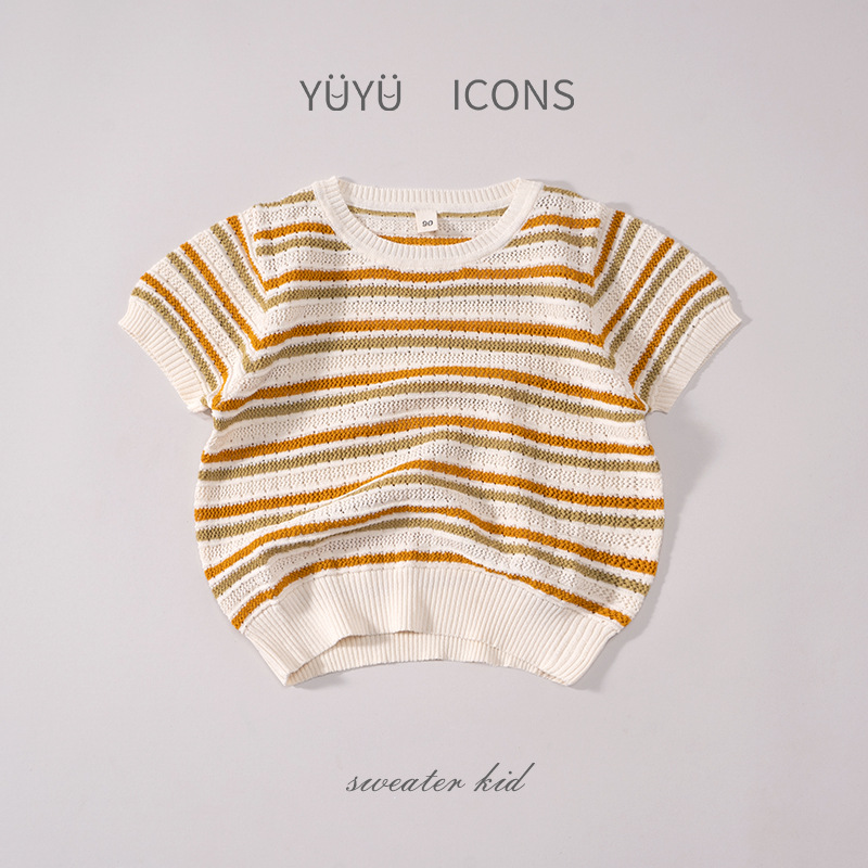 2025 봄과 여름 새로운 얇은 소녀 할로우 올 매치 티셔츠 어린이 대비 컬러 스트라이프 반팔 스웨터 탑스토어 가기