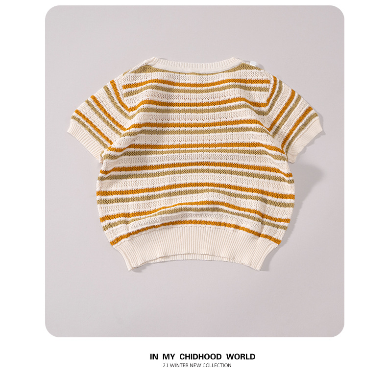 2025 봄과 여름 새로운 얇은 소녀 할로우 올 매치 티셔츠 어린이 대비 컬러 스트라이프 반팔 스웨터 탑