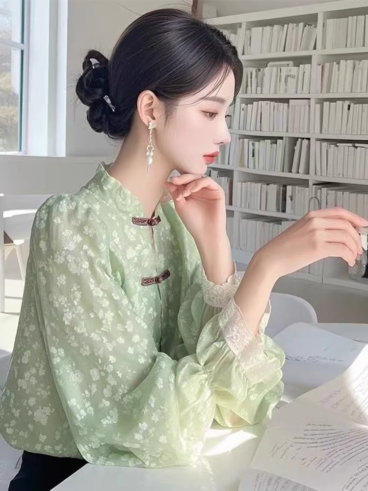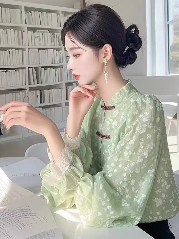 새로운 중국 스타일 우아한 버클 꽃 긴 소매 셔츠 여성의 2025 년 봄과 여름 새로운 슈퍼 잘 생긴 셔츠 A3536스토어 가기